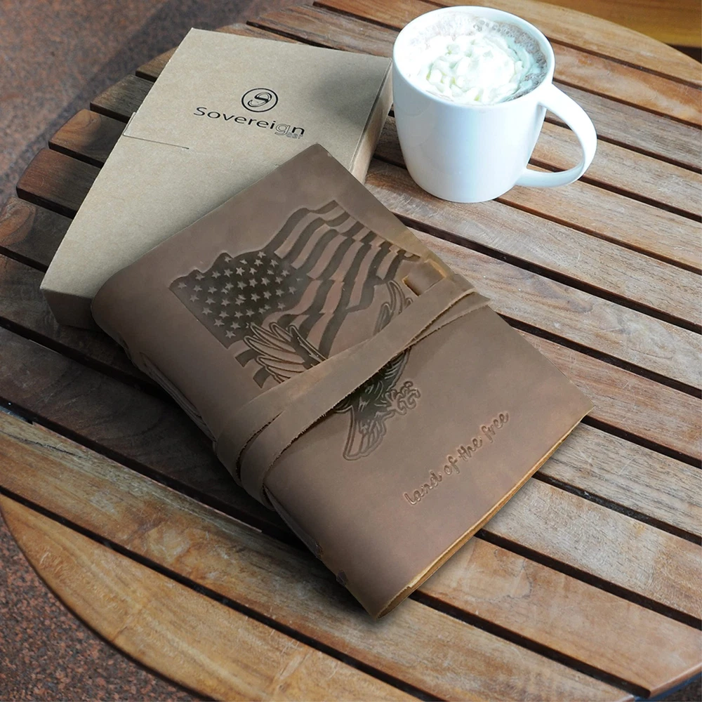 Sovereign Gear - Leather Journal with USA Flag and Eagle embossed is a vintage journal gift set made from brown crazy horse leather. A Leather Journal Gift Set Second to None This leather journal presentation set makes writing such a joy. When you open the eco-friendly box and see this antique leather travel notebook set, you'll be inspired to go on a world journey and write about your new adventures in faraway lands! This beautiful journal gift box makes a special keepsake and contains a unique handmade leather journal and a hidden pen-holder that holds the included pen, so you're ready to record your latest finds or thoughts. There's also a stylish bookmark to keep your place in your journal, novel or magazine. The lovely soft crazy horse leather is carefully sourced and checked by hand to ensure your leather-bound journal looks the best. In addition, it is coated with special natural oils, which give unique qualities, making handling this leather notebook a wonderful experience. Beautifully Handcrafted This luxurious antique leather notebook is 100% handcrafted with care every step to ensure it's a leather journal to treasure for men, women, students, journalists or travelers of all ages. Each handmade journal is truly unique, so no two are the same. The crazy horse leather cover ages beautifully: when scratched, the markings look uniquely distressed - wipe, and the marks fade. The more you use it, the more rustic it looks. Timeless Gift This leather journal, pen and bookmark set makes a special gift for any celebration. This lovely leather journal is not refillable - it offers a valuable, fun and collectible way to keep your ideas alive forever! Available in two sizes: 7" x 5" and 8" x 6". UNIQUE GIFT SET: Handmade leather journal with beautiful USA flag and Eagle embossed front soft cover with matching bookmark, designer pen and hidden pen holder. Presented in an eco-friendly recycled box. A timeless gift for that patriotic someone who loves to write. PREMIUM LEATHER: Crafted with delicate yet super tough buffalo leather, including a long strap that secures the journal firmly. Our genuine leather is thicker than competitors and offers lifetime durability with lasting softness. RUSTIC DESIGN: Achieves a unique and distressed look when scratched and features decorative stitching for added charm. Coated with special natural oils that make handling a joy. Plus, it has a wonderful authentic leather smell that inspires you to write daily. QUALITY CREAM PAPER: 300 premium unlined multipurpose sheets for notes, daily plans, sketches, inspiring ideas, memories and more. Zero bleed through with fountain pens. Not refillable. PERFECT SIZE: Designed with a choice of two sizes - 7x5" or 8x6" to suit a wide range of writing styles. We also offer many other sizes and styles of journals, including refillable journals. There's something for everyone!