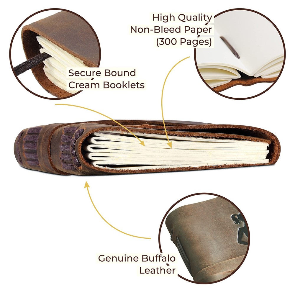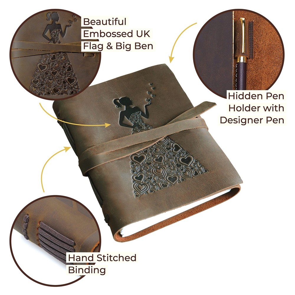 Leather Bound Journal for Women, Handmade Gift Set with Lady in Heart Dress Embossed Journal and Stylish Pen, Vintage and Classic, Notebook, Sketchbook, Planner and Diary (300 Pages) (8x6") ✓ Free 60 Day Returns ✓ Free Express Shipping Description: Features: UNIQUE GIFT SET: Handmade leather journal with beautiful Lady in Heart Dress embossed front soft cover with matching bookmark, designer pen and hidden pen holder. Presented in an eco-friendly recycled box. A timeless gift for that special someone who loves to write. PREMIUM LEATHER: Crafted with delicate yet super tough buffalo leather, including a long strap that secures the journal firmly. Our genuine leather is thicker than competitors and offers lifetime durability with lasting softness. RUSTIC DESIGN: Achieves a unique and distressed look when scratched and features decorative stitching for added charm. Coated with special natural oils that make handling a joy. Plus, it has a wonderful authentic leather smell that inspires you to write daily. QUALITY CREAM PAPER: 300 premium unlined multipurpose sheets for notes, daily plans, sketches, inspiring ideas, memories and more. Zero bleed through with fountain pens. Not refillable. PERFECT SIZE: 8x6" made to suit a wide range of writing styles. We also offer many other sizes and styles of journals, including refillable journals. There's something for everyone! Product Details: Brand: Sovereign-Gear Color: Antique Brown Theme: Book Sheet Size: 8x6 inches Pages: 300 Pages Cover Material: Leather Style: Lady in Heart Dress Ruling Type: Plain Special Feature: Pen Holder Number of Items: 1 Manufacturer: Sovereign-Gear Brand: Sovereign-Gear Item Weight: 1.41 pounds Product Dimensions: 8.46 x 6.69 x 1.97 inches Item model number: SG-Dress-Journal-8x6 Is Discontinued By Manufacturer: No Color: Antique Brown Cover Material: Leather Material Type: Genuine Leather Number of Items: 1 Size: 8" x 6" Ruling: Plain Sheet Size: 8x6 inches Manufacturer Part Number: SG-LEJ-Dress Date First Available: July 18, 2019