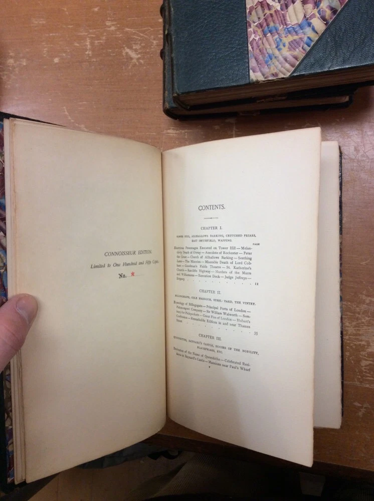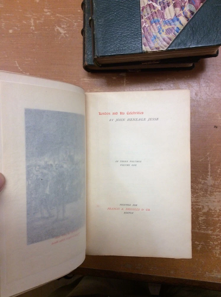 London and Its Celebrities by John Heneage Jesse. Printed for Francis A. Niccolls & Co. Boston. Limited to 150 editions with a star on limitation page. Connoisseur Edition. Some chipping to the edges of the binding, creasing to the spine, small pieces missing. No markings to text. Illustrated editions. Rear free endpaper is torn out of Vol. II.