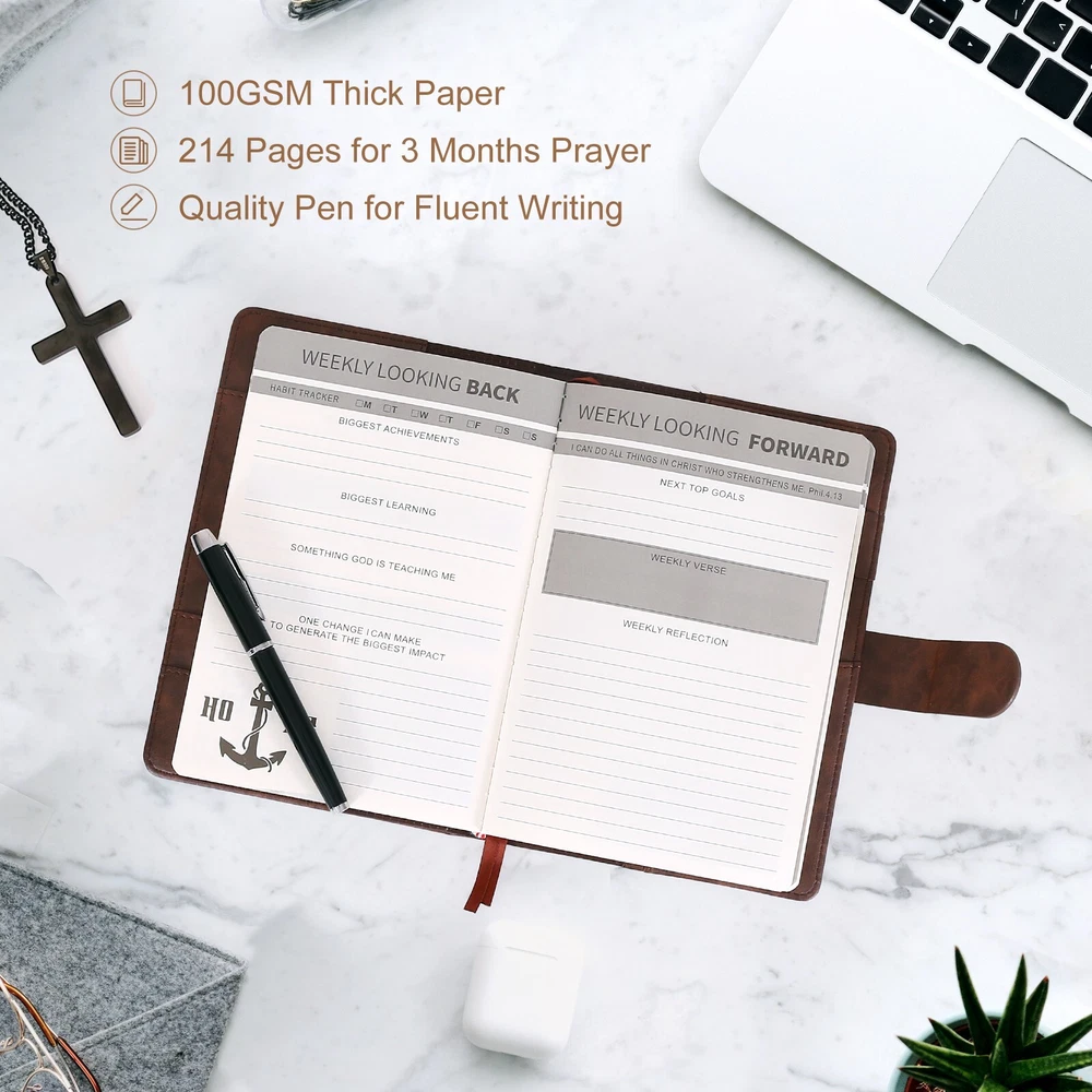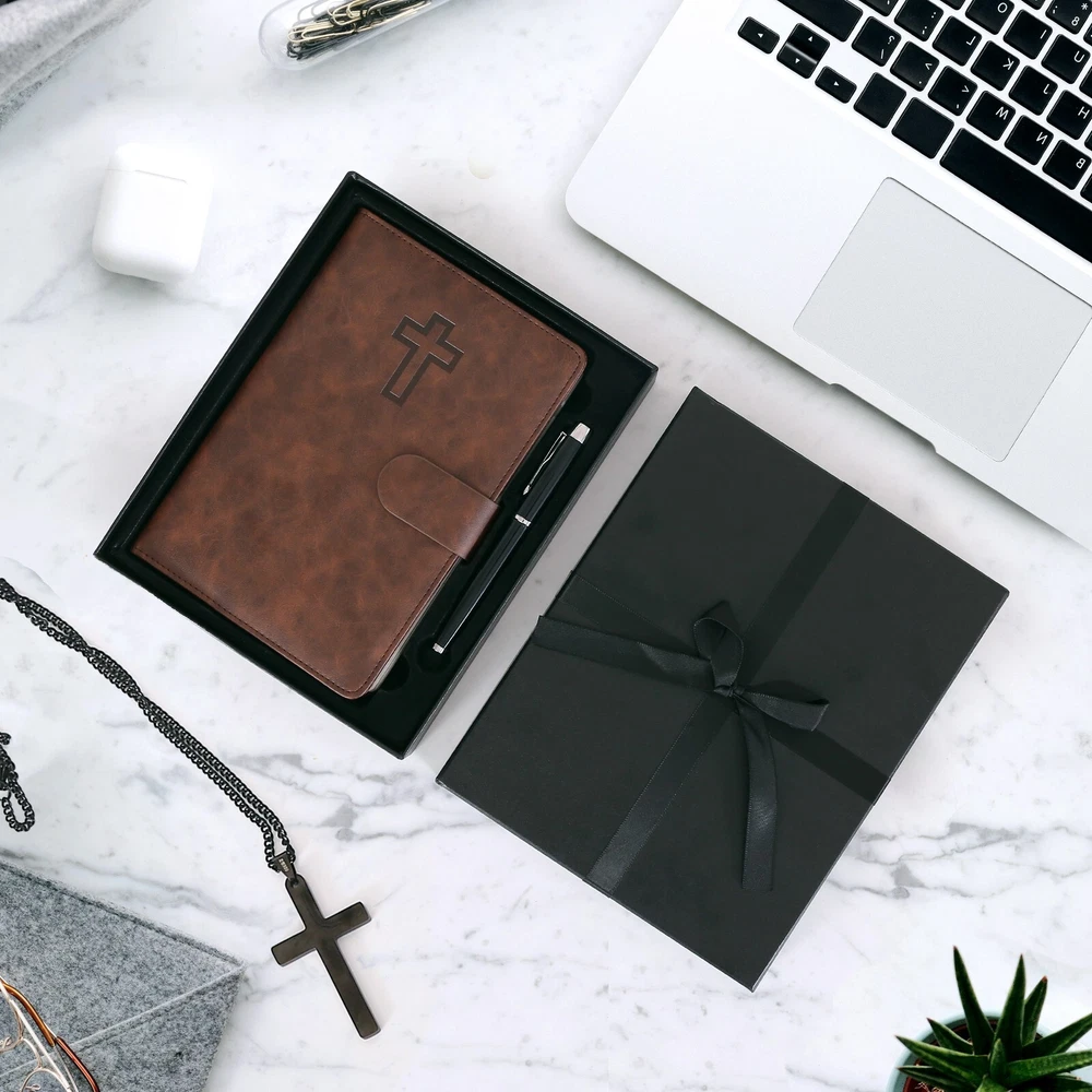Bible Prayer Journal For Men with Faux Leather, Bible Study Scripture Notebook & Christian Planner, Christian Gifts for Men, Devotional Journal and Church Notes IGNITE YOUR SPIRITUAL JOURNEY - Feeling stuck in your spiritual routine? Our Christian Motivational & Inspiration Journal revitalizes your faith with meaningful insights and wisdom. This isn't just a journal—it's your dialogue with God, guiding you to a deeper spiritual life and greater gratitude. BUILT FOR EVERYDAY FAITH - Whether it's sunny or rainy, our resistant vegan leather journal stands up to the test. Reflect the strength of your faith with a journal that is both resilient and portable, becoming a daily companion in your spiritual journey. A TREASURED GIFT - Picture the delight on their face when they receive this beautifully packaged journal! Presented in an elegant black box with a ribbon, it's more than a gift—it's a heartfelt invitation to connect with God. Ideal for Christmas, birthdays, or any occasion to show you care. YOUR SAFE HAVEN - Your spiritual reflections deserve the utmost privacy. Our journal features a secure magnetic closure to keep your thoughts and prayers confidential. Additionally, inner pockets help you organize and protect cherished keepsakes and mementos. WRITING MADE EASY - Perfectly sized at 8.5" L x 5.5" W, our journal offers a comfortable writing experience. With 214 pages filled with inspirational prompts and Biblical verses, it provides ample space for capturing your spiritual journey and reflections. Search Term: Bile journal,prayer journal, bible study notebook, christan journal planner,christian gifts, bible journaling kit, bible journaling supplies,church notebook, devotional journal,pastor gifts for men, christian journal