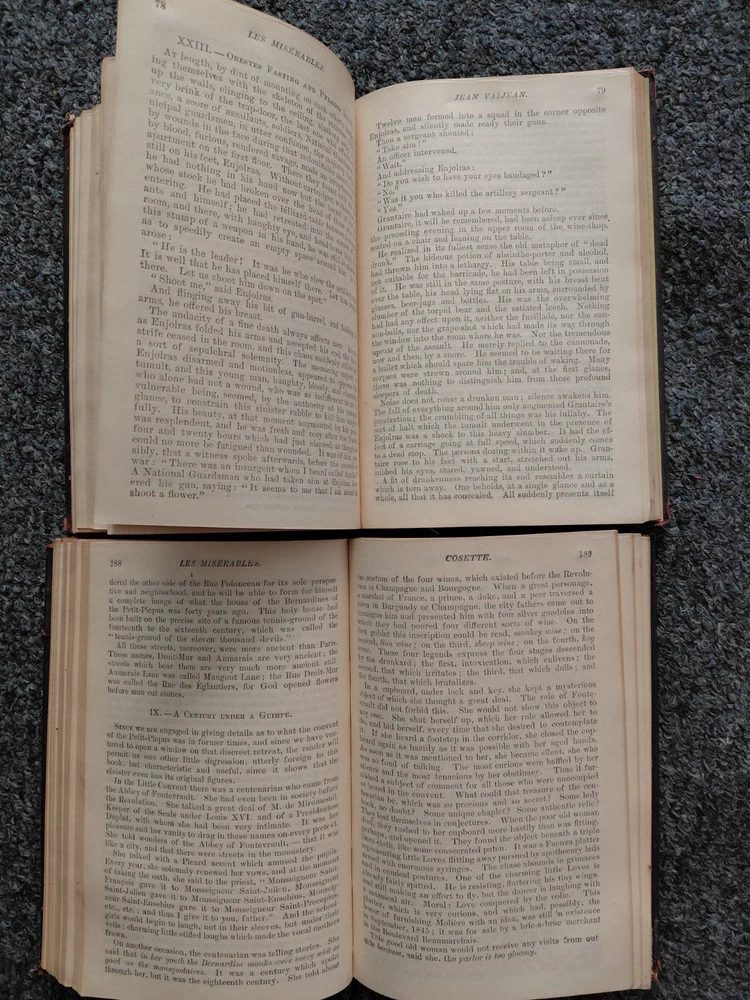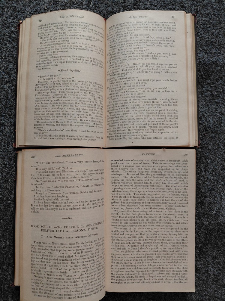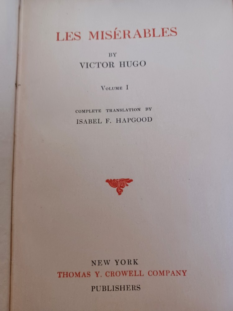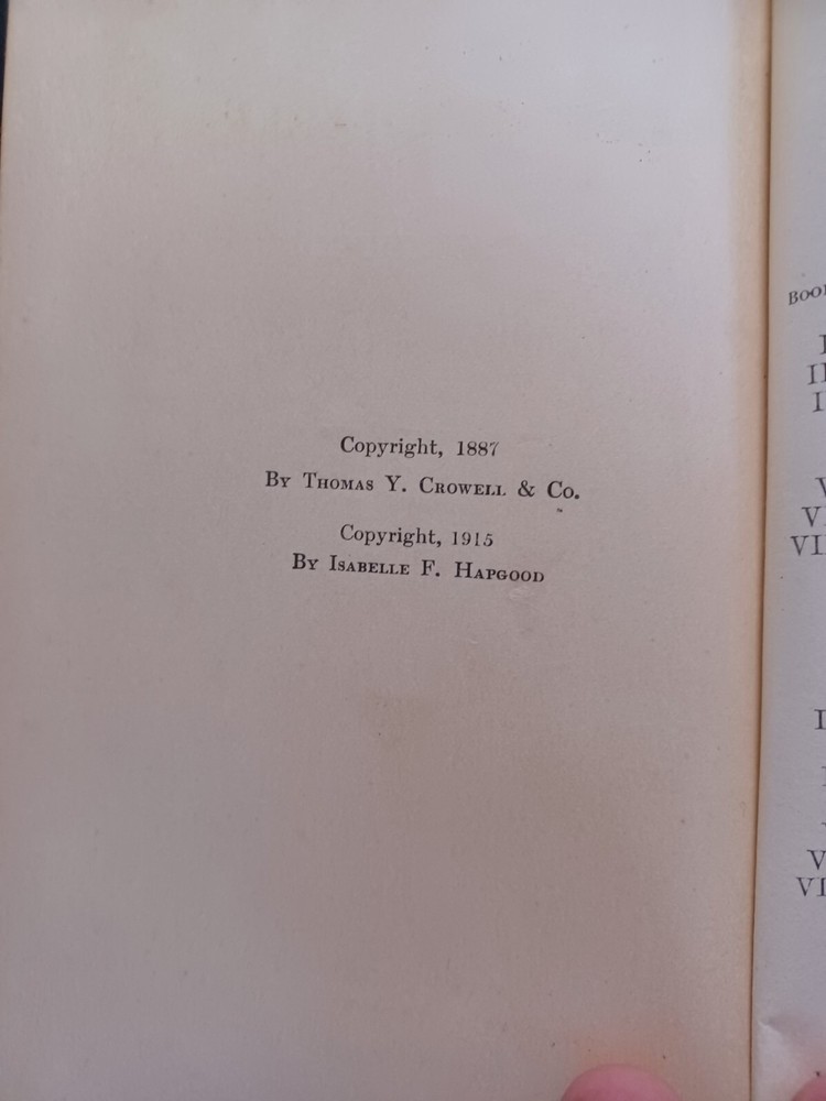 Published by Thomas Y. Crowell Publishing Company and Translated by Isabel Hapgood in 1915. 2 Volume Set. The top pages and ornate design on the front cover and spine are gilded. The glassine over the illustrations at the front of the book is in great shape. The binding is coming loose on the inside cover of Vol.1. The cover is a beautiful deep Mauve color and what I believe is bonded leather. The covers do show heavy signs of age and some wear on the corners and ends, as well as some scuffs on the surface as shown. Please view all images carefully. You will receive the exact items shown.