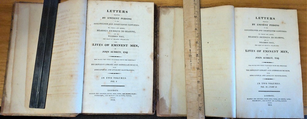 Aubrey, John - Letters Written by Eminent Parsons. 2 Volume Set. Volumes 1 & Volume 2, Part 2 Only! Please reference our Inventory # 335730 when inquiring about this item. Edition: Munday And Slater 1813 ISBN: leather_bound Collectible: Acceptable FAIR. Broken set, 2 of 3 total books including volume 1 and volume 2 part 2 only. Half Leather - spine and corners bound in leather, marbled boards, bagged for protection, extensive shelf and rub wear, large chips and heavy rubbings to boards, rubbed through corners, both volumes have detached front covers and flyleaves, both of the books are otherwise still tightly bound, some ink and acid-wear stains to pages, pages are yellowing and heavy worn at edges, gilt top page edges, gilt work is soiled. Dried and cracked leather at hinges as spine, see photos. Literary Collections: Letters Letters, essays, literature, vintage, 1810's, 1813
