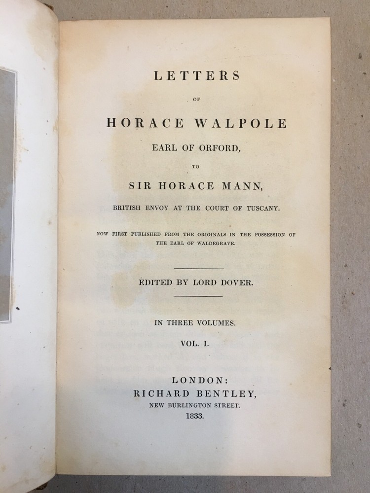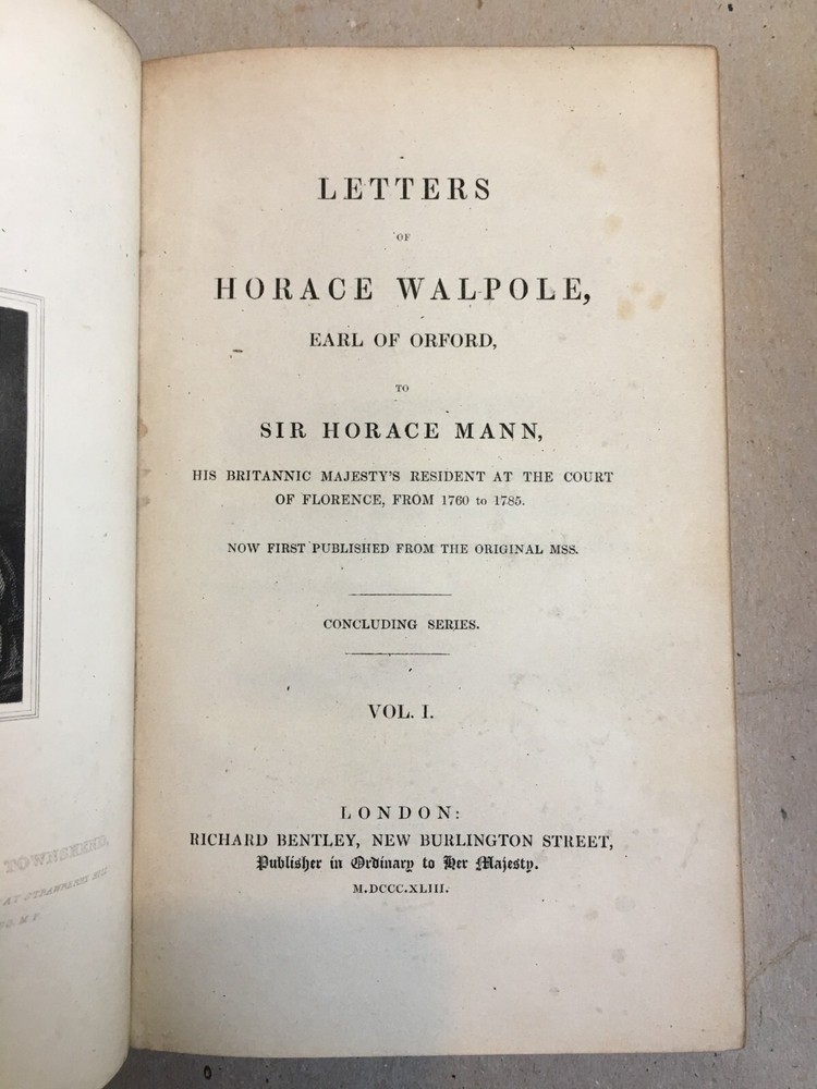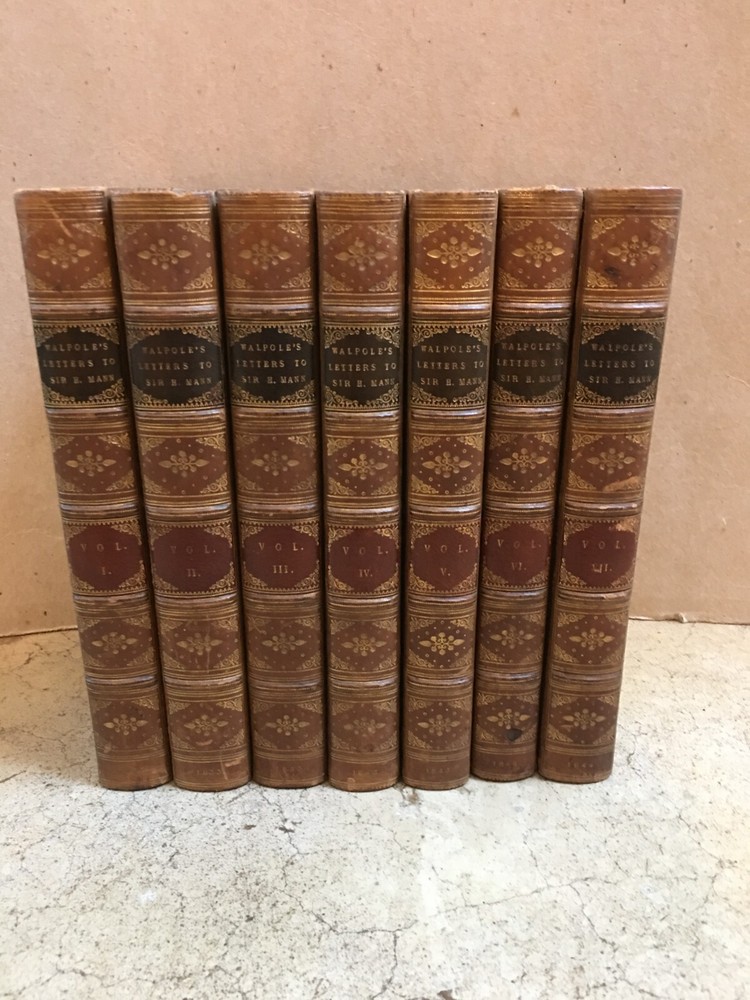 Hardbound in full leather w/ raised bands, decorative spines, and all edges gilt. Complete Set of 7 Volumes . London: Richard Bentley, 1833 (Vol. 1-3) & 1843-1844 (Vol. 4-7). "Letters of Horace Walpole, Early of Orford, to Sir Horace Mann" edited by Lord Dover. Minor shelfwear and soiling to boards. Light foxing to endpages and minor age toning to pages. Otherwise in very good condition. Interiors clean and bindings sound. Previous owner's bookplates affixed to front pastedowns. RARE!