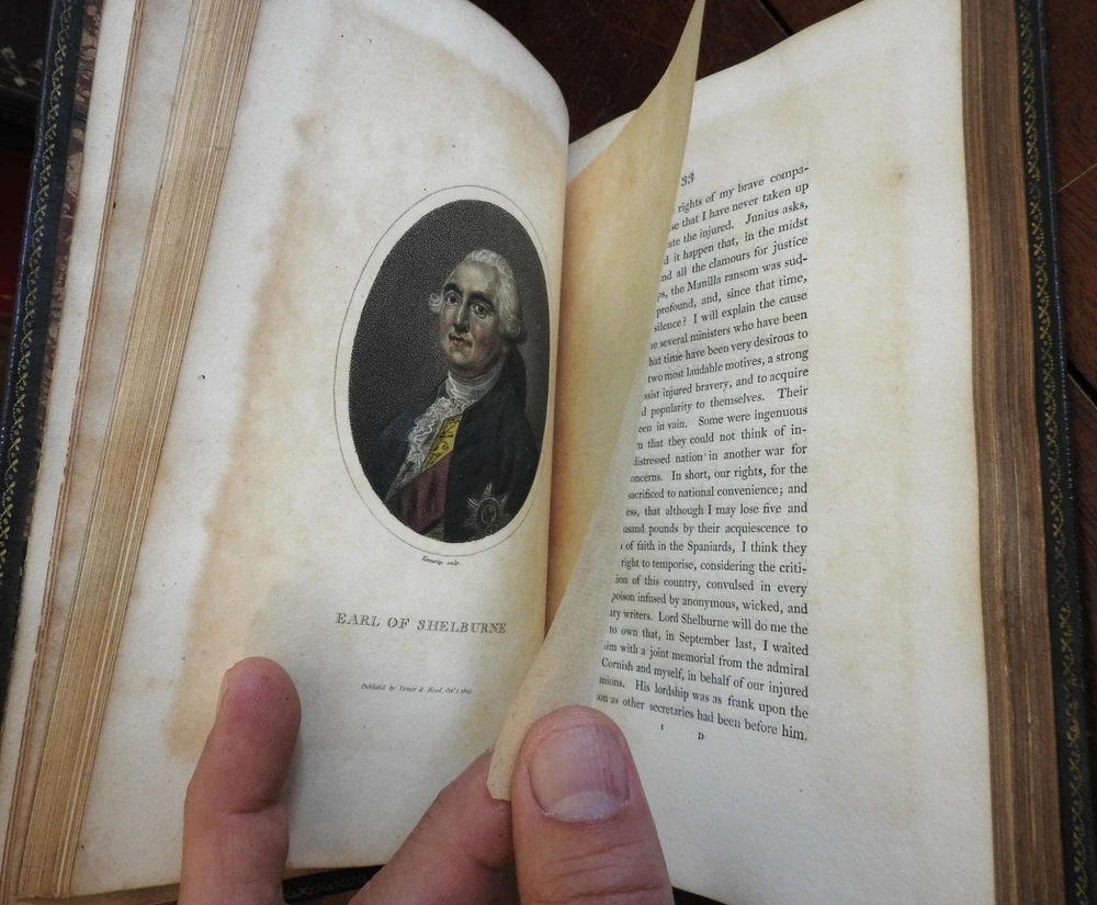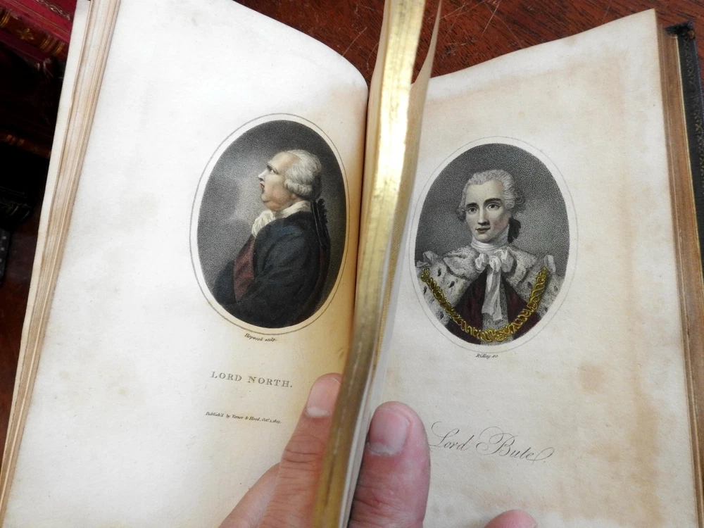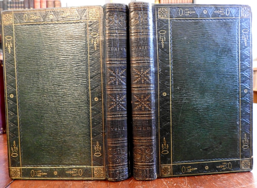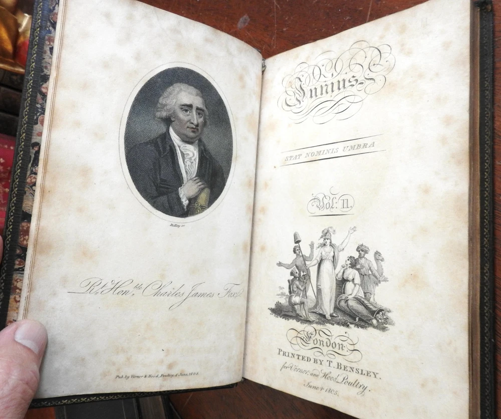 Letters of Junius British Politics 1805 w/ 21 aquatint portraits 2v leather set Letters of Junius British Politics 1805 w/ 21 aquatint portraits 2v leather set (Old Books, 19th Century Books, Leather Books, Decorative Book Bindings, Illustrated Books, British Politics). Click here to view a short video presentation. Short video captures condition much better than photos. Please watch prior to purchase to ensure a full understanding of the set. Junius. Published 1805, London by T. Bensley. 2 volumes. 252, 284 pages. Text in English. Profusely illustrated with 21 aquatint, hand colored portraits. Period full leather bindings, smooth spines, gilt bands, gilt compartment decorations & title lettering, all edges & turn ins gilt, marbled end papers. Item is physically old and shows some signs of handling and time. Item is not new or in "new" condition. Binding gently age worn, leather rubbed but still supple, joints slightly scuffed, remains overall attractive as an object. Text block paper is gently toned, light to moderate scattered age spotting, some of the plates lightly browned, internally still well preserved, tight, sound. Still attractive on the shelf. Book displays a pleasing and unique age patina and is in nice antiquarian condition, any age flaws easy to overlook or forgive. Please review photos for more detail and our best attempt to convey how this antique item survives. Book Measures c. 8 1/4" H x 5 1/4" W. [B2684].