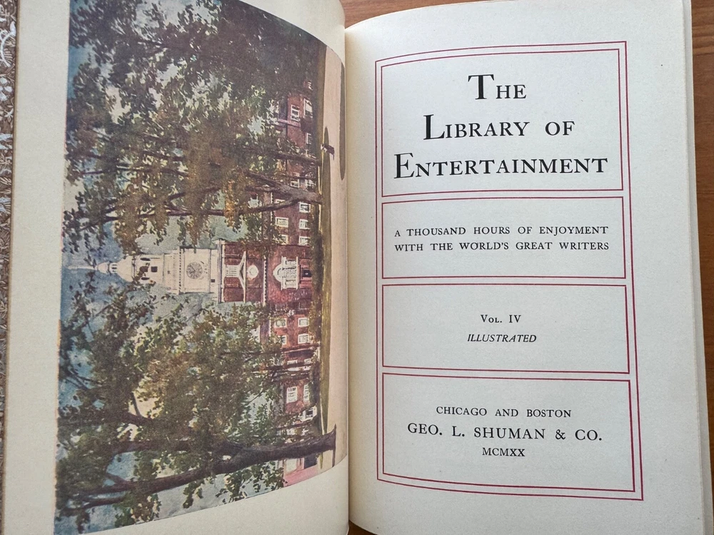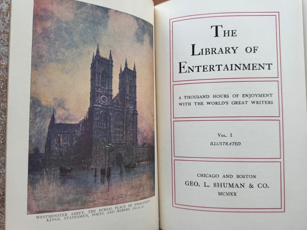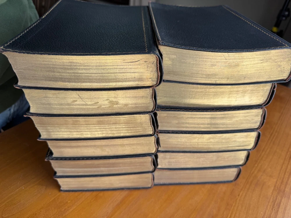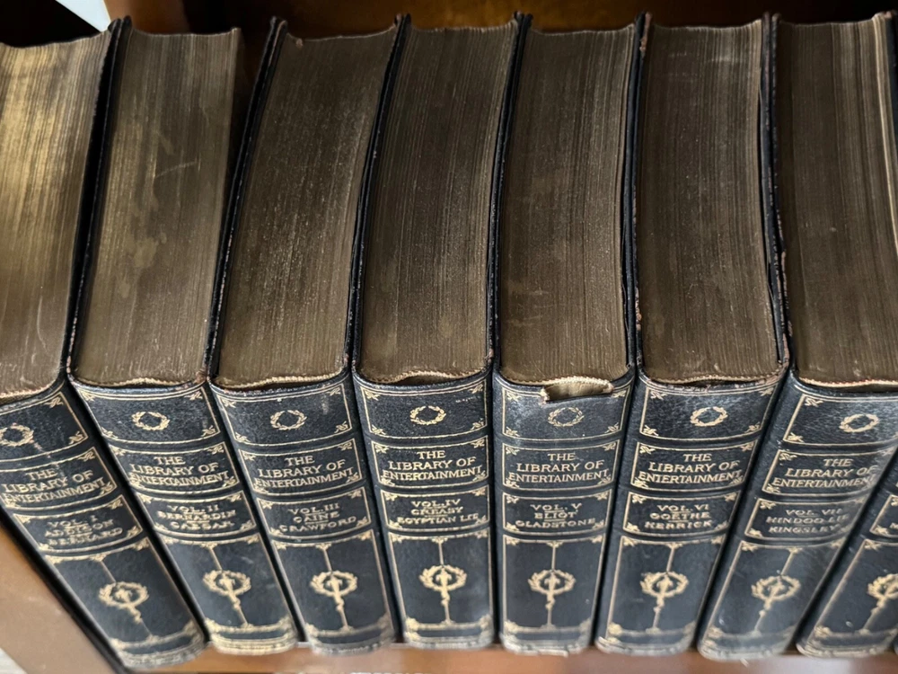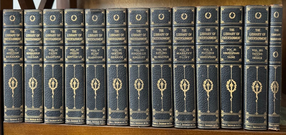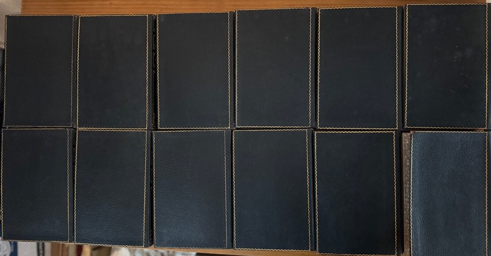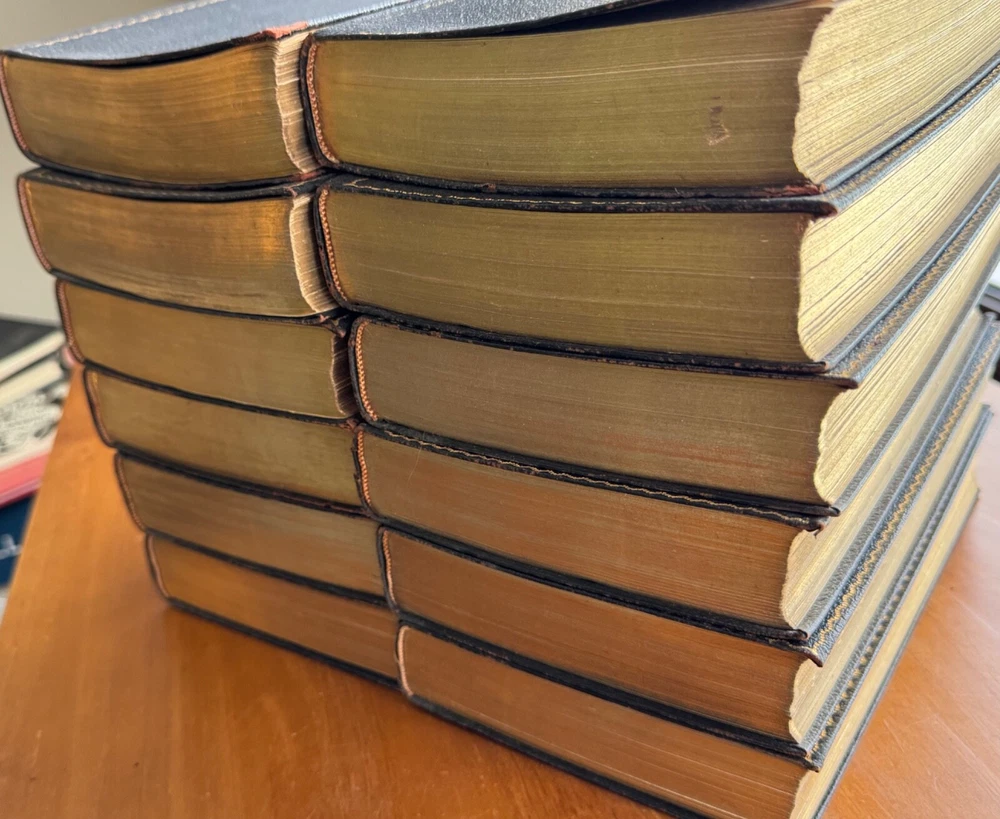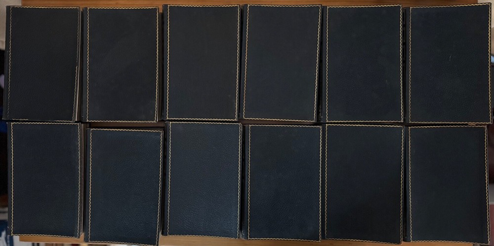 Condition is good plus to very good. Text and illustration quality is excellent, looks basically unread inside with no names, markings or plates. Bindings are strong but there is a slight curvature to some because these are softcover, they would probably easily flatten out. Light wear to exteriors and gilt, as shown, still very good. Vol. 5 small tear at top of spine as shown. Complete set of 12 with the handbook.
