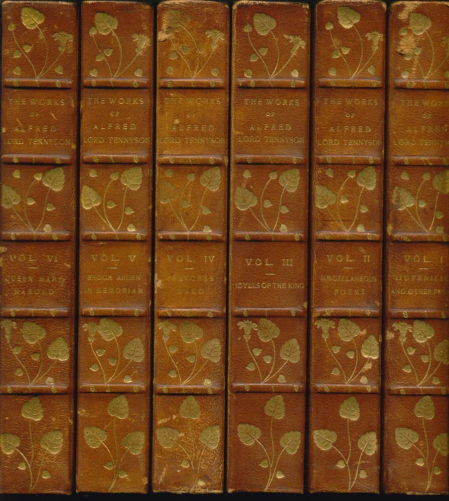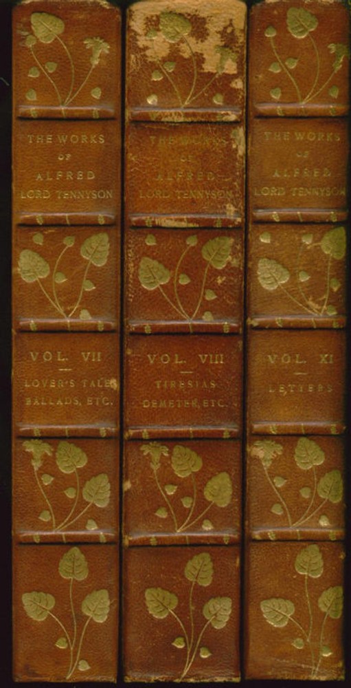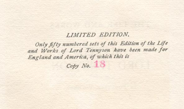 PUBLISHER: Croscup & Sterling Co - NY. London: MacMillan & Co DATE/EDITION: 1898, copyright 1893. Stated: Limited Edition. Only 50 numbered sets of this edition of the Life and Works of Lord Alfred Tennyson have been made for England and America, of which this is Copy N0. 18. BINDING: 14 volumes, complete. All bound in 3/4 brown leather with raised ribs on the spines as well as gold lettering and gold leaf decoration. Marbled boards and end papers and green ribbon markers attached to each volume. Top end pages are gilt. Each volume has an Eli Whitney Bookplate inside the front cover. DUST JACKET: None as issued. BOOK CONDITION: Vol VIII shows some scuffing at the top of the spine and vol X has a 1/8" tear at the top ear spine egde otherwise the set is in near fine condition with just the slightest bit of wear to the remaining volumes. The bindings are tight and the books are all very clean inside and out. DESCRIPTION: Frontispiece and several illustrations in each volume. The Eli Whitney Book Plate affixed inside each front cover was designed by W.F. Hopson and is dated 1903. SHIPPING: Actual cost by weight to your location, PA residents add 6% sales tax. All books are wrapped securely and shipped via media mail. I accept Paypal and will consolidate shipping on multiple items. (C38LR5/4036)