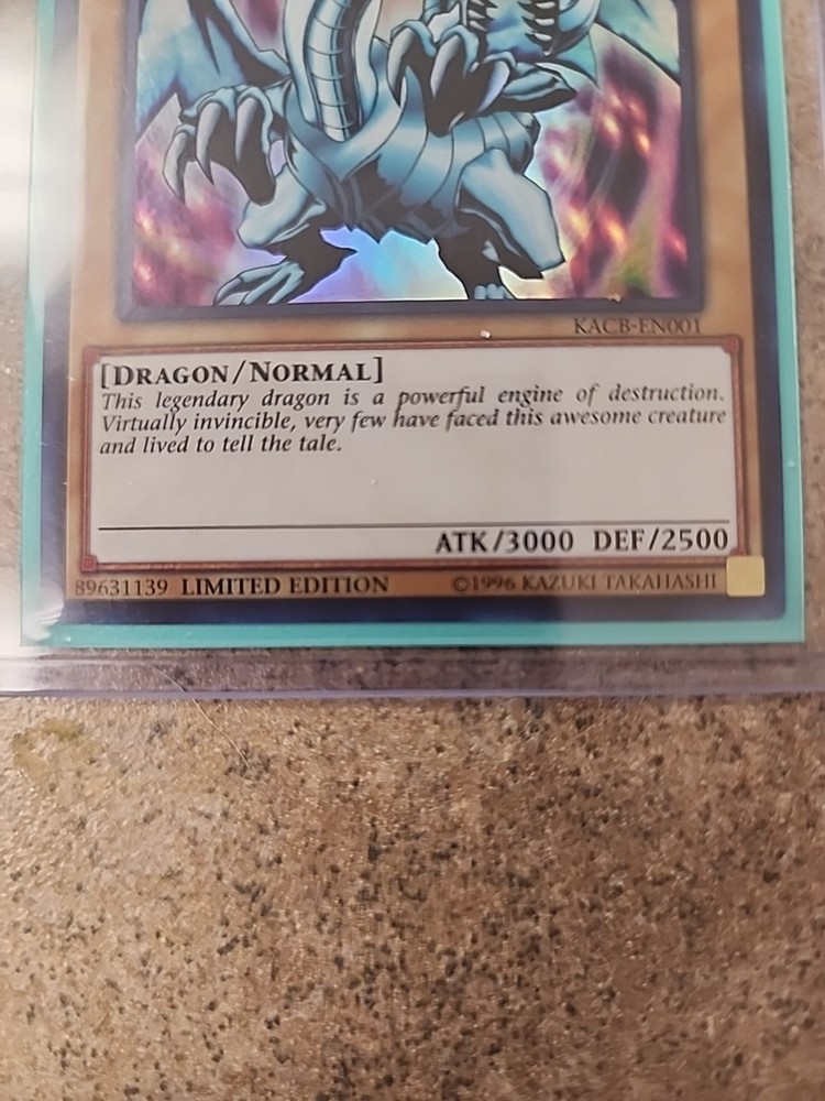 From what I am able to find, seems to be a Limited edition blue eyes, listed on the card it says '96 but I'm unable to tell if it's a reprint or an original as the pack it's from isn't specified to be from any specific year. It says limited edition from '96 so from my light research the price will reflect that. it is sleeved, and stored in a top loader and I will ship it in both.