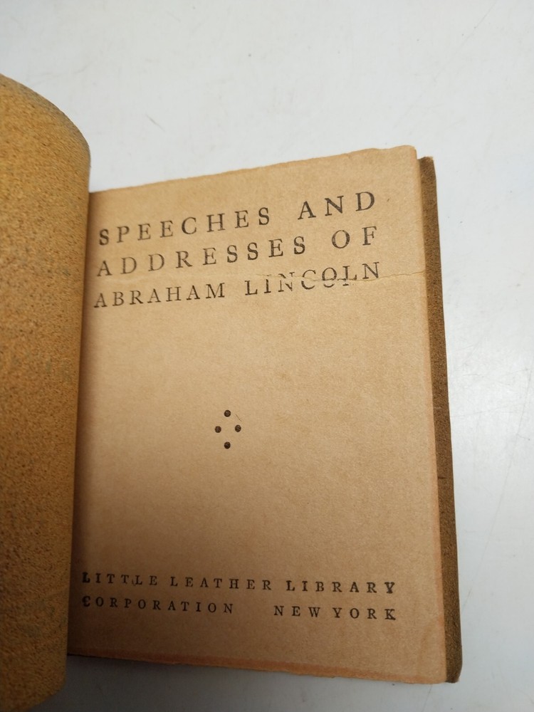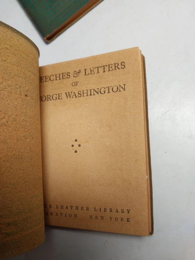Lincoln Washington Speeches Addresses Little Leather Library Miniature Book Set Book set measures approximately 3" x 4" and is in good used condition with some signs of age, use, and wear; age related toning to pages, tear to Lincoln title page, please see photographs for condition details.