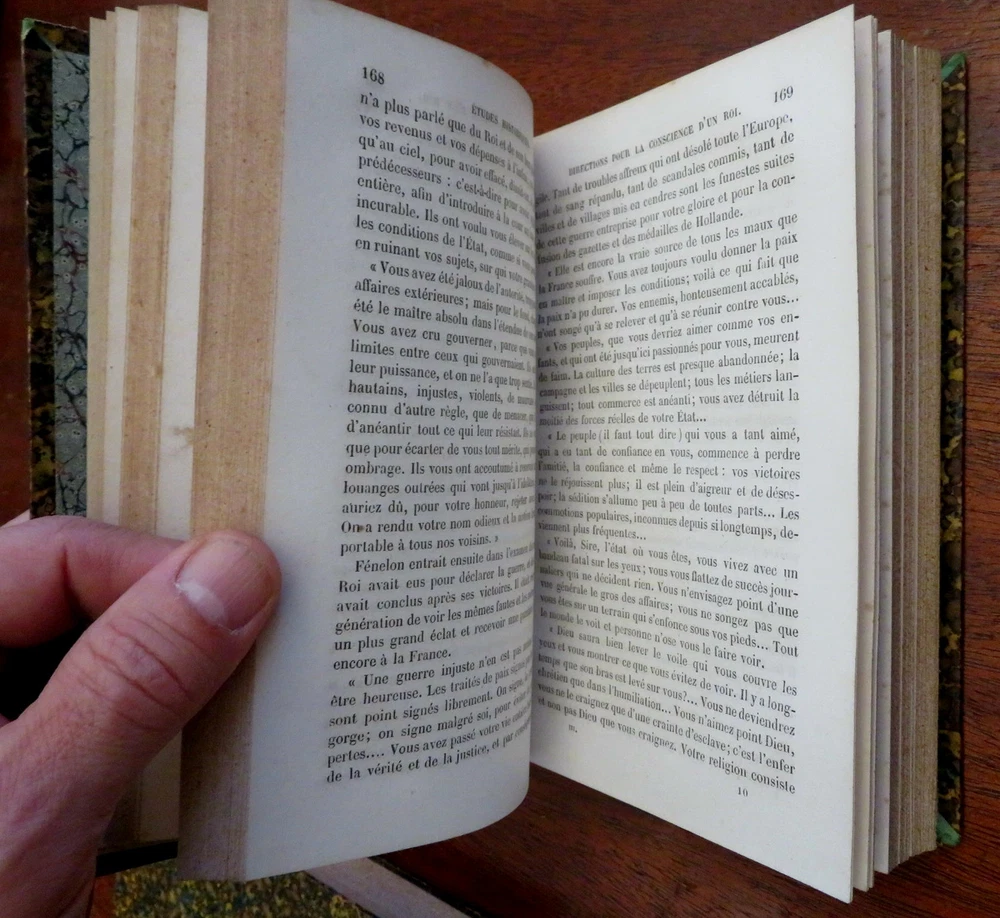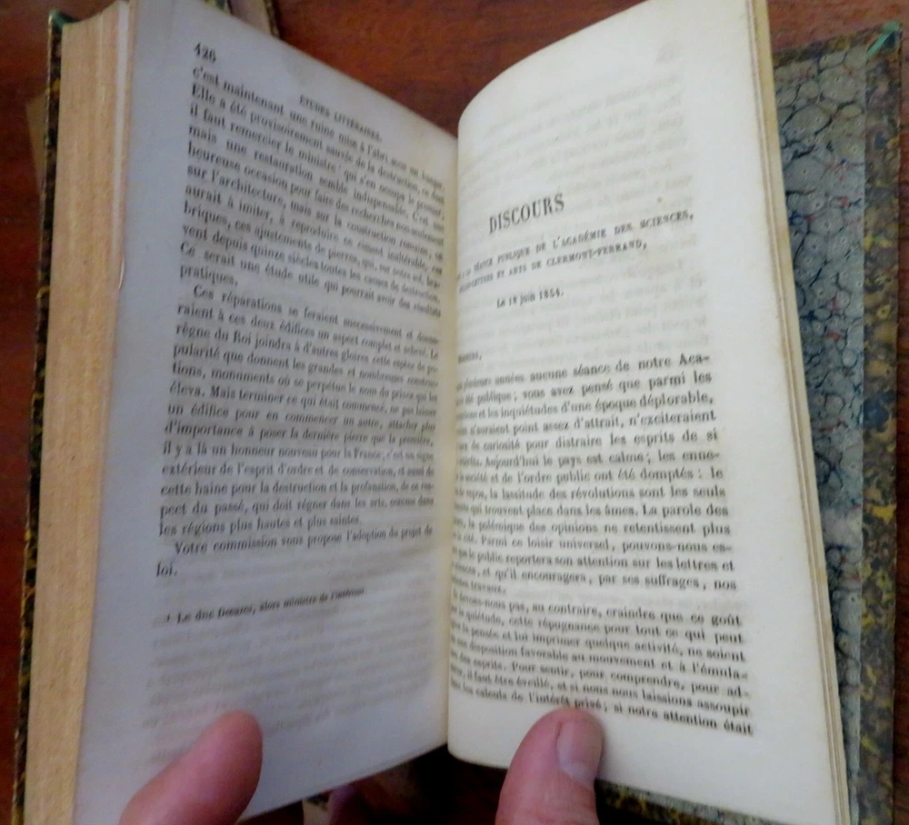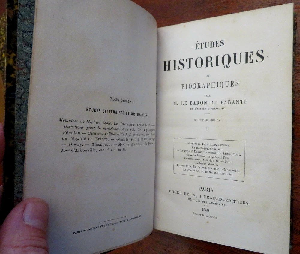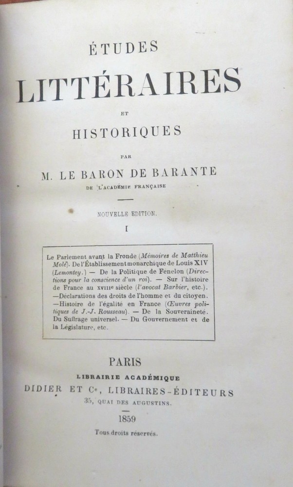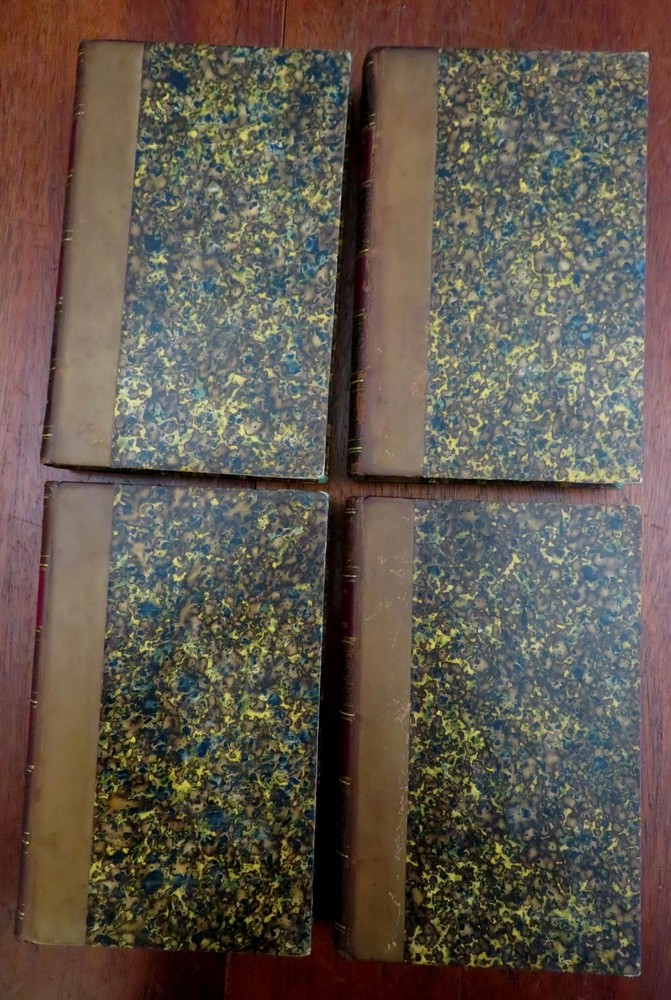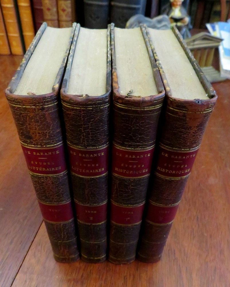 Literary & Historical Studies de Barante 1859 leather 4 vol. French set Literary & Historical Studies de Barante 1859 leather 4 vol. French set (Old Books, 19th Century Books, Leather Books, French Books, Literature, History.). Etudes Litteraires et Historiques, by de Barante. Published 1859, Paris by Didot et Cie. 4 volumes, each c. 425 pages. Text in French. Attractive antiquarian 1/4 leather binding, smooth spine, gilt bands, gilt title lettering on contrasting red leather labels, marbled covers & end papers. Set is physically old and shows some signs of handling and time. Set is not new or in "new" condition. Bindings age worn, spine leather is dried and crackled although still supple, mostly light minor signs of careful handling and time but nothing offensive or severe, set remains overall attractive on the shelf. Paper is gently toned, still clean, tight, sound internally. The set displays a pleasing and unique age patina and is in overall nice antiquarian condition, any age flaws which may be present appear to us easy to overlook or forgive. Please review photos for more detail showing how this set survives. The asking price reflects the condition based on our examination and 35+ years full time exposure to antiquarian books, maps and printed ephemera of all types and genres. Flaws seen and/ or described have been taken into account. Books Measure c. 7 1/4" H x 4 1/2" W. [B7386].