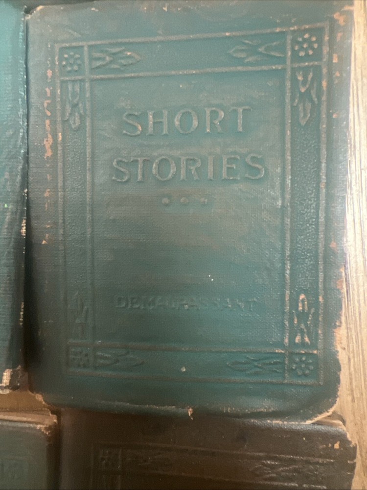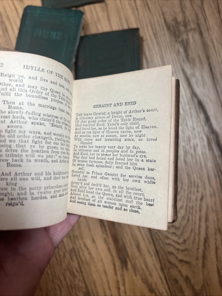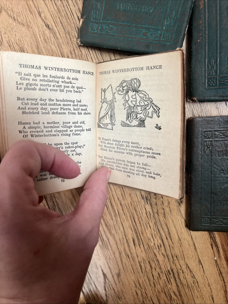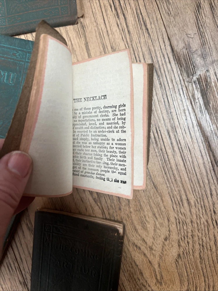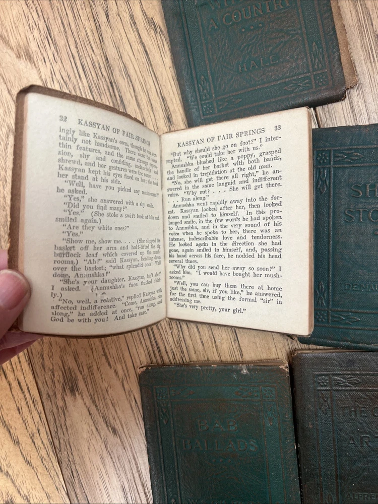 A set of four small leather-bound books with a matching cover, featuring classic literature from multiple authors. These vintage paperbacks are part of the Little Leather Library Corporation collection, illustrated and written in English. Each book is a miniature size, making them a unique and collectible addition to any book lover's collection.