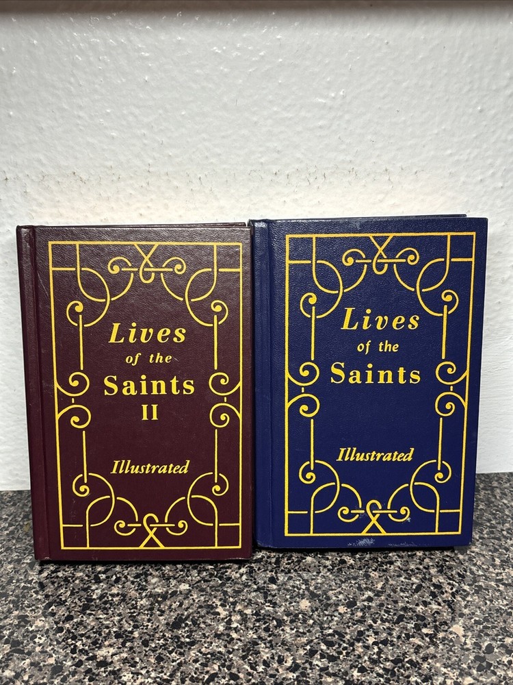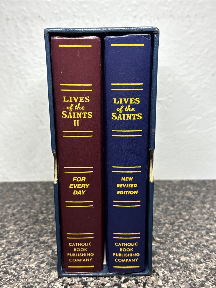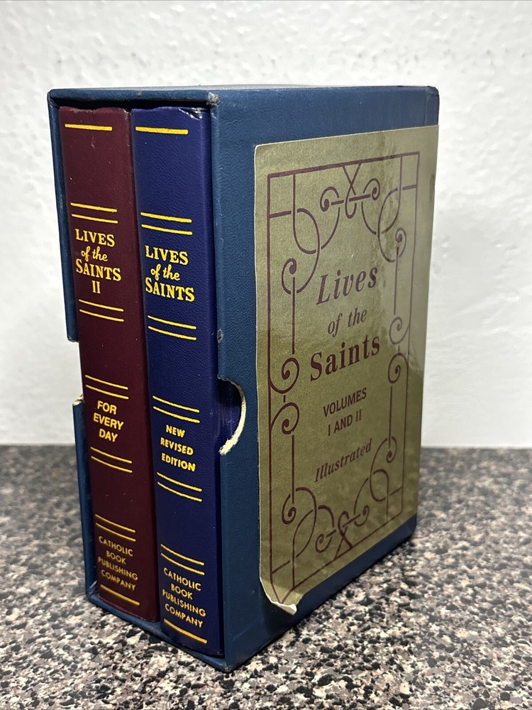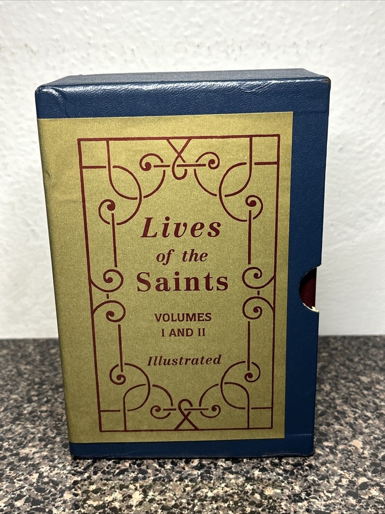 This boxed book set titled "Lives of the Saints" features volumes 1 and 2 illustrated by Rev. Hugo. The book is a nonfiction narrative type that focuses on the lives of the saints, making it a perfect audience for young adults and adults. The book is published by Catholic Book Publishing and is part of the Saints book series. The book is available in English, the original language, and has a vintage format published in 1992. The features of the book include a leather-bound copy that is illustrated with blue and red colors. The book is not personalized, inscribed, or signed, and it does not have an ex libris. This set is a great addition to any collection and is perfect for those interested in religious and spiritual genres.