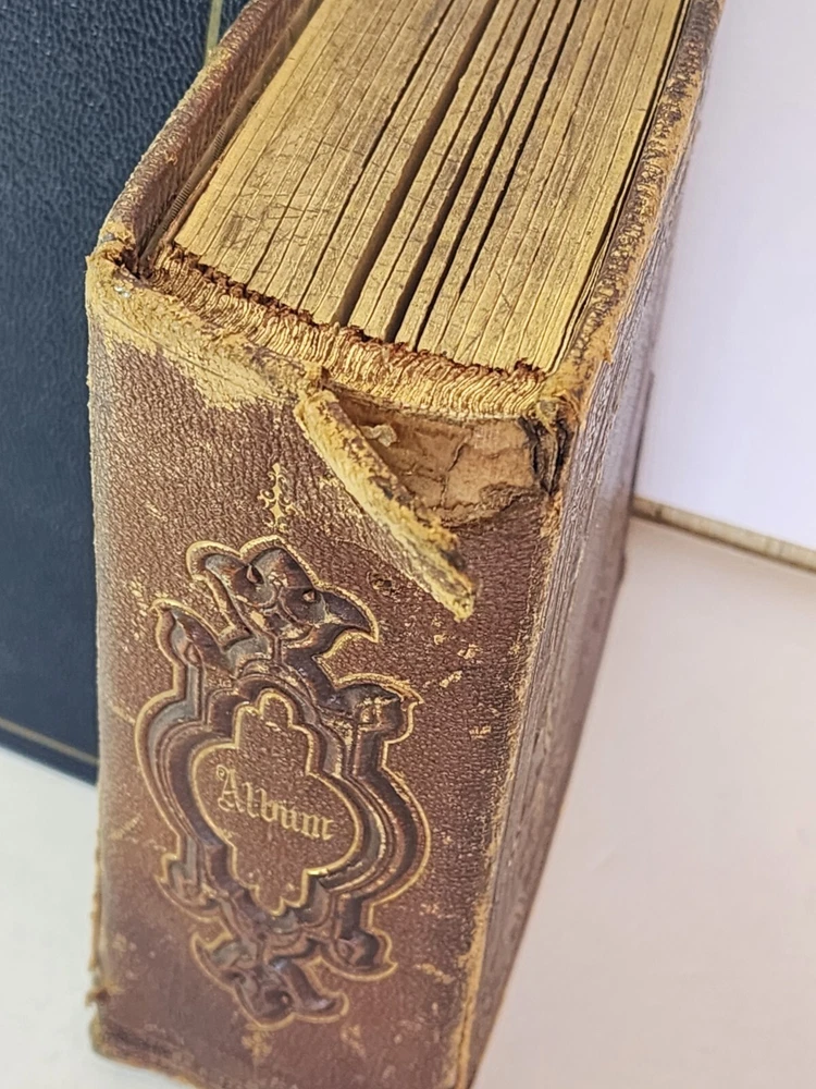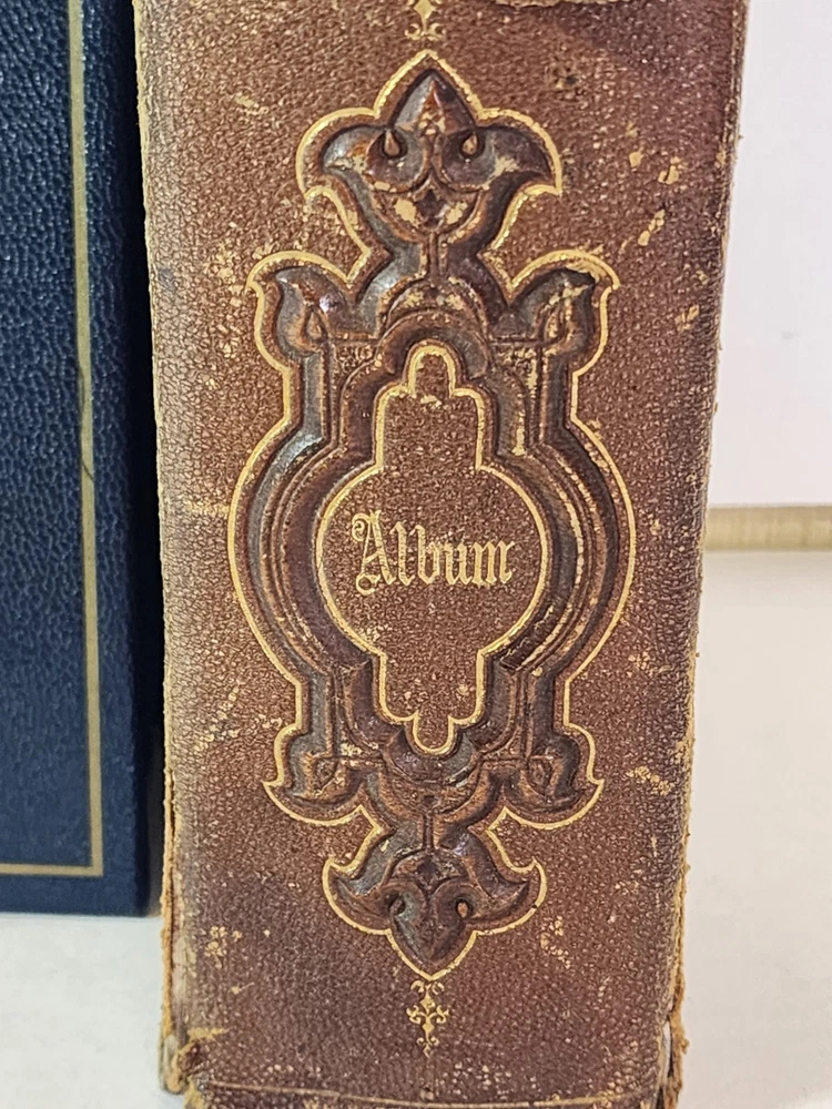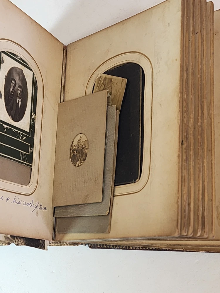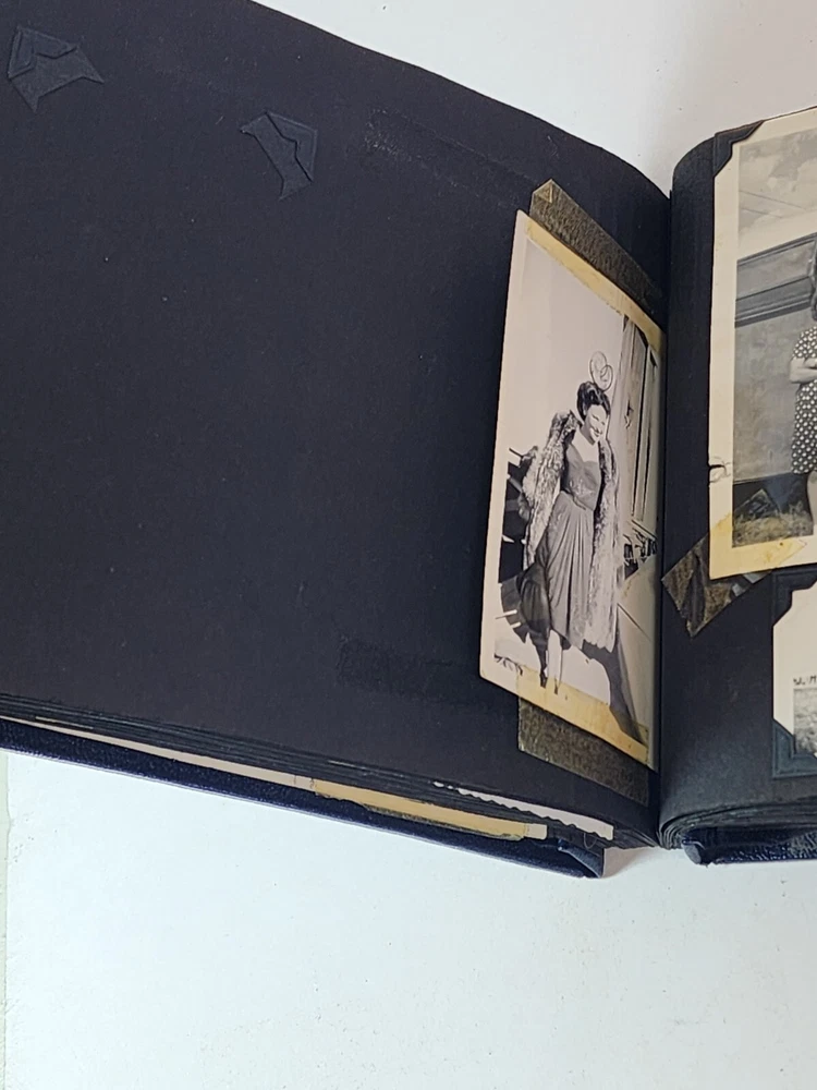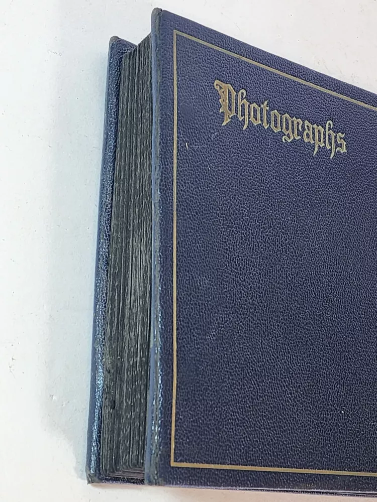 Introducing a charming vintage/ antique lot of two leather-bound photograph albums, adorned with brass. The albums are filled with an assortment of photographs and are sure to be treasured by collectors and enthusiasts alike. The albums are made of high-quality leather material that provides durability and a touch of elegance. The albums are an exceptional addition to any collection and a great conversation starter. The photographs in each album depict a range of subjects and are a testament to the era they represent. These albums are perfect for display and serve as a great reminder of the past.