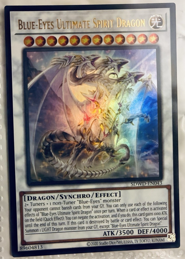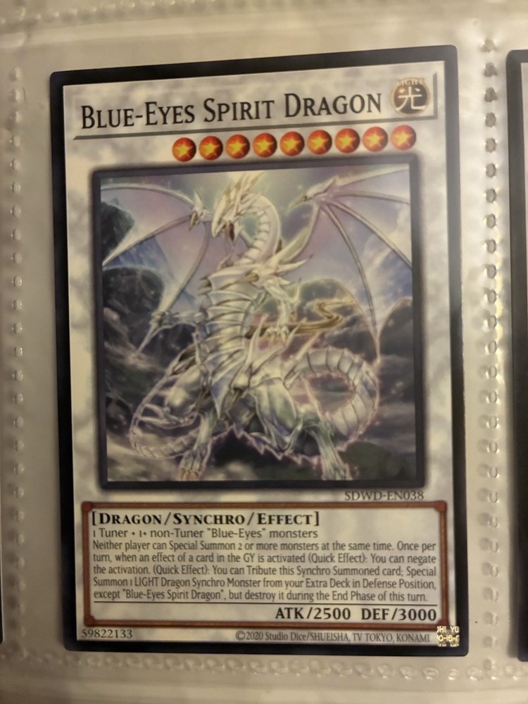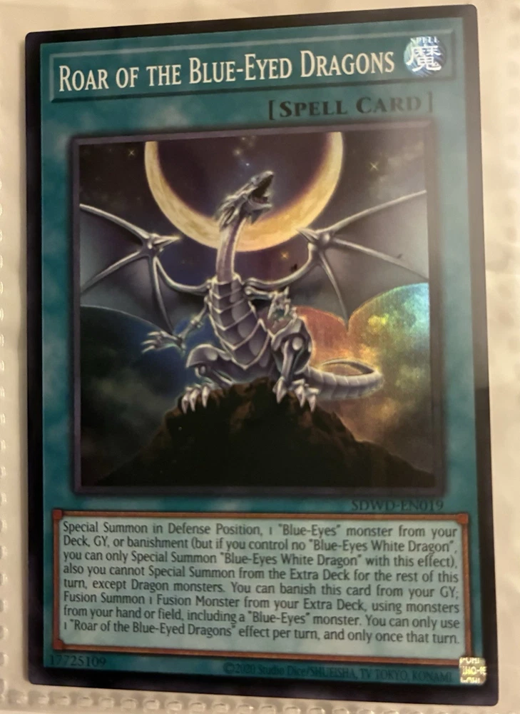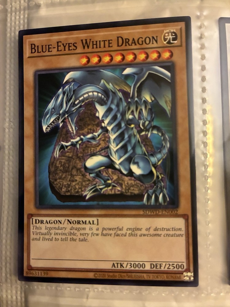 This lot of 6 Yugioh cards features cards of the popular character Blue Eyes White Dragon, along with 2 holo cards and 3 spell cards. The cards are standard size, made of card stock, and feature characters from the Yu-Gi-Oh! franchise. They are original cards manufactured in Japan by Konami, with English language text. These vintage cards are perfect for collectors and fans of the Yu-Gi-Oh! TV show, suitable for ages 6 and up.