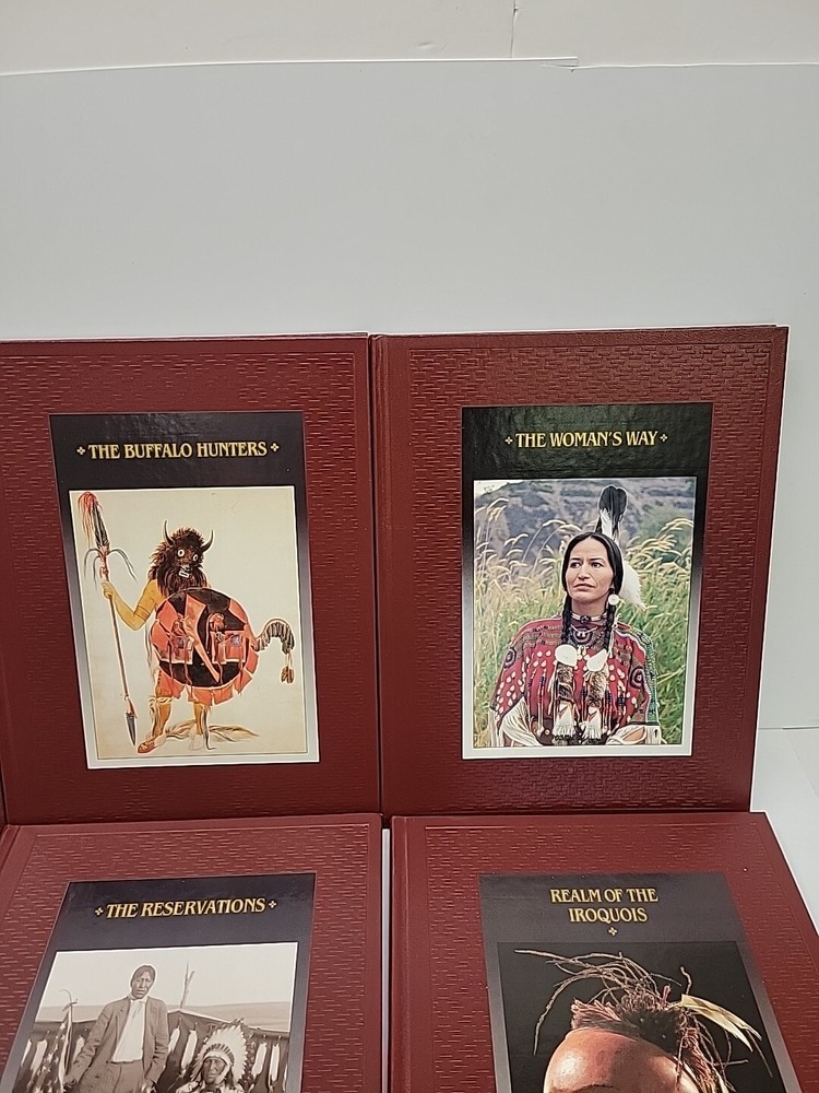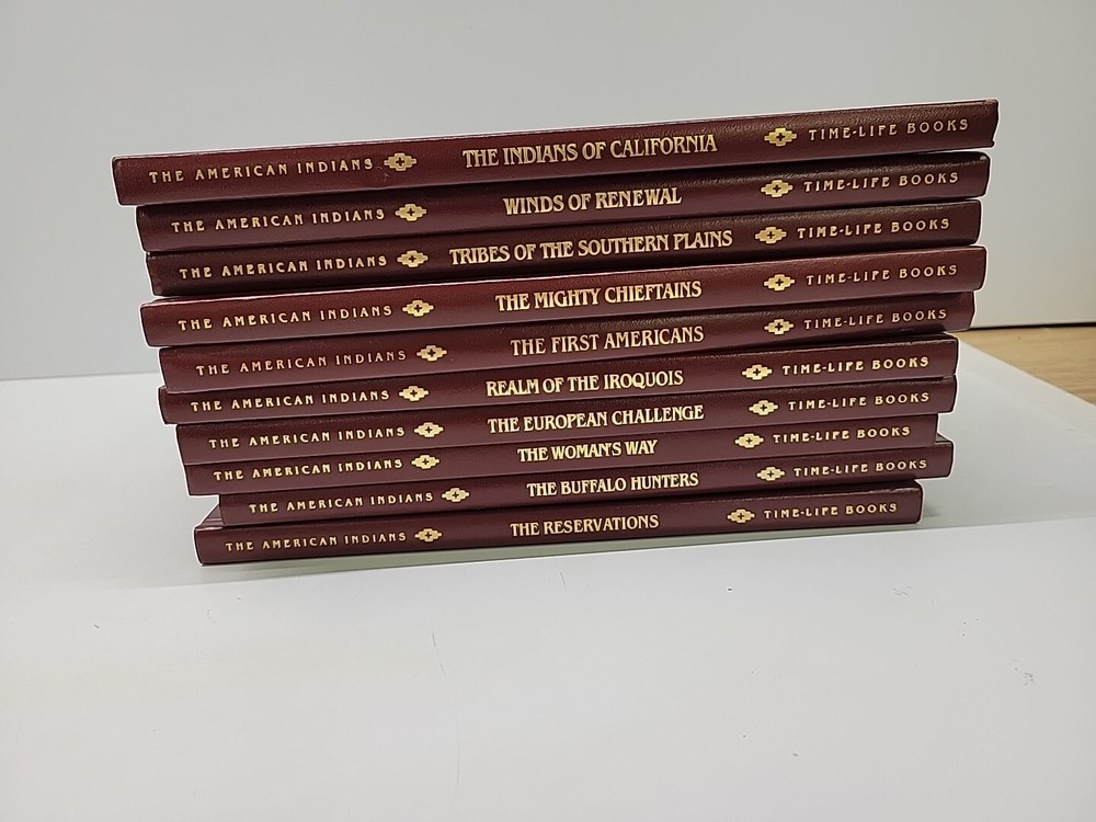 Dive into the rich tapestry of Native American culture with this comprehensive collection of 10 hardcover books from Time-Life Books' acclaimed "The American Indians" series. Each book is a portal to the past, offering in-depth exploration and stunning visuals that bring history to life. The set is a treasure trove for enthusiasts of all ages, from children to adults, particularly those with an interest in North American indigenous peoples and their heritage. Published in 1994, these books are presented in an elegant faux leather bound format, making them durable collectors' items as well as educational resources. The books are in really good condition. No ripped or torn pages. One book has a little bent corner edge(picture).
