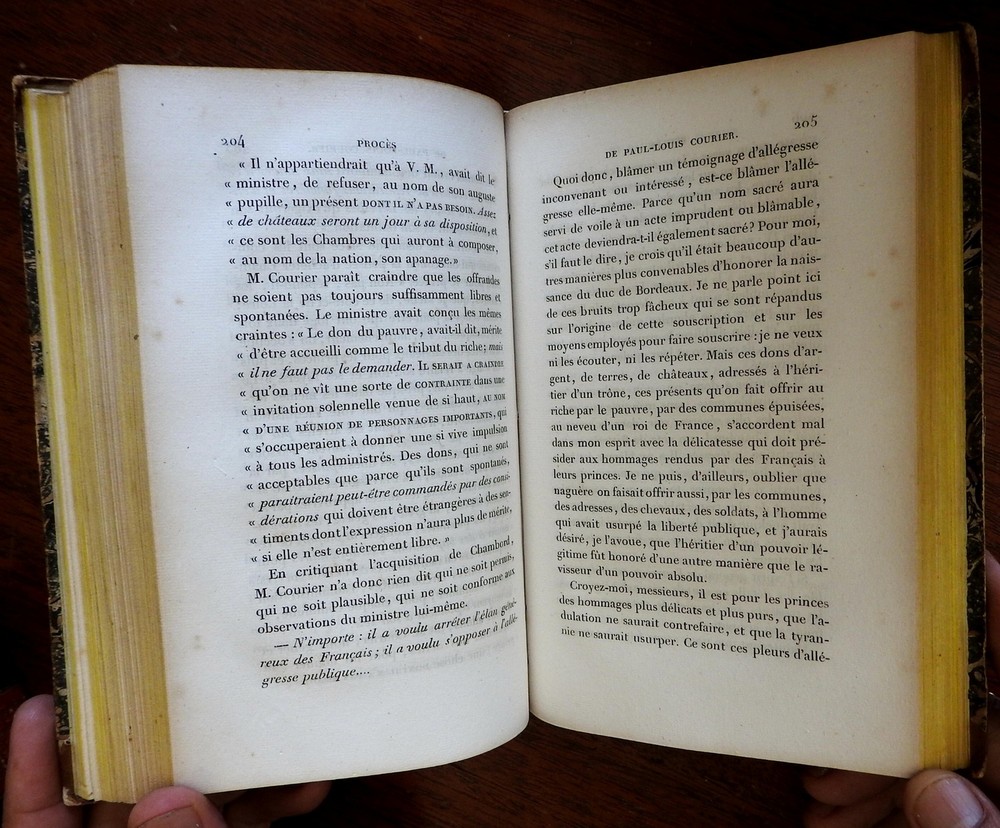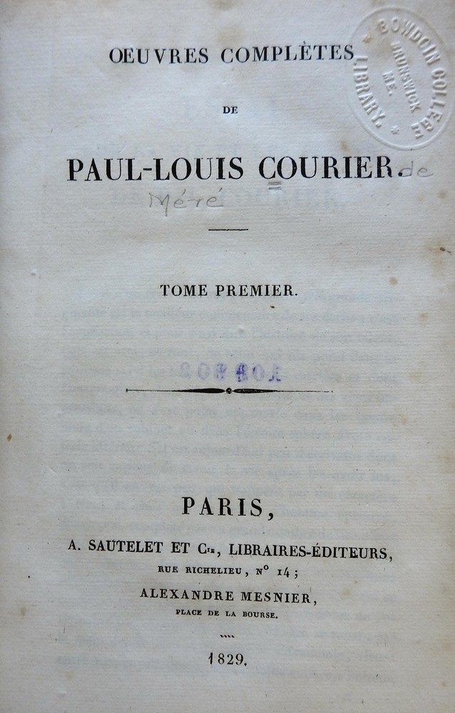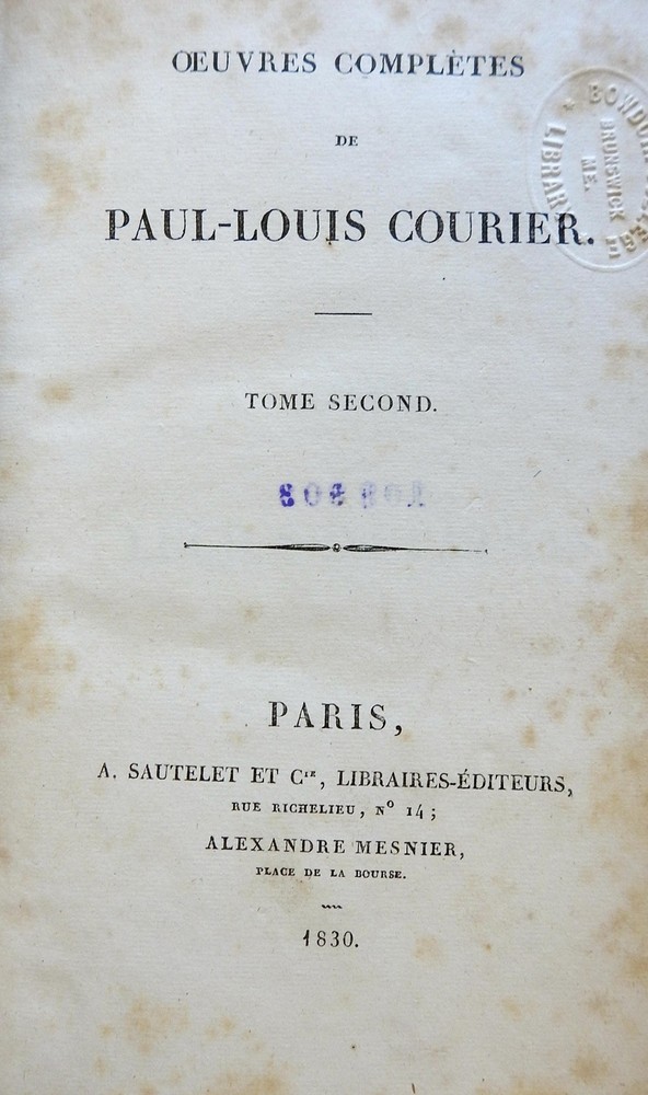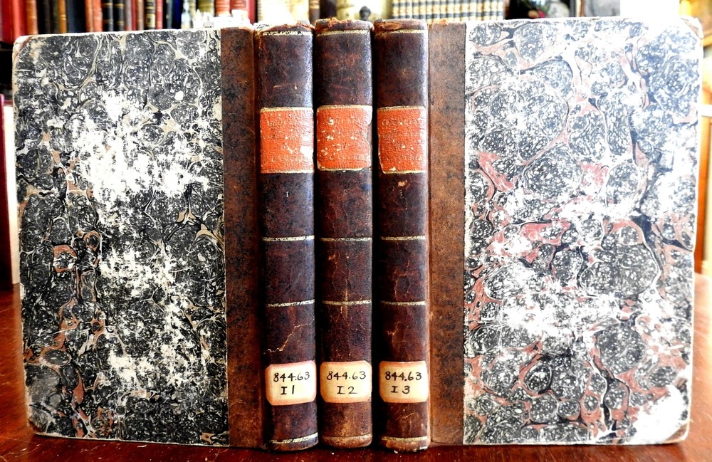 Louis Courier Complete Works 1829 rare French books 3 vol leather books set Louis Courier Complete Works 1829 rare French books 3 vol leather books set (Old Books, 19th Century Books, Leather Books, French Books, Louis Courier, French Lit). Oeuvres Completes de Paul Louis Courier. Published 1829, Paris by A. Sautelet et Cie. 3 Volumes 390, 431, 384 pages. Text in French. Scarce early 19th century European literary set. Period 1/4 French (likely Parisian) leather bindings, smooth spines gilt ruled into compartments, gilt title lettering on contrasting red leather label, marbled paper covers. Bindings remain clean, tight, and sound. Early paper library label on spine, withdrawn library bookplates to pastedowns. Set remains well preserved and attractive on the shelf. It displays a pleasing and unique age patina and is in nice antiquarian condition, the age flaws easy to overlook or forgive. Please review photos for more detail and our best attempt to convey how this antique item survives. Book Measures c. 8" H x 5 1/4" W. [B583].