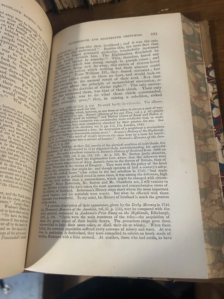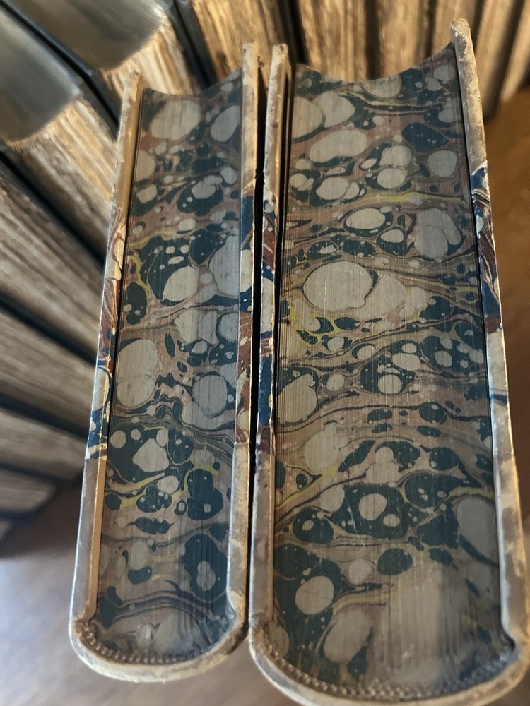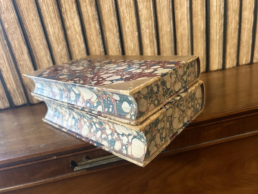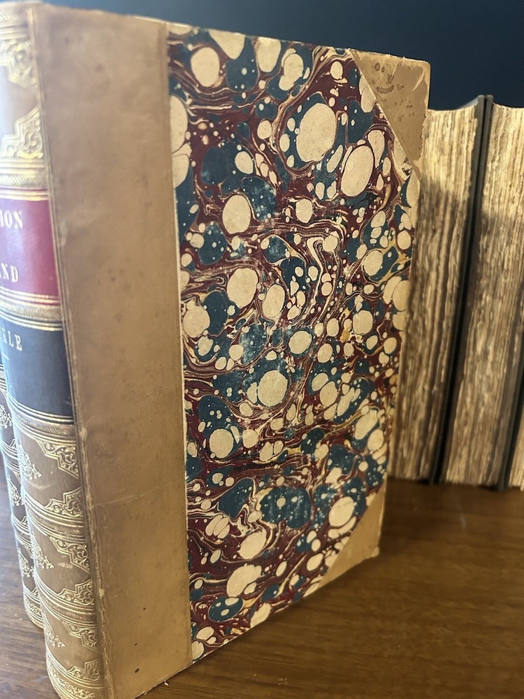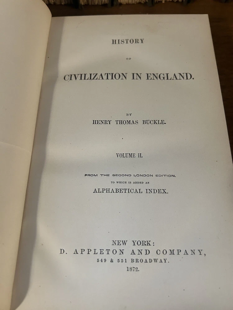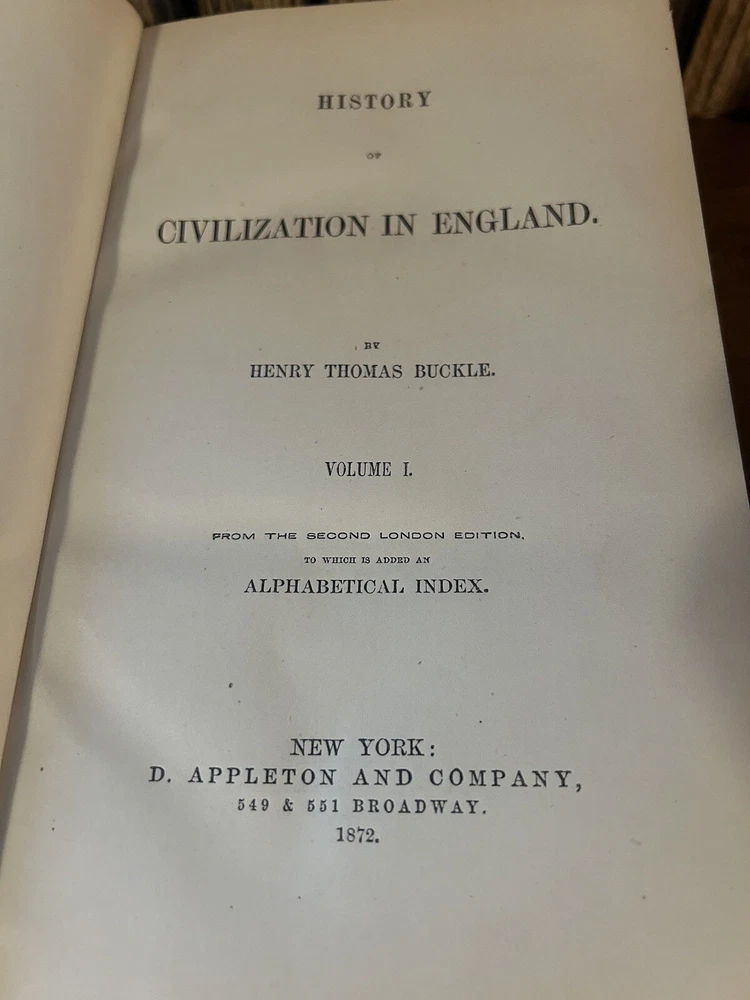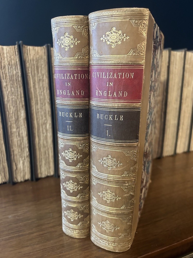 Luxury edition, Finely bound in half-leather, marbled boards. Five Raised spine bands, six compartments. Gilt titles, gilt decorated tooling. These volumes are gorgeous from every angle. Marbled endpapers, clean and tight contents. High-grade paper has very little tanning. Substantial to hold, pleasing to behold1872 History of Civilization In England by Henry T Buckle.