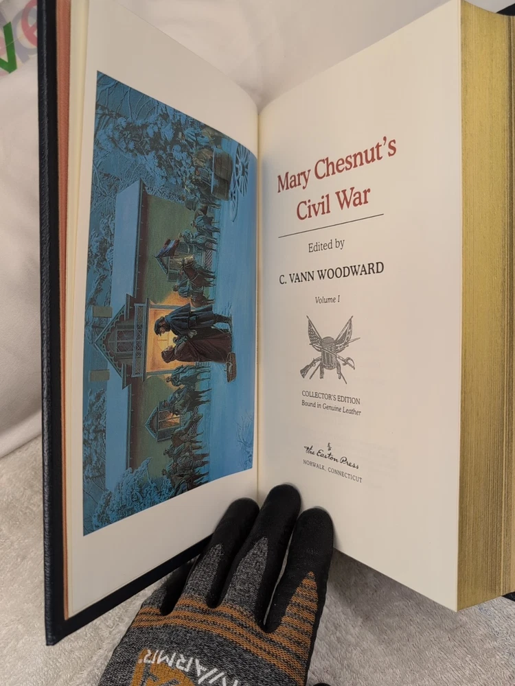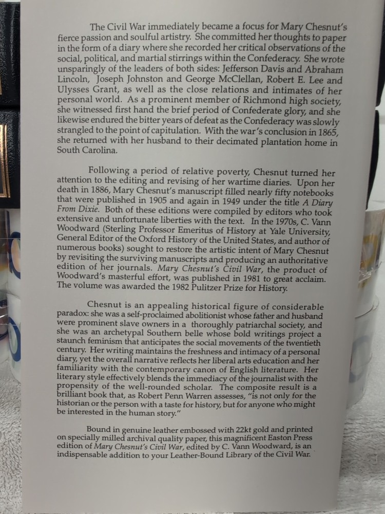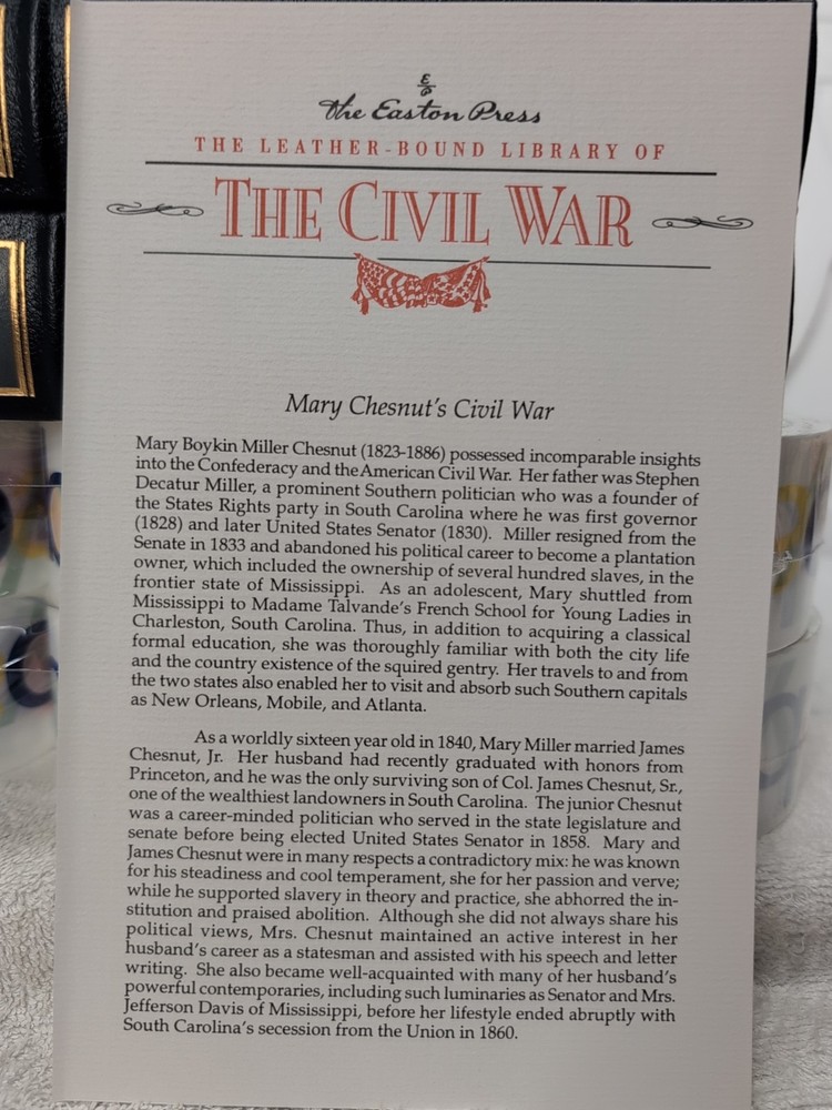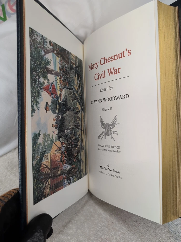 MARY CHESTNUT'S CIVIL WAR ~ Beautiful 2 Volume Set still in nice shape... 1998 Easton Press Special Collector's Edition ~ One page of Collector's Notes included, as issued... -An unused Easton Press Bookplate is already attached to both volumes front end-page ready for your signature! -Good or better solid condition. Binding and pages still tight, look never read or rarely opened. Volumes have only some minor shelf wear/scuffing to the boards and some minor blemishes to the gilt along the outside pages. Please see photos for further description... -No markings or writings inside from previous owner. From a non-smoking home no odors... FAST SHIPPING AND ALWAYS PACKAGED WITH CARE THANK YOU!!!!!