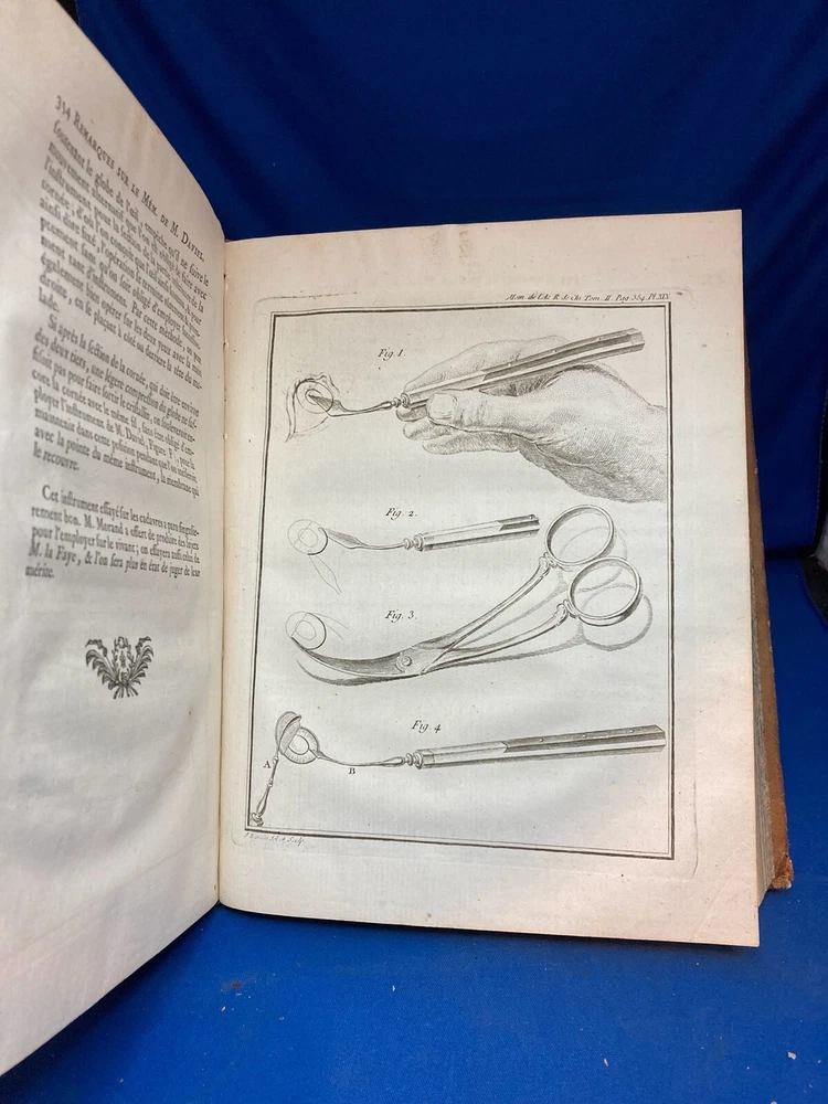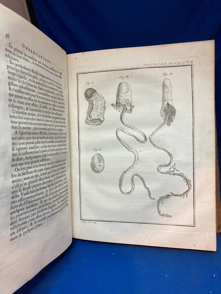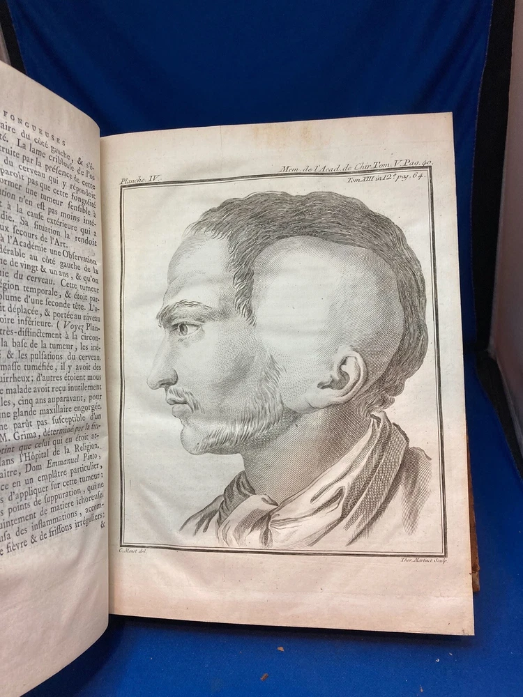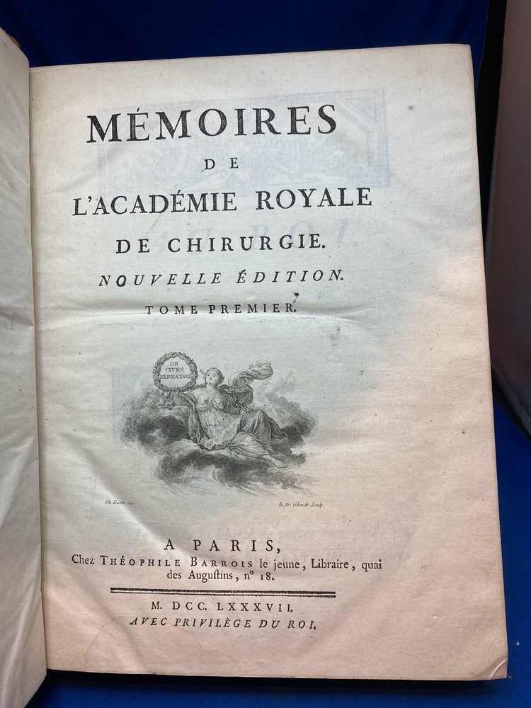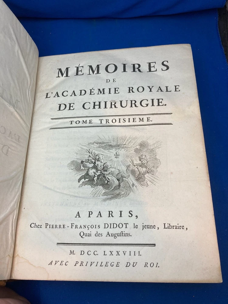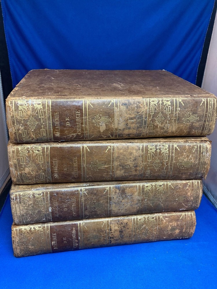 MEMOIRES DE L’ACADEMIE ROYALE DE CHIRURGIE (1787) SET OF 4 VOLUMES IN FRENCH Title: Mémoires de L’Académie Royale de Chirurgie Author: Date: 1787 Publisher: Théophile Barrois, Paris Size: Each volume is 8’’ x 10 1/4’’ x 2 1/4'' Condition: VERY GOOD. Full leather bindings intact on all volumes. Light rubbing on covers. Gilt decor and lettering on spines. Marbled pastedowns. Bumped corners and edgewear, consistent with age. Vol 1 and 5 have unbroken spines. Vol 2 and 3 spines are broken. Pages have an amazing, bright color and crisp texture. Very minimal staining present. All volumes are in outstanding condition for the age. Notes: This is an incomplete set of 4 volumes. Contains volumes 1, 2, 3, and 5. Text is in French. Fascinating engraved illustrations and fold-out diagrams throughout all volumes covering medical procedures on just about all parts of the body, including eyes, fingers, legs, skulls, etc. as well as the tools used for these procedures. Please ask questions before bidding or purchasing! Check my Ebay store for more antique and collectible books, ephemera, vintage magazines, and other paper products. I also have a wide range of fine china, crystal, silverplate and sterling silver. If there's something that you want me to look for send an email and I'll look for those special items too. _gsrx_vers_1292 (GS 8.3.6 (1292))