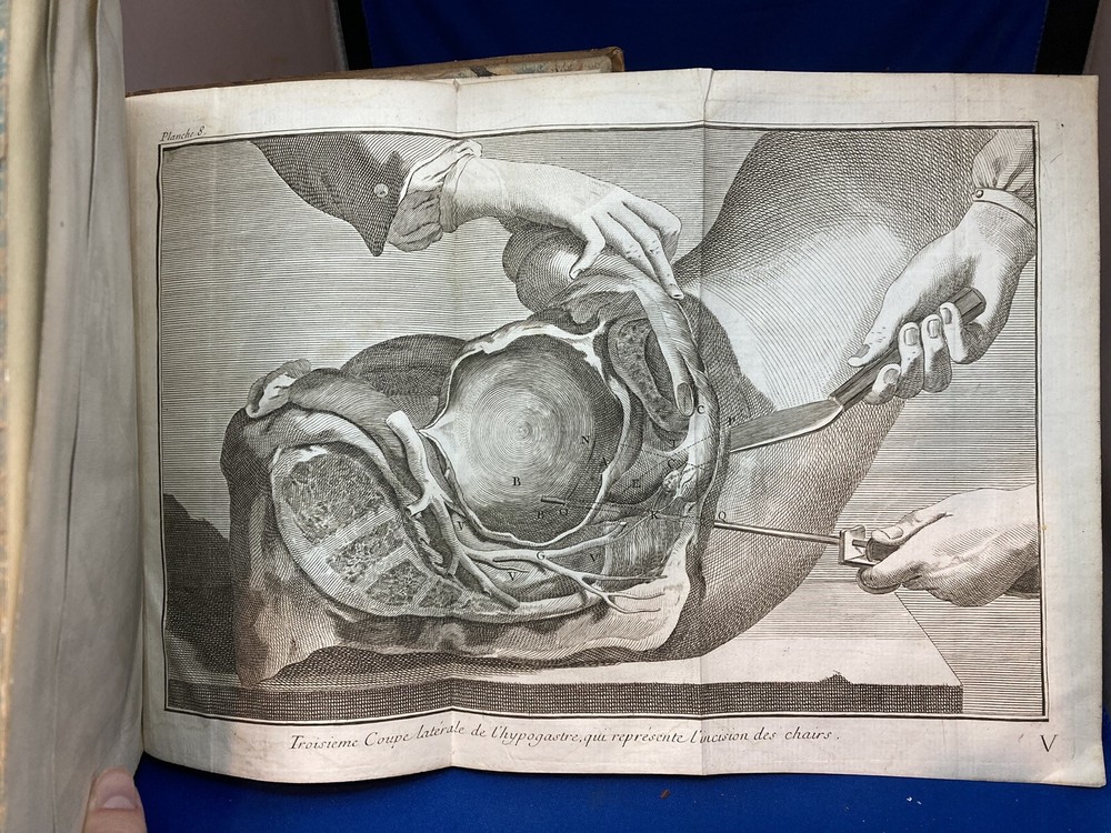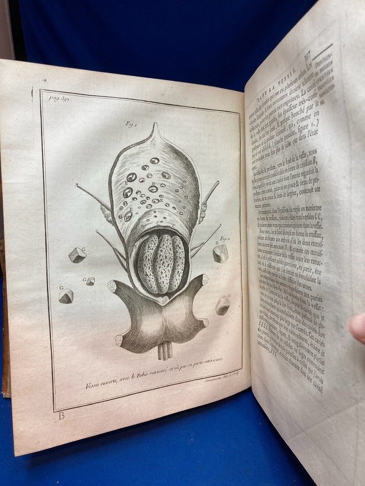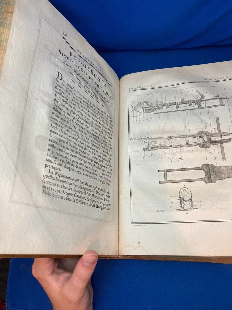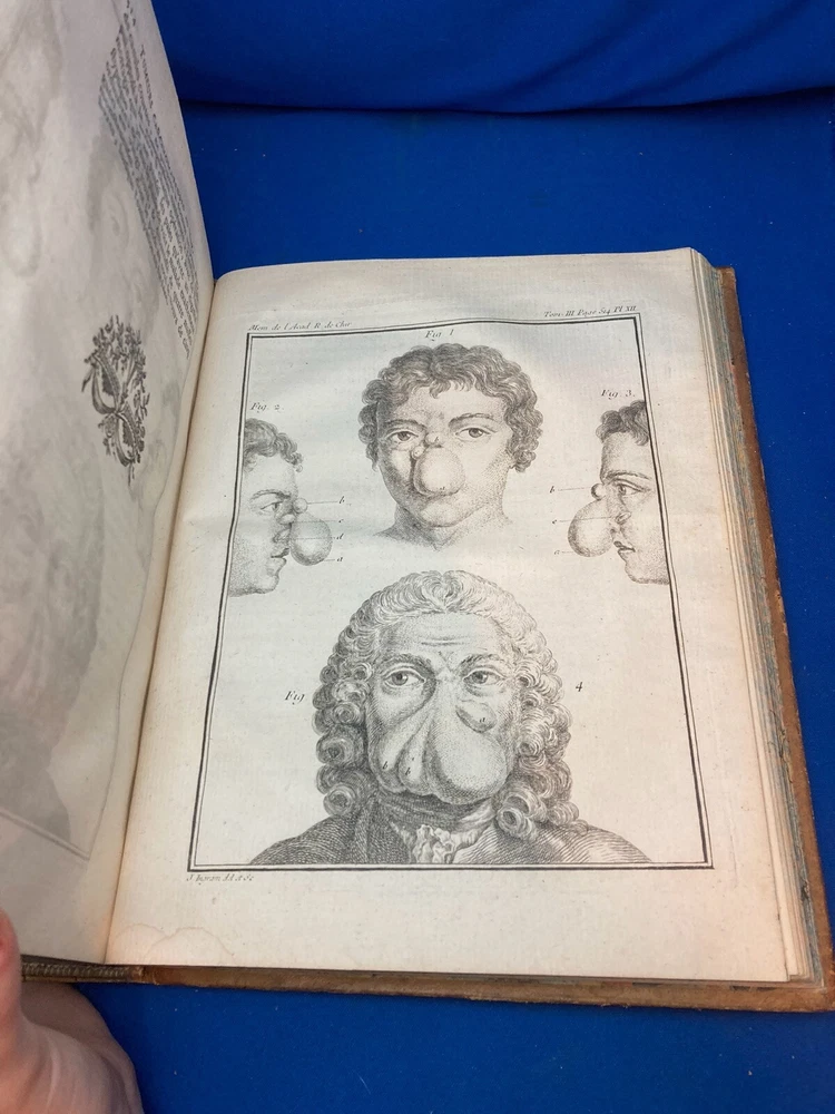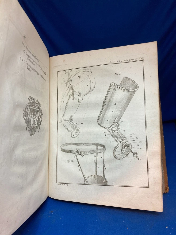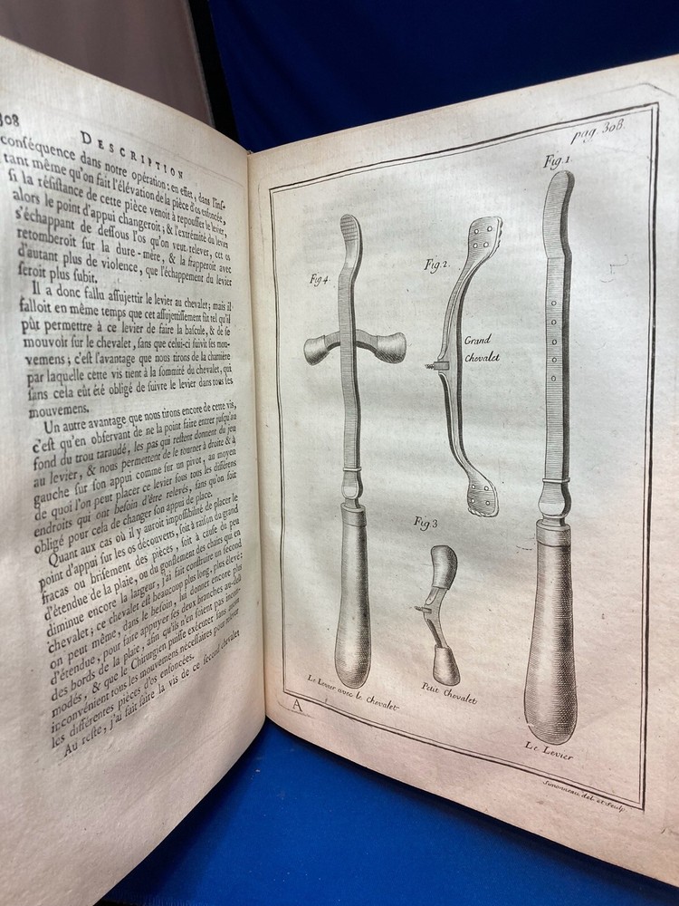 MEMOIRES DE L’ACADEMIE ROYALE DE CHIRURGIE (1787) SET OF 4 VOLUMES IN FRENCH Title: Mémoires de L’Académie Royale de Chirurgie Author: Date: 1787 Publisher: Théophile Barrois, Paris Size: Each volume is 8’’ x 10 1/4’’ x 2 1/4'' Condition: VERY GOOD. Full leather bindings intact on all volumes. Light rubbing on covers. Gilt decor and lettering on spines. Marbled pastedowns. Bumped corners and edgewear, consistent with age. Vol 1 and 5 have unbroken spines. Vol 2 and 3 spines are broken. Pages have an amazing, bright color and crisp texture. Very minimal staining present. All volumes are in outstanding condition for the age. Notes: This is an incomplete set of 4 volumes. Contains volumes 1, 2, 3, and 5. Text is in French. Fascinating engraved illustrations and fold-out diagrams throughout all volumes covering medical procedures on just about all parts of the body, including eyes, fingers, legs, skulls, etc. as well as the tools used for these procedures. Please ask questions before bidding or purchasing! Check my Ebay store for more antique and collectible books, ephemera, vintage magazines, and other paper products. I also have a wide range of fine china, crystal, silverplate and sterling silver. If there's something that you want me to look for send an email and I'll look for those special items too. _gsrx_vers_1292 (GS 8.3.6 (1292))