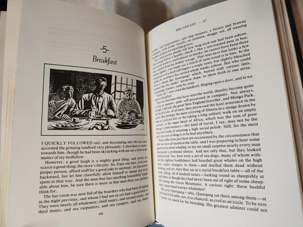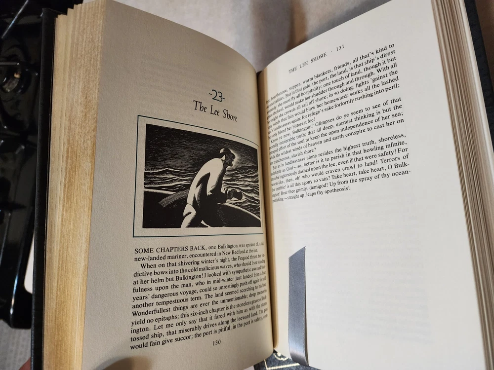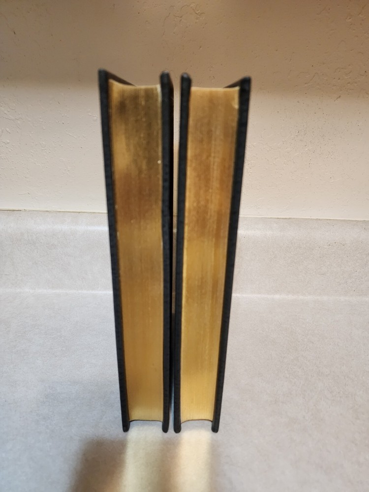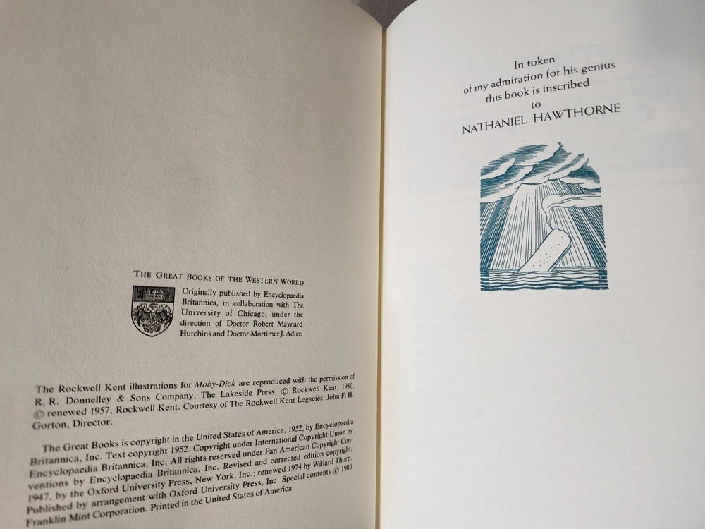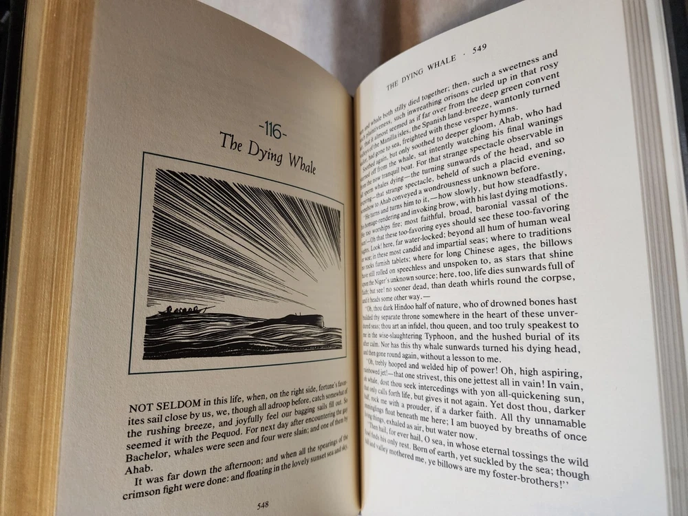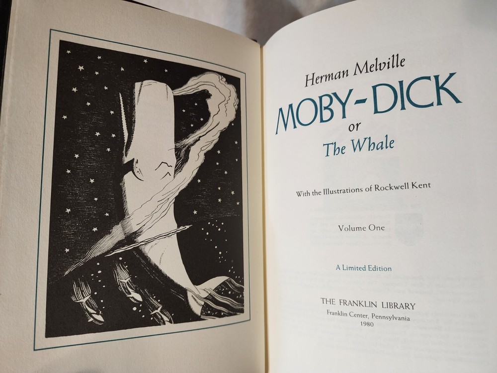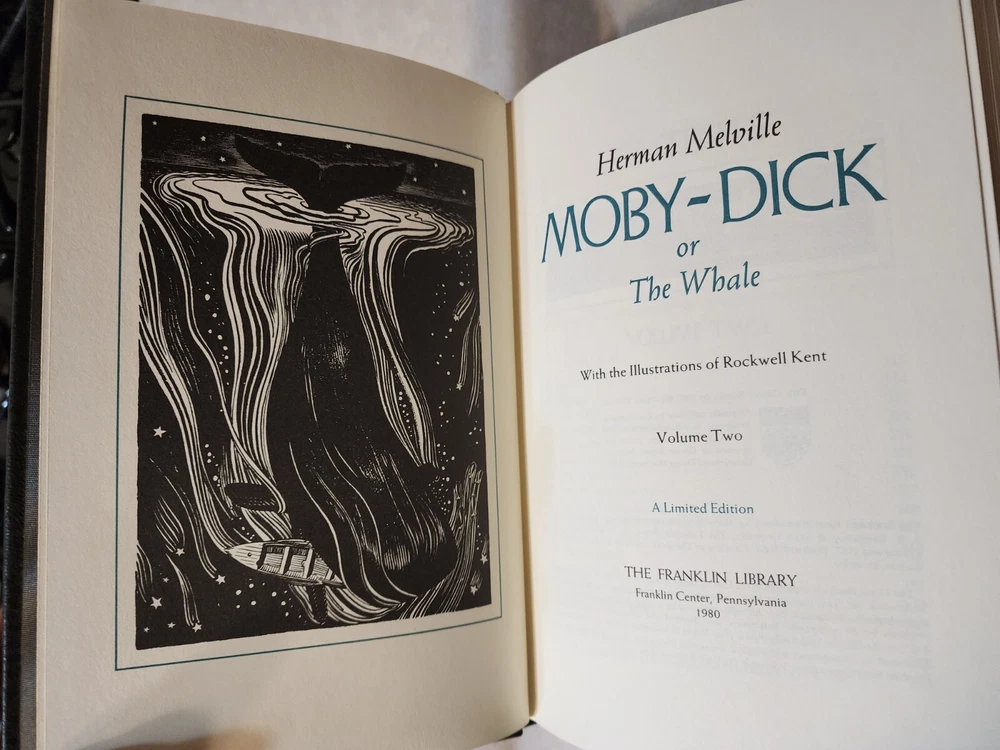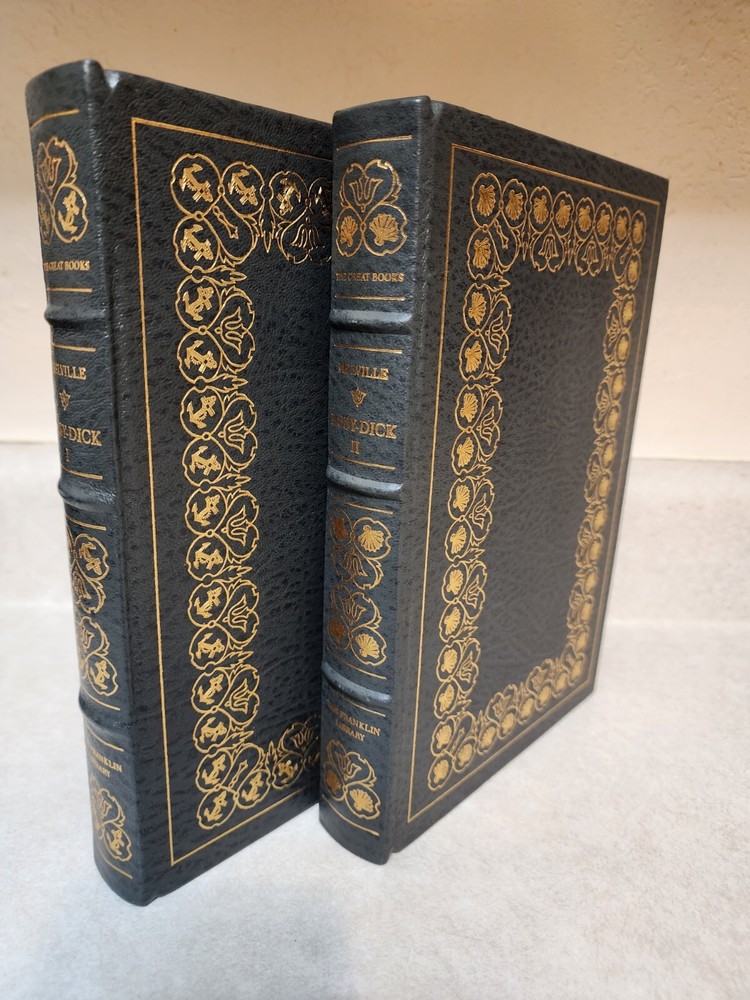 Moby Dick by Herman Melville Franklin Library Limited Edition 1st Edition ~ 2 Volume Set Illustrated by Rockwell Kent Franklin, 1980. VG+. Raised bands, A Limited edition”; full leather with gold lettering and designs ; all edges gilt ; silk moire endpapers ; Illustrated. Interior clean and tight. Light edge wear, surface flaws, a few mild scuffs to gilt edges. ffep has a crease. Clean, no writing or marks on interior. A solid collectible copy.