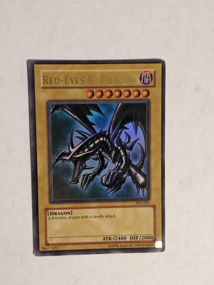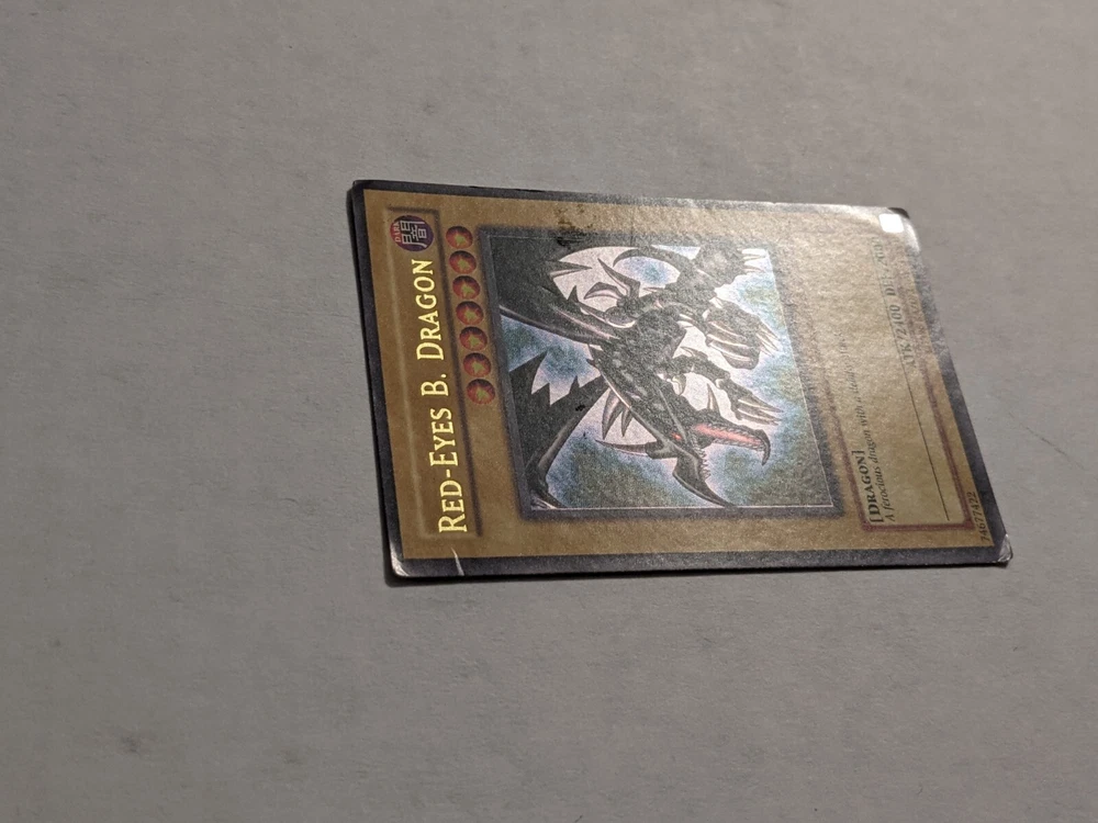 Famous Yu-Gi-Oh card, red-eyes black dragon, in moderately played condition as seen in image