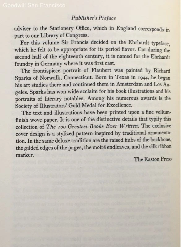 I am pleased to report that the seller goodwillsanfrancisco provided my winnings of the Easton Press collected version of the Ultimate Hitchhiker's Guide to the Galaxy in a very pristine condition, which is hard to ensure in auctions from out of state second hand stores. They were quick to ship it out, packaged it well, and as stated provided it to me in the condition it appeared to be photographed in and as described! So, it was an excellent transaction for both the great value and the service!