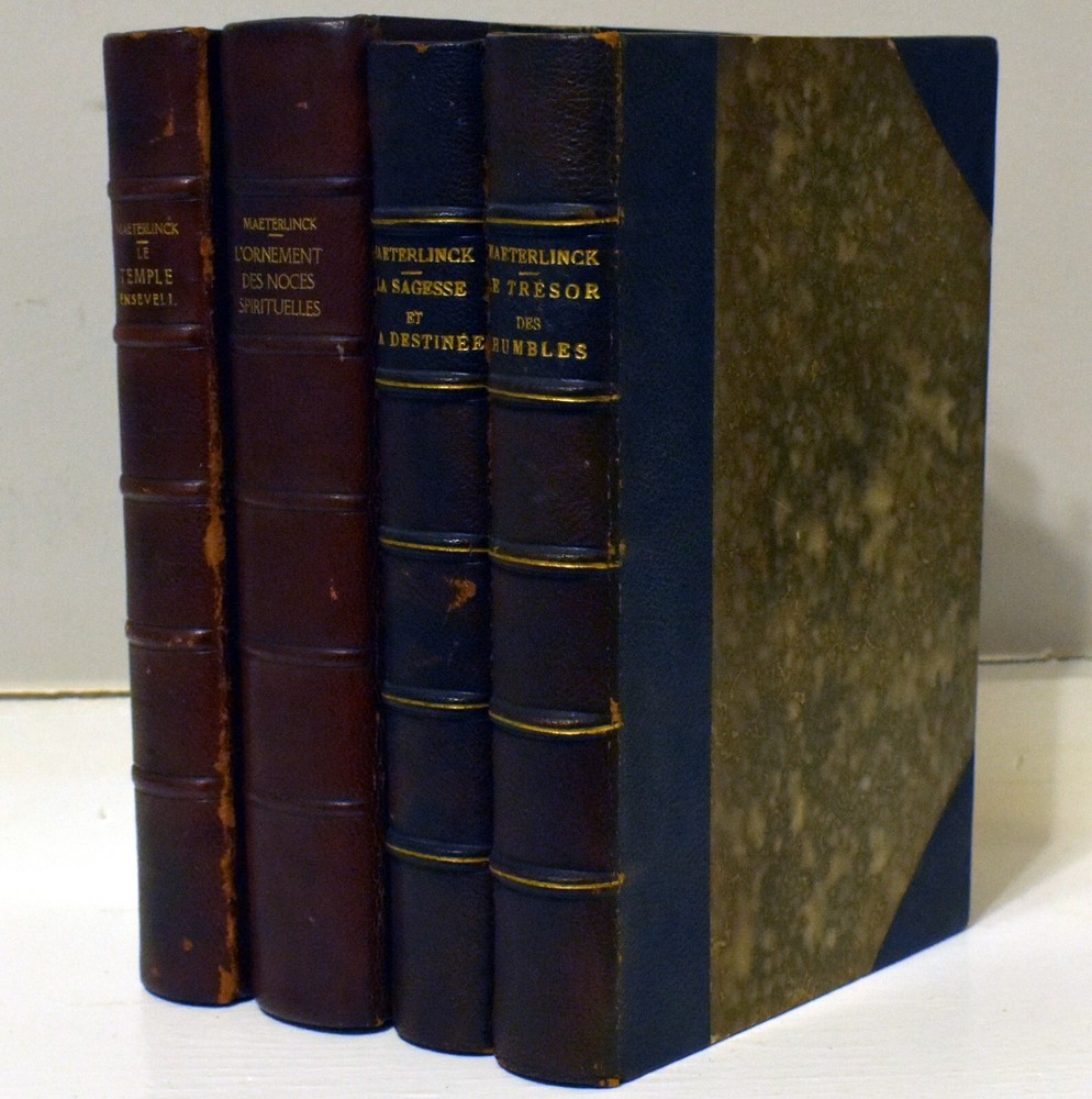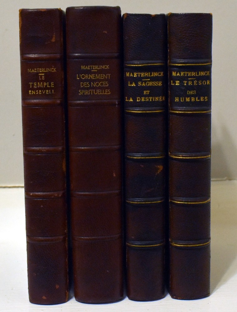 Maurice Maeterlinck 4-Volume Set. Four volumes total. Rebound during the 1920's/1930's by book collector Irwin Chandler. Includes the following titles: L'Ornement Des Noces Spirituelles - Paul Lacomblez 1891 (Possible First Edition) Le Temple Enseveli - Biblioteque-Charpentier 1902 (Possible First Edition) Le Tresor Des Humbles - Societe Du Mercure De France 1898 La Sagesse Et La Destinee - Biblioteque-Charpentier 1900 Maeterlinck was an important Symbolist who is best known for his play The Blue Bird.