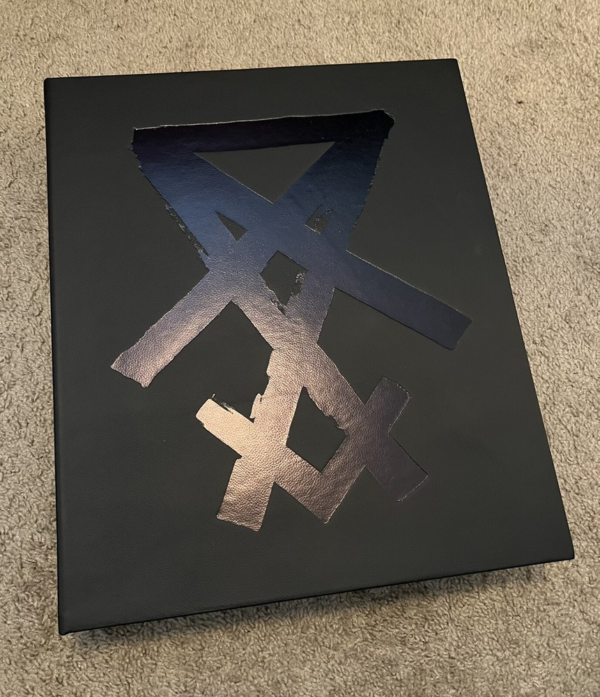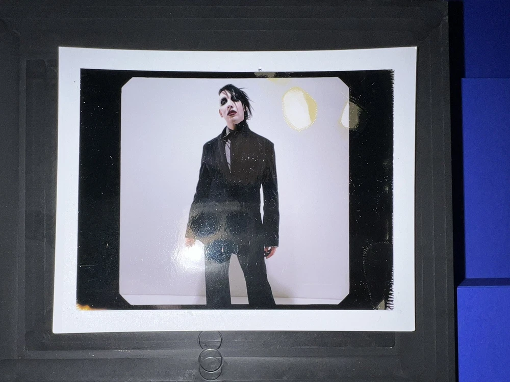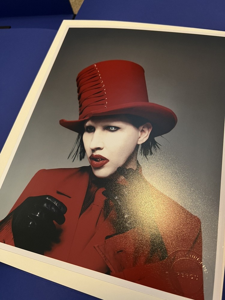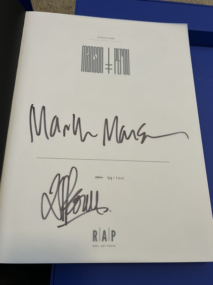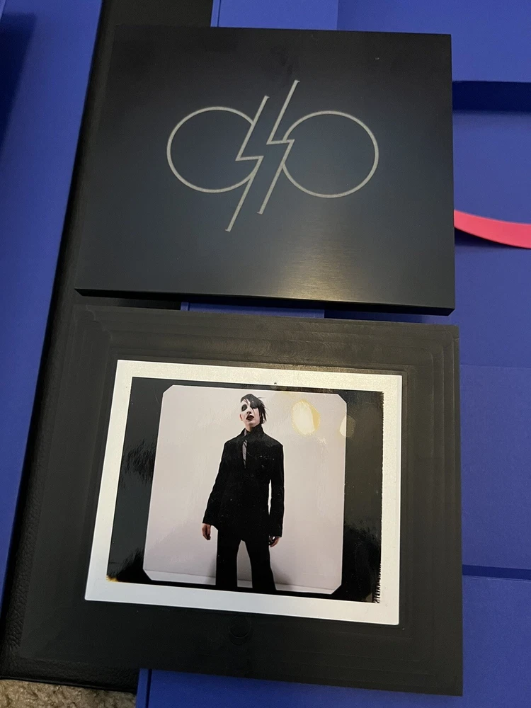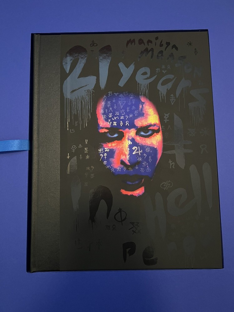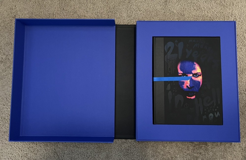 Marilyn Manson 21 Years in Hell. Limited edition/100 box set of Marilyn Manson 21 Years in Hell by Perou. Includes leather-bound book case, special edition book edition 99/100 with UV activated alternate cover and front-page insert signed by Marilyn Manson and Perou, a high-quality glossy print, and a one-of-a-kind Polaroid from Perou’s personal collection housed in a heavy-duty die-cut box. One small dent in upper right corner of book case, see photos. All other components are in perfect condition and have been stored in the original shipping materials since purchased.
