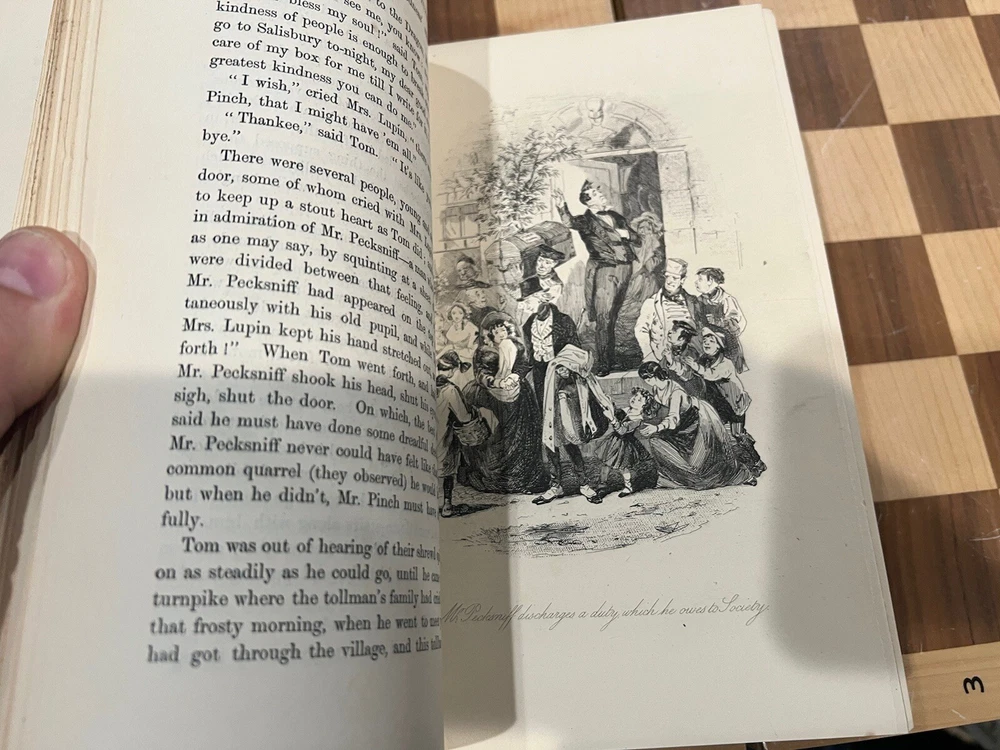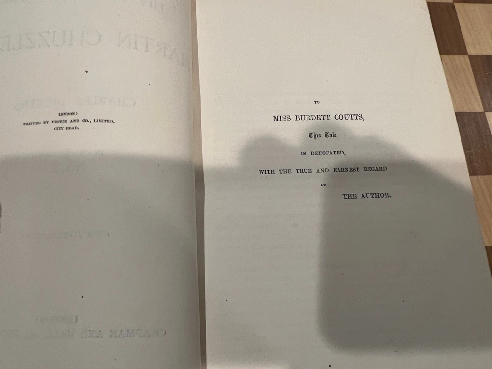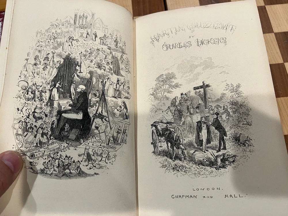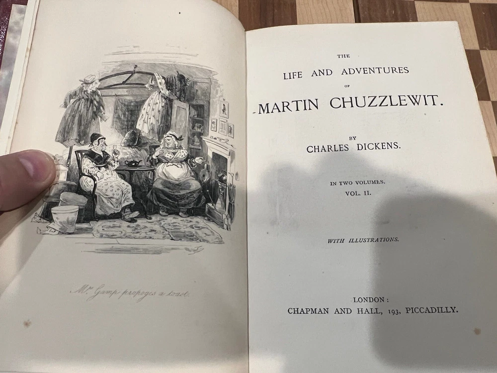 Very good condition half leather Chapman and Hall 2 volume set with lithos. This is a rare, undated 1871-1905 half leather set of Martin Chuzzlewit by Charles Dickens, published by Chapman & Hall. The book is written in English . The binding is made of leather, (half leather , half cloth ) which adds to the charm and collectibility of the book. It is a great addition to any antique or rare book collection.