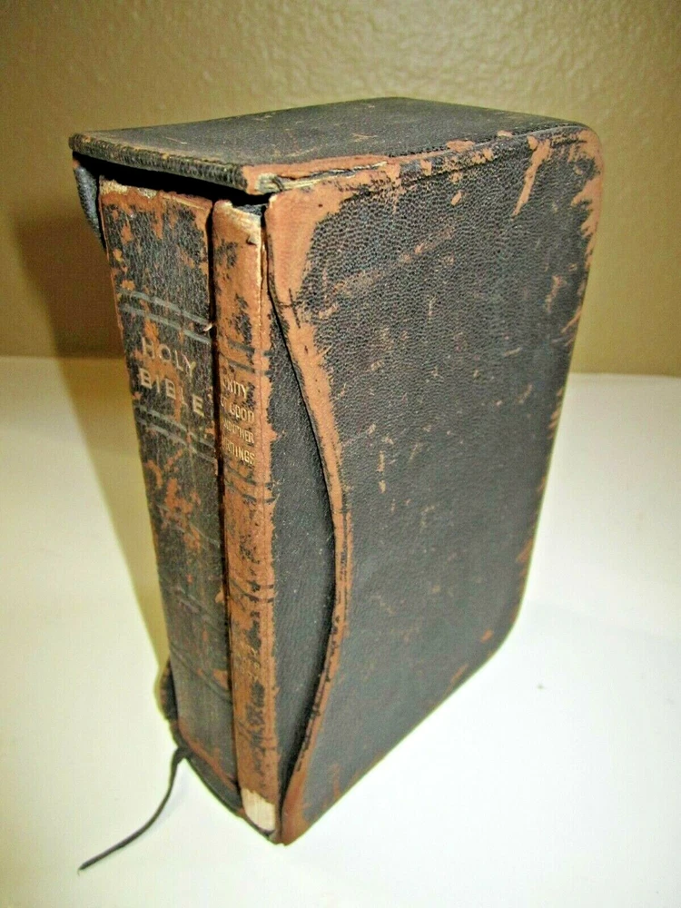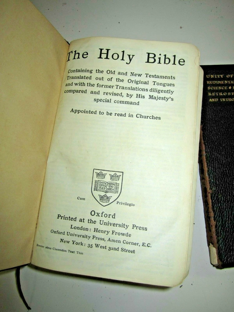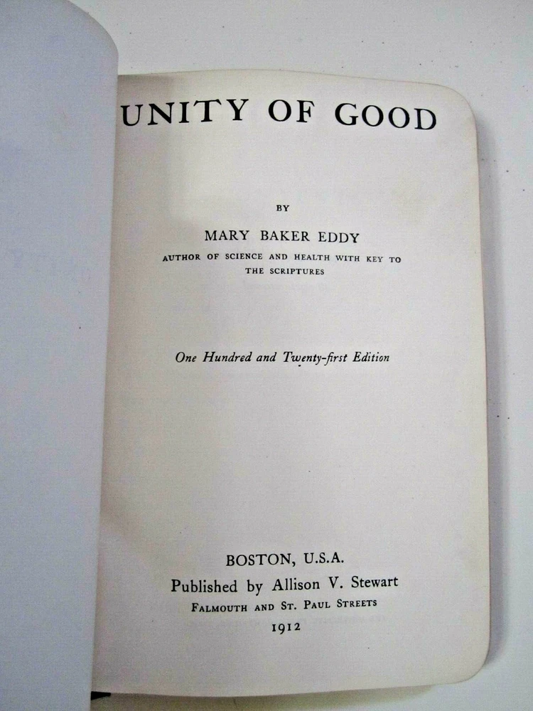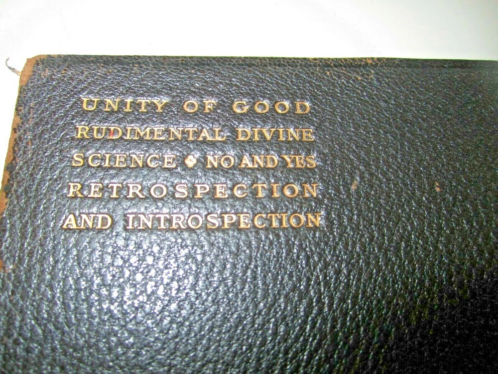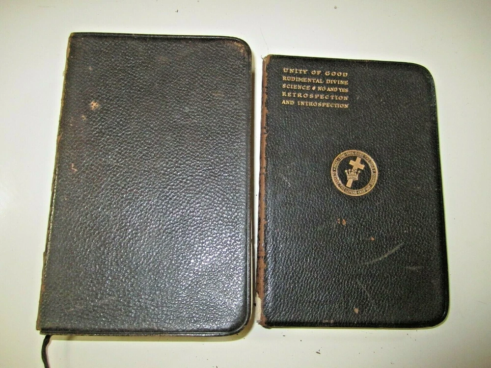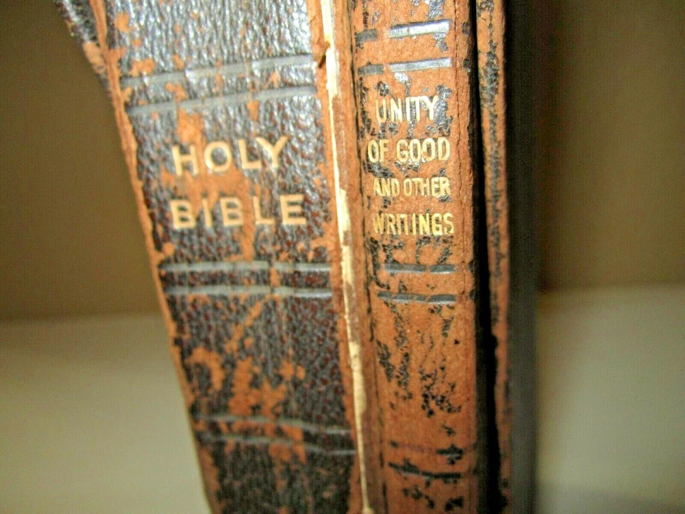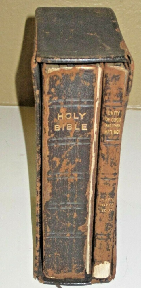 Boxed set of Unity of Good and the Holy Bible in slipcase Slipcase is leather covered as are both books Both books are ~ 7 1/2" x 4-1/2" UNITY of GOOD by Mary Baker Eddy , copyright of 1912 - leather cover with gilt edges . Has original owner's name, dated 1918 Holy Bible, published by Oxford University Press American branch, no copyright date found - leather cover with gilt edges. Front cover / binding is loose. Please View All Photos for Better Detail of Items and fotos are part of the items description Fotos are of the actual item you shall receive If you have any questions or require additional fotos please do not hesitate to ask Any additions or corrections are appreciated Thank you for visiting and please don't forget to check out my other unusual items for sale.