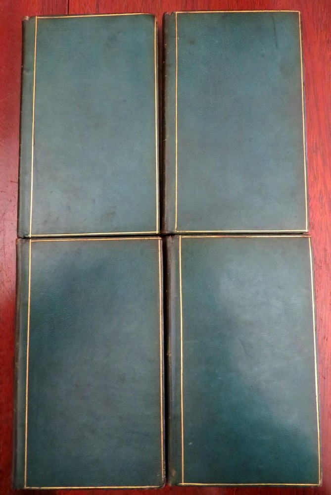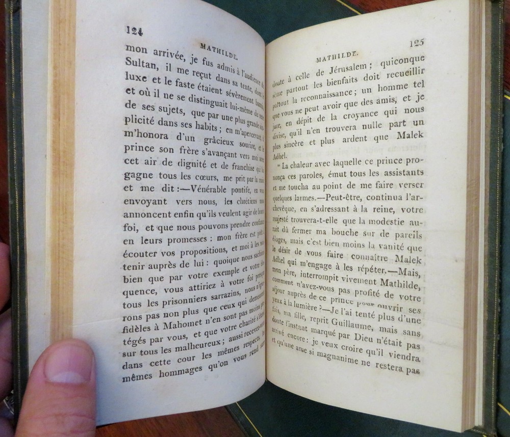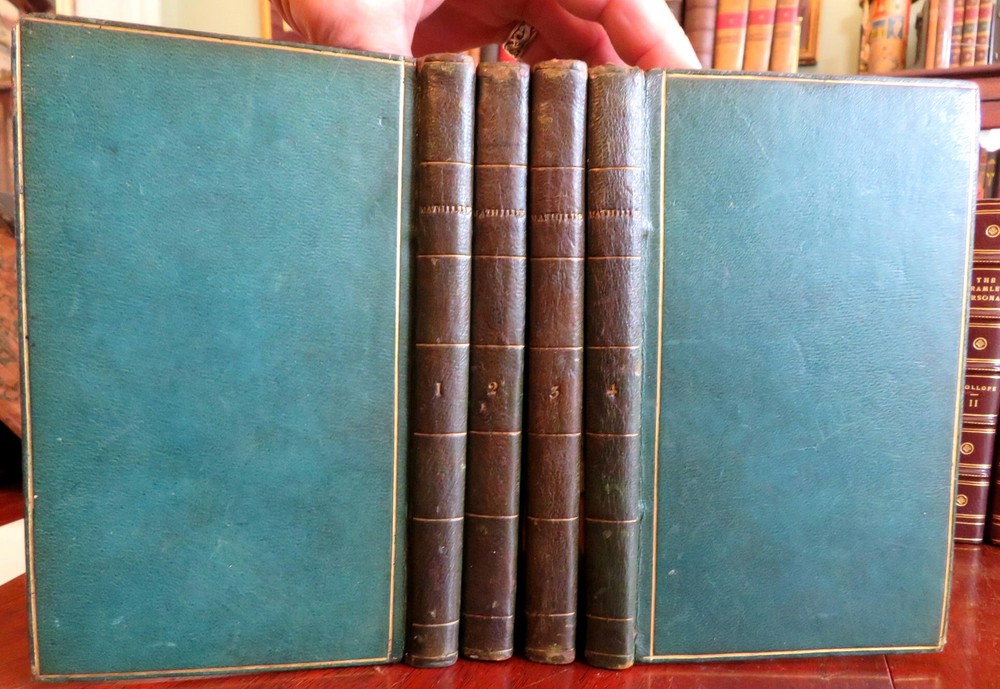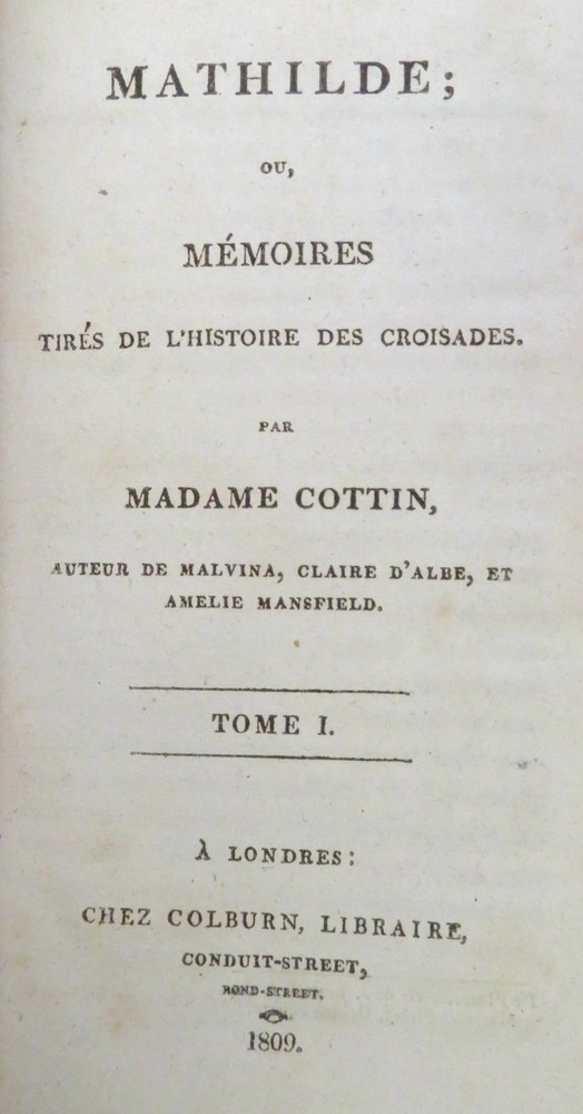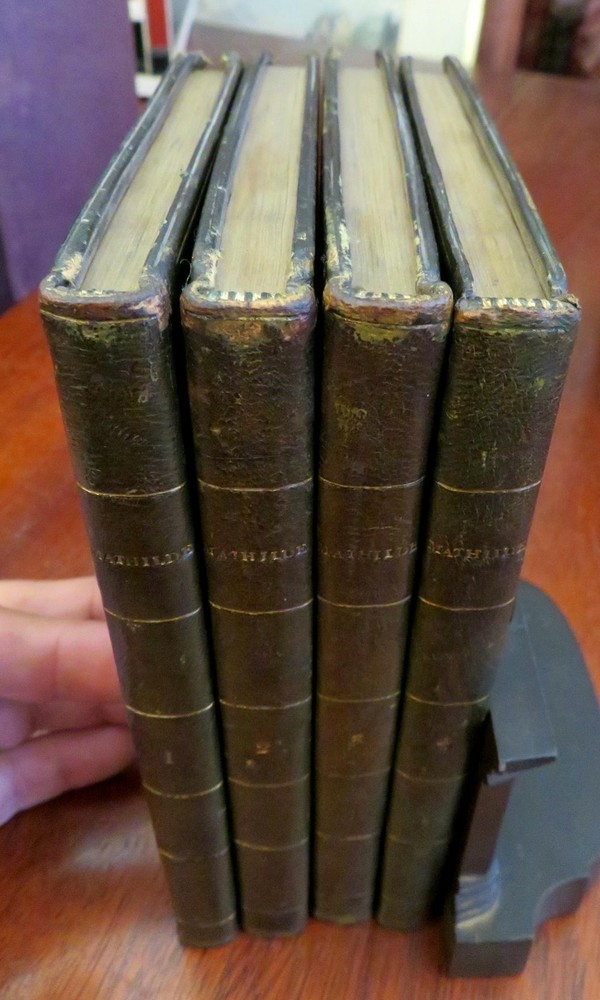 Mathilde 1809 Madame Cottin French Crusades Literature Lovely 4 vol. leather set Mathilde 1809 Madame Cottin French Crusades Literature Lovely 4 vol. leather set (Old Books, 19th Century Books, Leather Books, French Books, Crusades, Literature, Madame Cottin). Mathilde; ou, Memoires Tires de L'Histoire des Croisades, by Madame Cottin. Published 1809, London by Colburn. 4 volumes, each c. 225 pages. Text in French. Period early 19th century full grained leather bindings, smooth spines, gilt bands & title lettering, gilt ruled covers, all edges gilt. Set is over 210 years old and shows some signs of handling and time. Set is not new or in "new" condition. Bindings gently age worn, leather rubbed but still supple, joints slightly scuffed, set remains overall attractive as an object. Text block paper is gently toned, light to moderate scattered age spotting, internally still well preserved, tight, sound. Still attractive on the shelf. Set displays a pleasing and unique age patina and is in nice antiquarian condition, any age flaws easy to overlook or forgive. Please review photos for more detail and our best attempt to convey how this fine and scarce antique French set survives. Books Measures c. 7 1/4" H x 4 1/2" W. [B3583].