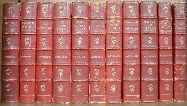 eBay template Maurice Maeterlinck 11 Vol. Set by Maurice Maeterlinck Dodd, Mead and Company; New York, 1908-1910. Hardcover. This set is heavy and additional shipping cost may apply. Complete 11 Volume Set. An Acceptable, three quarter red leather binding, five raised hubs, gilt title/author lettering and gilt flower illustrations on spine, binding intact except one Volume, Thoughts, with heavy use to boards/hinges and boards almost detached, TEG with moderate blemishes, rubbing to board/spine edges and joints, few handling/scuff marks to text block edges, bottom text block edge a bit pulpy, some age toning to pages, marbled endpapers and pastedowns, small abrasion to board corners, ink Brenatons NY stamp verso top front free endpaper, diagonal crease half title and title page of the Volume The Buried Temple, abrasion top front board edge of Volume Mary Magdalene, dent top front board edge and almost detached front free endpaper with chips and tears of Volume Thoughts, few small abrasions to hubs, leather is dry and a bit brittle, some handling/rub marks to boards, set. Overall in a Good condition except for the Volume, Thoughts. 8vo[octavo or approx. 6 x 9 inches], (Mary Magdalene) 179pp., (Sister Beatrice and Ardiana and Barbe Bleue) 183pp., (Wisdom and Destiny) 353pp., (The Measure of the Hours) 371pp., (The Buried Temple) 335pp., (The Blue Bird) 241pp., (Joyzelle) 277pp., (The Life of the Bee) 427pp., (Treasure of the Humble) 225pp., (The Double Garden) 348pp., (Thoughts) 283pp. We pack securely and ship daily with delivery confirmation on every book. The picture on the listing page is of the actual book for sale. Additional Scan(s) are available for any item, please inquire. 111111111843 SHIPPING: Domestic Media Mail is an additional $5.00. Domestic Priority S&H is an additional $10.00 per item. All domestic orders are moisture protected and shipped in either a well padded box or depending on price/size of book it will be cardboard sleeved & shipped in a well padded bubble envelope. The handling includes Delivery Confirmation on every domestic order which will be emailed upon processing. We always combine on shipping on multiple orders. Foreign shipments are at cost with a dollar handling. PAYMENT: Immediate payment only on this item. RETURNS: All books returnable for a full refund within 30 days after delivery for any reason. A NOTE ON GRADING: Ebay's catalog database can be faulty, please read notes section to clarify particulars on an item, if you have any questions please contact us for more information or pictures. We grade Fine, Near Fine, Very Good, Good, Fair. Any faults are always noted including remainder marks, price clipped dust jackets, and previous owner markings. If not noted then they do not exist on this book. © 1998 - 2023 Lavendier Books. All rights reserved.