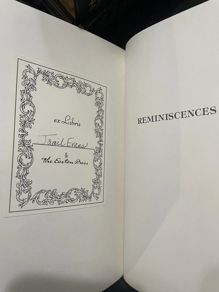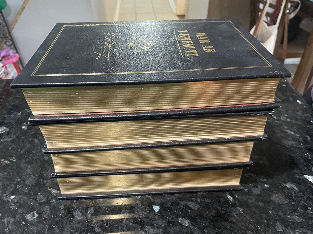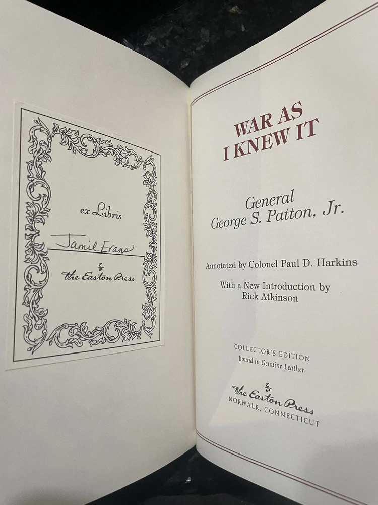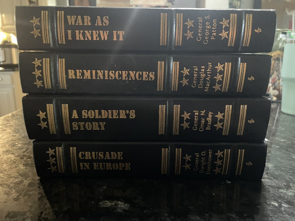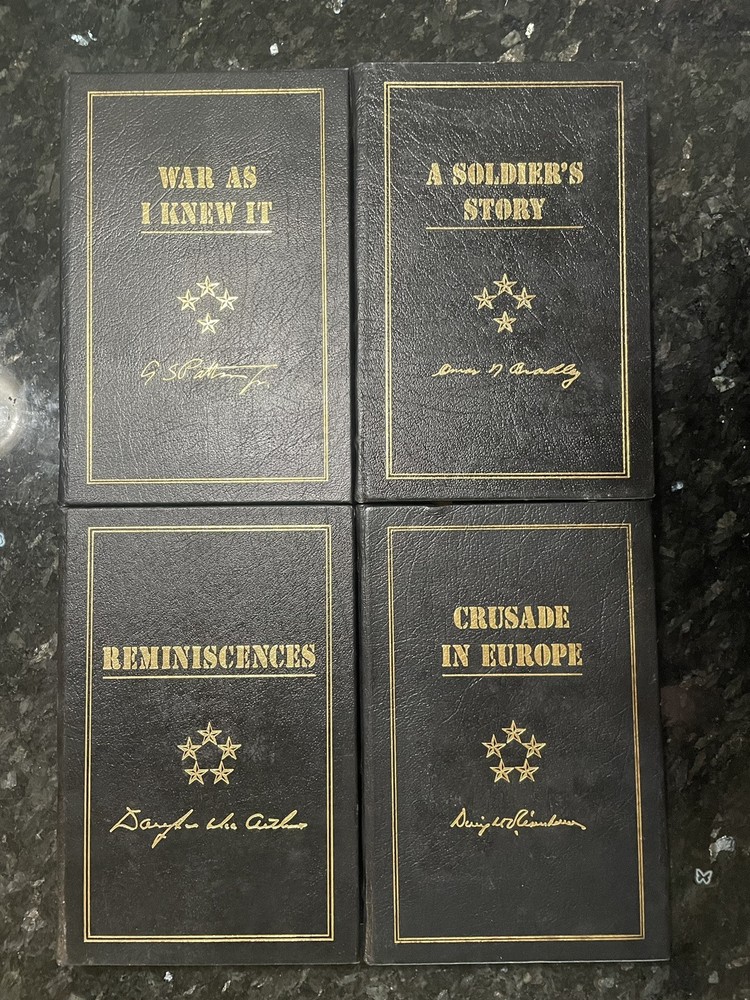 The product is a 4-volume set of "Memoirs of World War 2 Generals" published by Easton Press in 2001. They include War as I knew it, A Soldier’s Story, Reminiscences, and Crusade in Europe. The books are in very good condition and feature leather binding, making them a luxury collector's edition. The books all have a persons name written on the nameplate. No other writing in any of the books. Written by Dwight Eisenhower, the memoirs cover the topic of World War II from the perspective of various generals involved in the conflict. The set is illustrated and printed in English, providing a unique insight into the military and war aspects of North America during that period.
