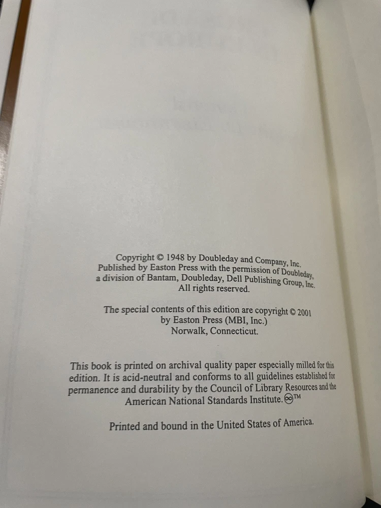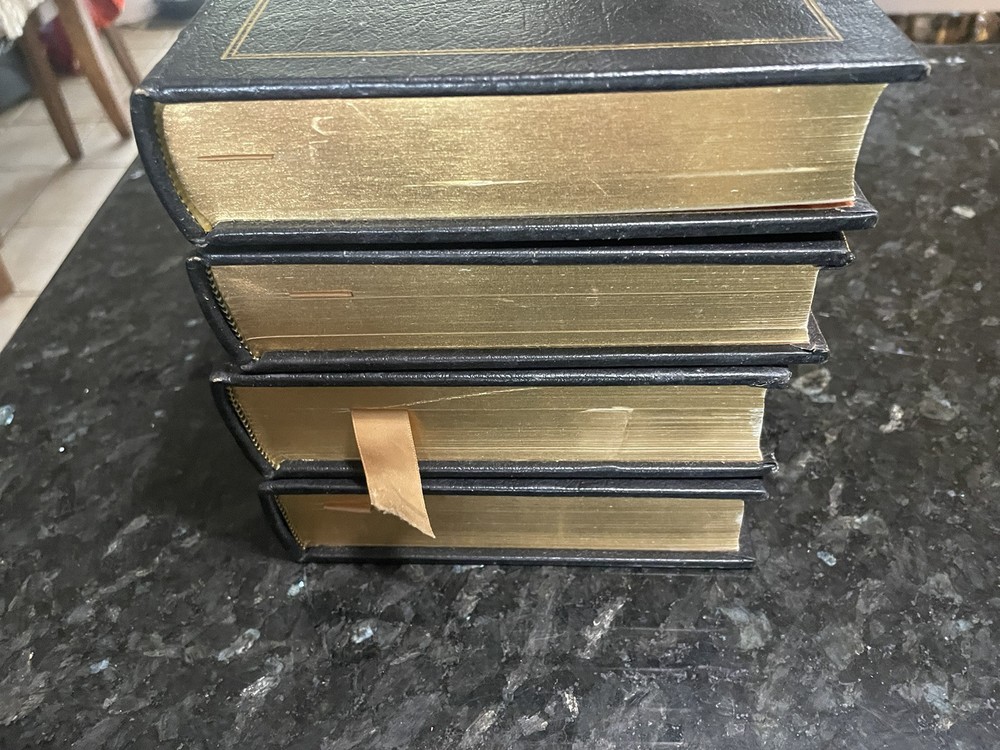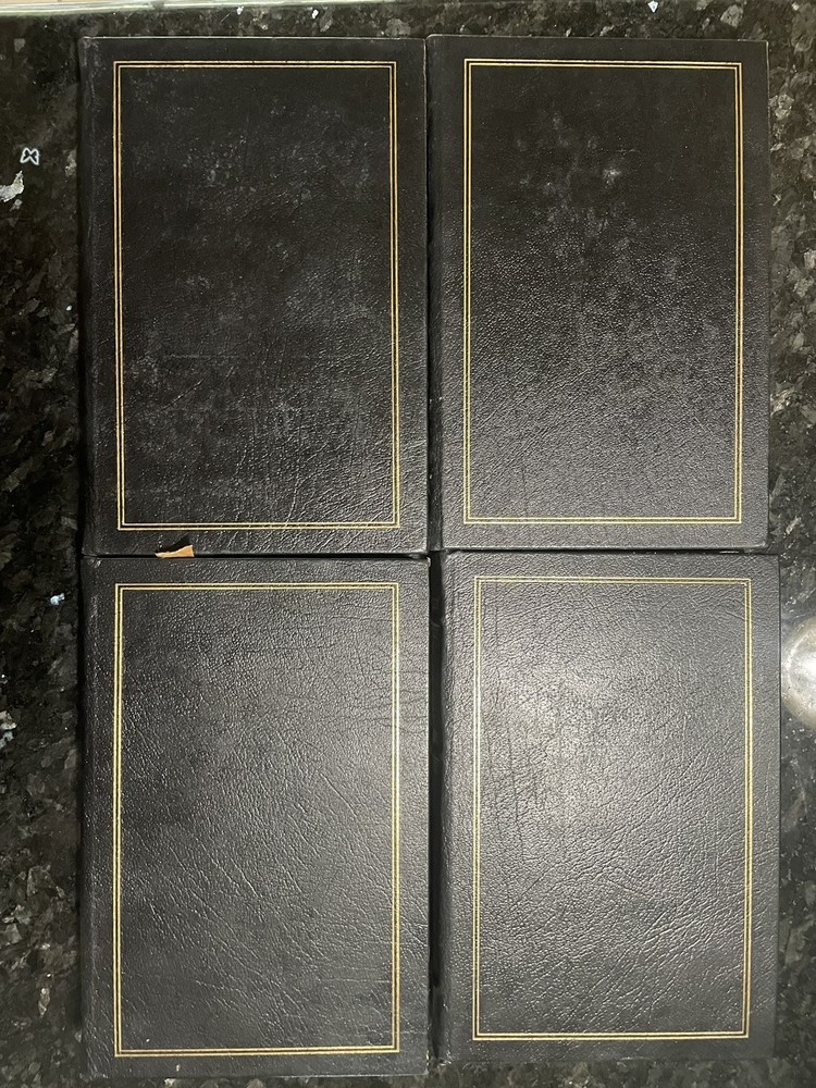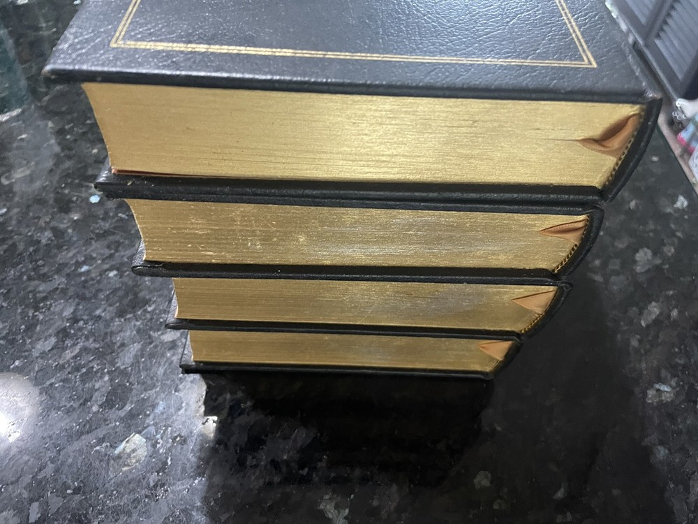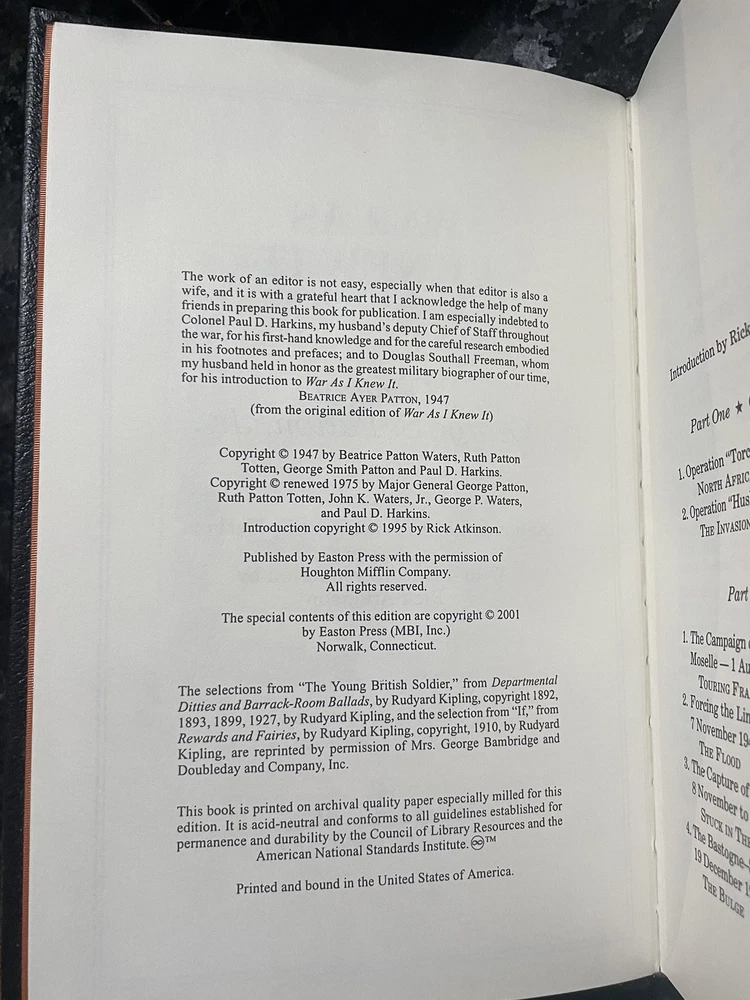 The product is a 4-volume set of "Memoirs of World War 2 Generals" published by Easton Press in 2001. They include War as I knew it, A Soldier’s Story, Reminiscences, and Crusade in Europe. The books are in very good condition and feature leather binding, making them a luxury collector's edition. The books all have a persons name written on the nameplate. No other writing in any of the books. Written by Dwight Eisenhower, the memoirs cover the topic of World War II from the perspective of various generals involved in the conflict. The set is illustrated and printed in English, providing a unique insight into the military and war aspects of North America during that period.