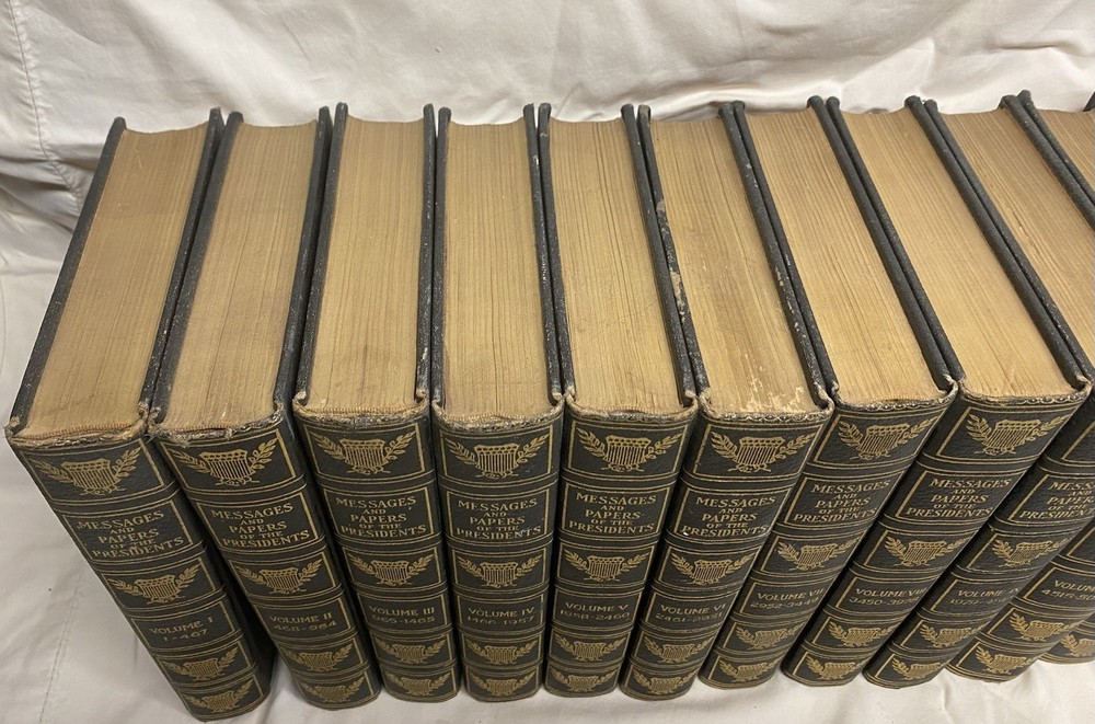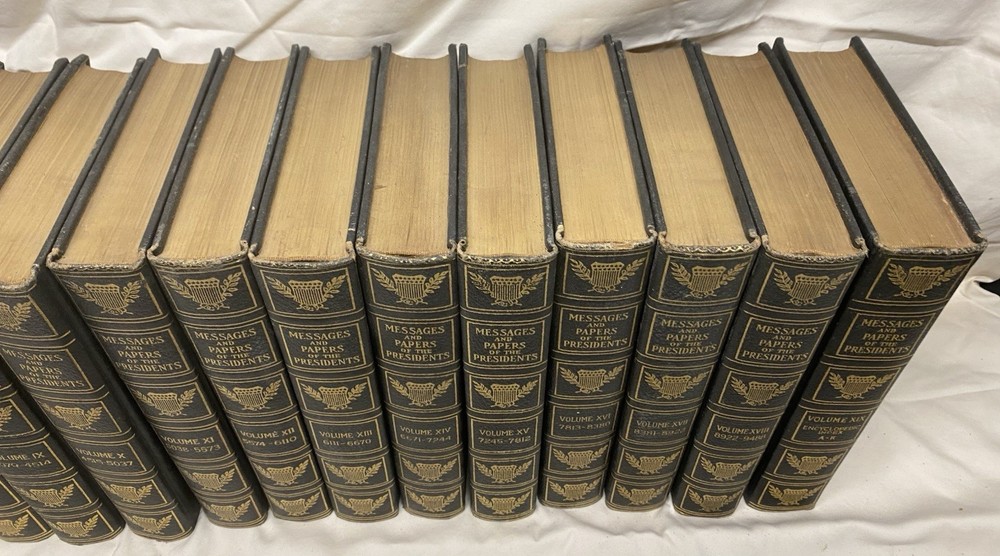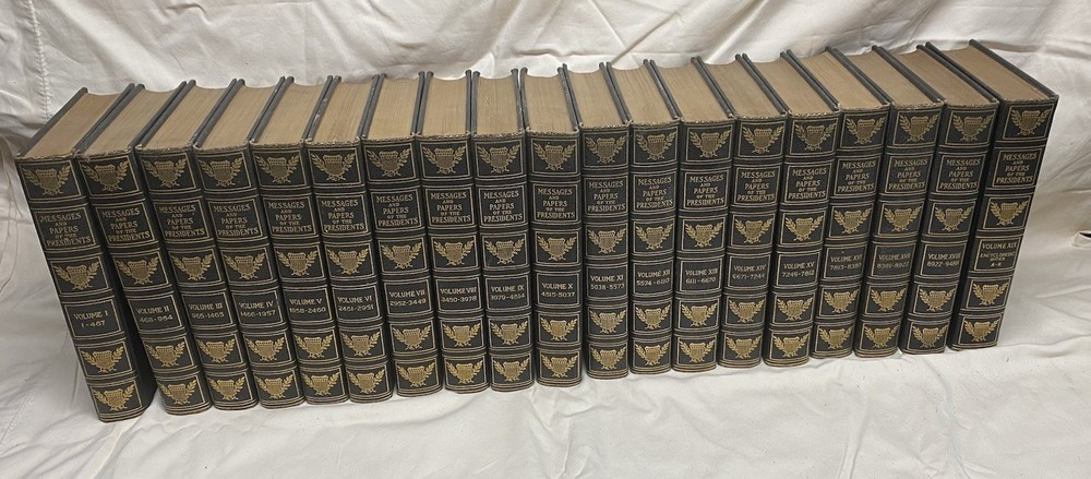 19-volume set titled "Messages and Papers of the Presidents," published in 1897 by the Bureau of National Literature. The last volume (Encyclopedic Index L-Z) is missing from the set. Bound in leather, published in 1897.