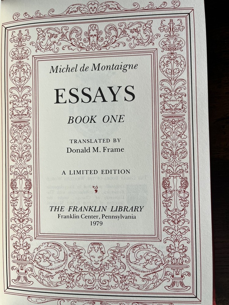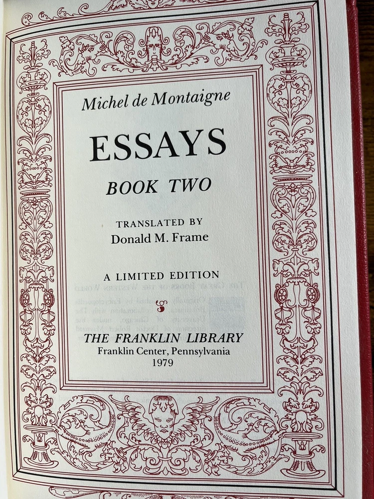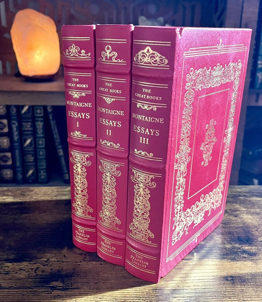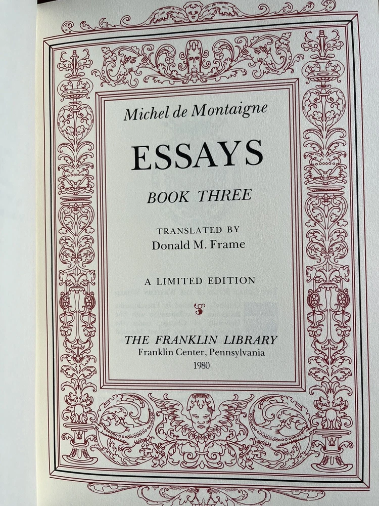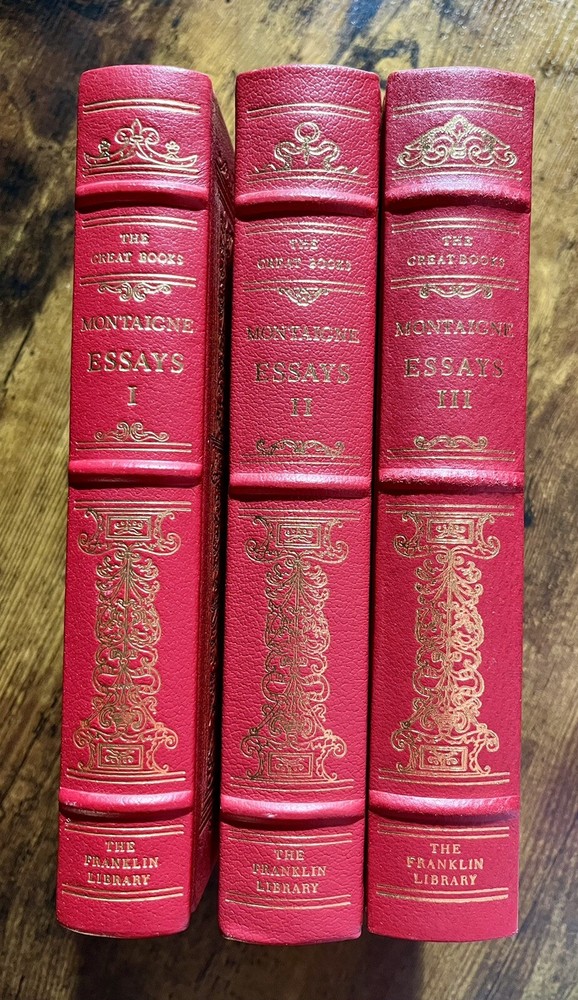This luxury edition collector's copy of Michel de Montaigne's Essays I, II, & III is a must-have for any book collector or lover of philosophy. The Franklin Library edition, published in 1980, features a leather binding and is an original printing in English. This limited edition book club edition is part of The Great Books of the Western World Set and was printed in Franklin Center, Pennsylvania. The book covers a range of topics in literature and philosophy, making it a great addition to any collection. This item is perfect for those who are looking for a unique and rare book to add to their personal library.