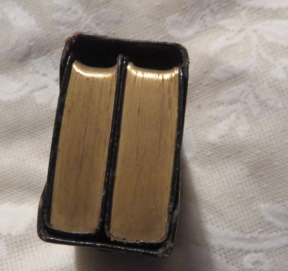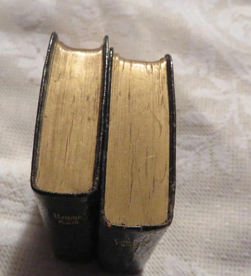 Miniature Leather Book of Common Prayer & Hymns A. & M. in original matching case and books in very good condition, case had a strap of some type now gone, appears to have been removed. Black leather, gold gilt titles on front and spines, page edges tipped gold gilt still very shiny. Set is from mid 1800's determined by the name of the publisher for the Hymns book, William Clowes & Sons, the other book published as expected by Oxford University Press, London. Books measure 2 & 1/8"tall and 1 & 7/8" across. Bought this set from a miniature book collector 25 years ago, non-smoking home. Great item for the collector, for decorating display, or of course for worship, small size very handy. Will ship well packed in box with tracking and insurance. In good condition overall , no names or writing inside. We have provided good photo, a detailed accurate description, and we are always available to answer any questions; for this reason we do not accept returns.