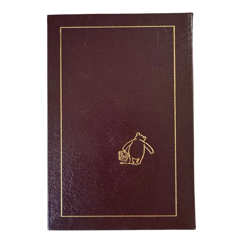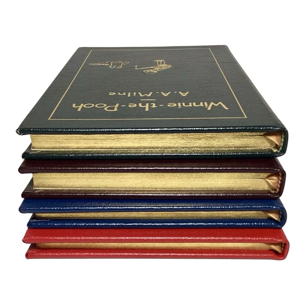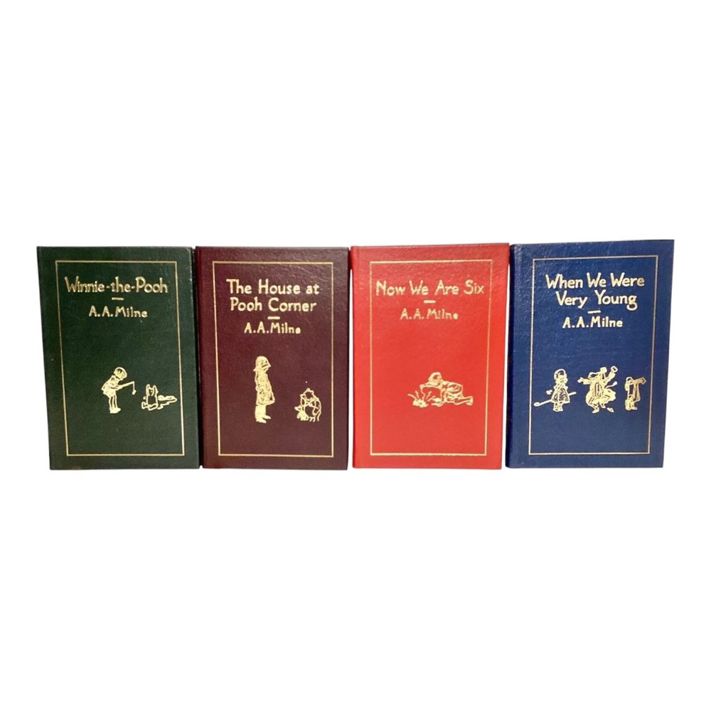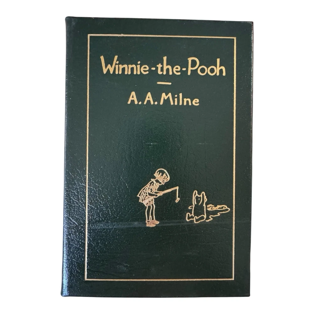 Delve into the whimsical world of A A Milne with this exquisite set of four Winnie the Pooh books, bound in rich leather and published by the renowned Easton Press in 1985. Two of the four books have a personalized nameplate, while the other two do not. Each volume is a testament to the timeless allure of Milne's storytelling, brought to life through the charming illustrations of Ernest Shepard, which add a layer of warmth and nostalgia to every page. These books are in excellent condition, but not in original seal. “Winnie-the-Pooh”, (green hardback) has a faint line of some sort on front cover. Not sure how; as these books have been properly stored for many years. (Please see pictures attached). These books are not merely reading material but collector's items, featuring the collector's edition status and adorned with special attributes that celebrate the literary legacy of the Winnie the Pooh series. Immerse yourself or gift a piece of classic children's literature that continues to captivate hearts across North America and beyond.