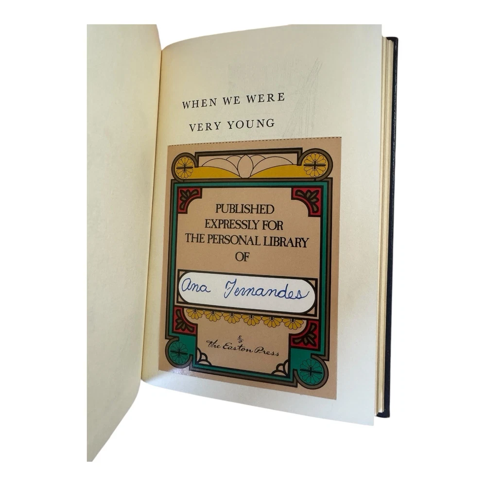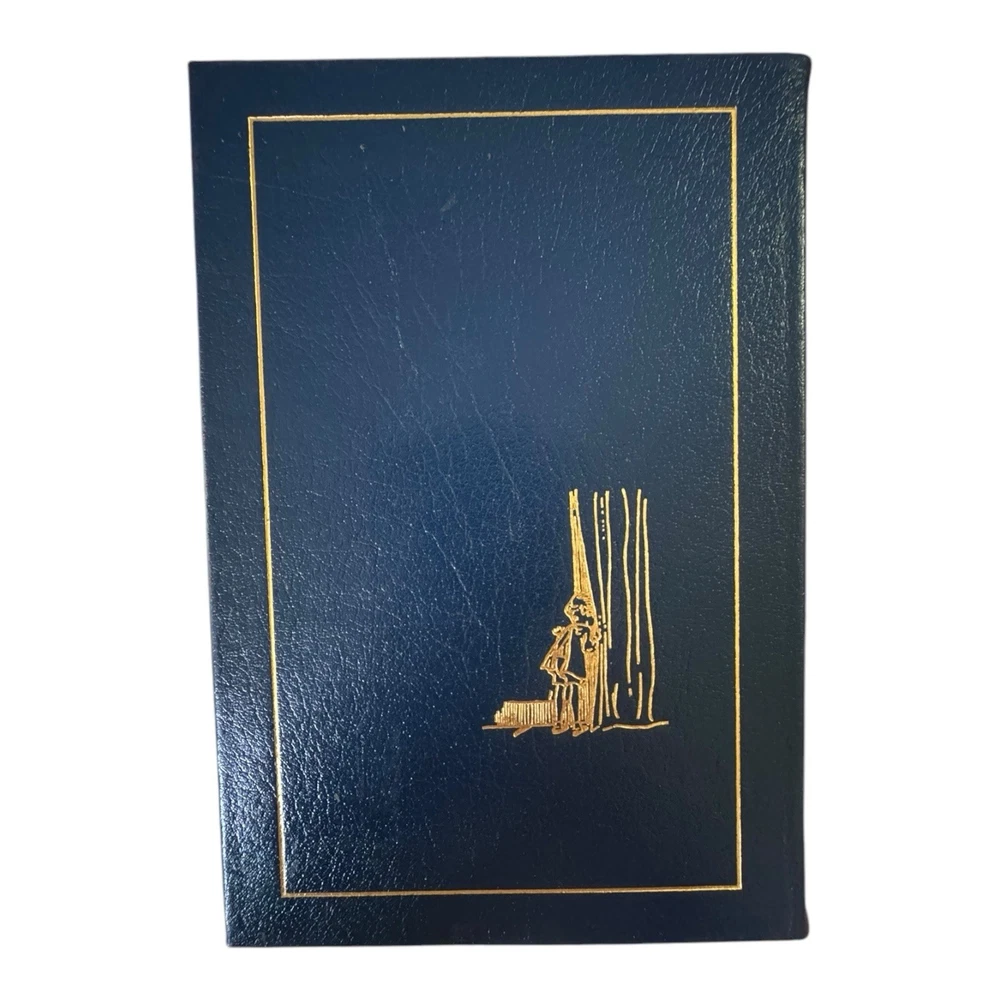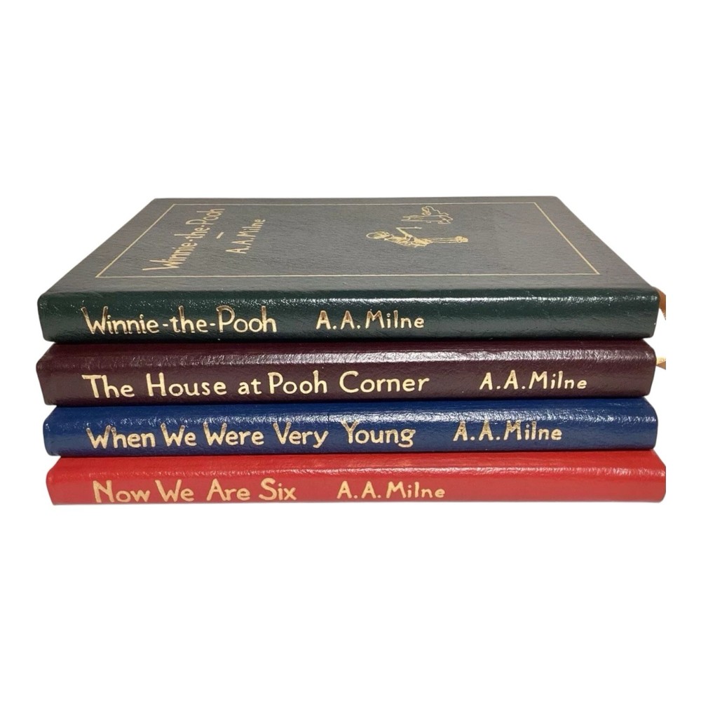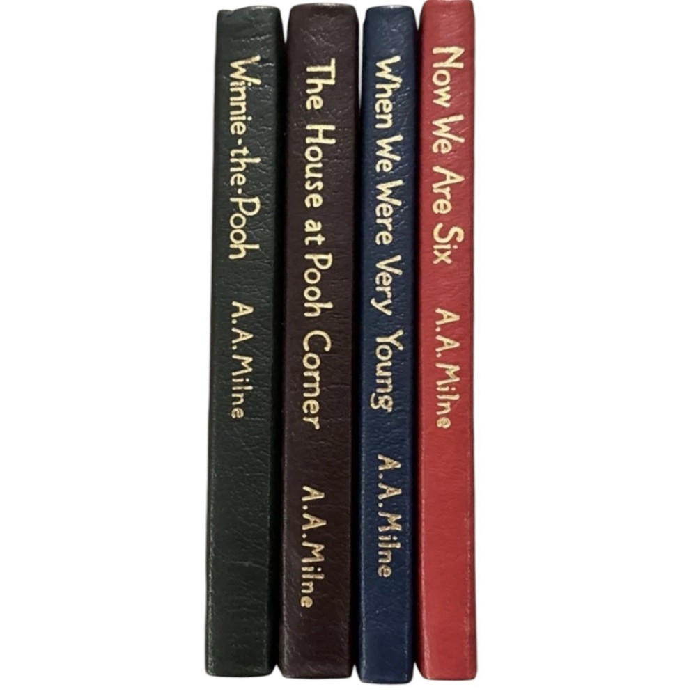 Delve into the whimsical world of A A Milne with this exquisite set of four Winnie the Pooh books, bound in rich leather and published by the renowned Easton Press in 1985. Two of the four books have a personalized nameplate, while the other two do not. Each volume is a testament to the timeless allure of Milne's storytelling, brought to life through the charming illustrations of Ernest Shepard, which add a layer of warmth and nostalgia to every page. These books are in excellent condition, but not in original seal. “Winnie-the-Pooh”, (green hardback) has a faint line of some sort on front cover. Not sure how; as these books have been properly stored for many years. (Please see pictures attached). These books are not merely reading material but collector's items, featuring the collector's edition status and adorned with special attributes that celebrate the literary legacy of the Winnie the Pooh series. Immerse yourself or gift a piece of classic children's literature that continues to captivate hearts across North America and beyond.