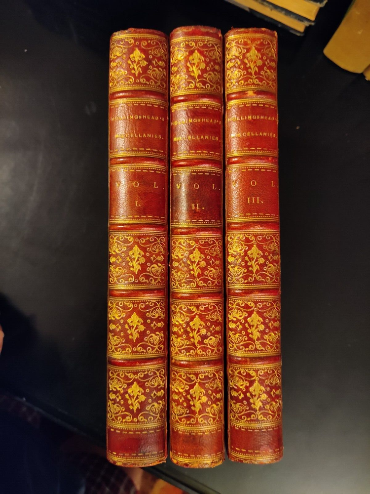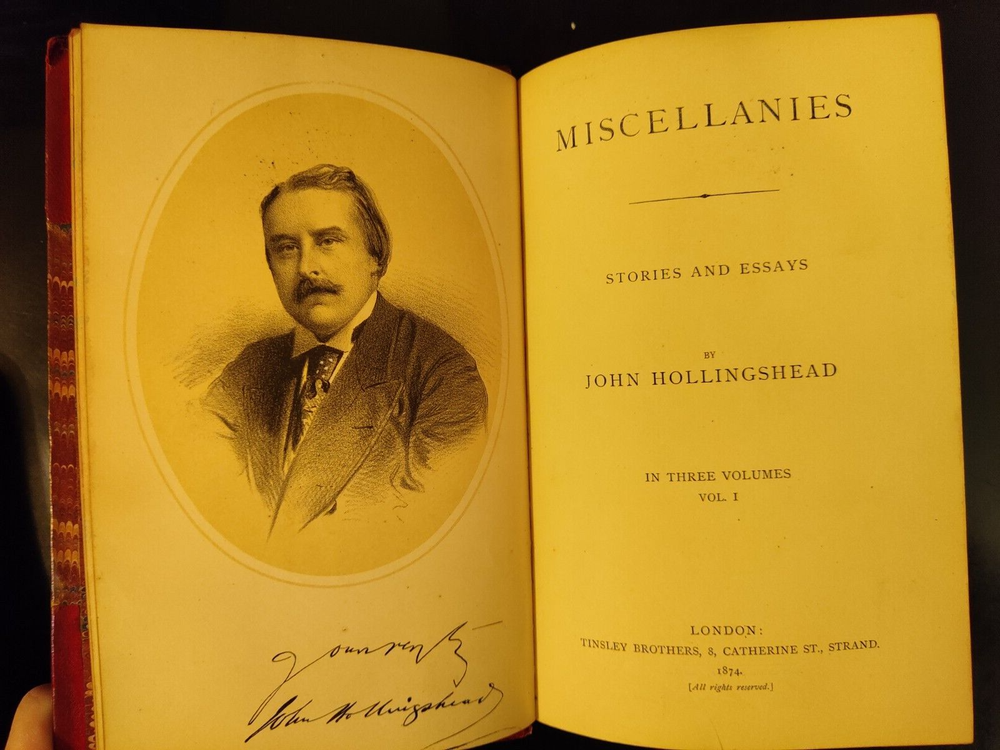 This auction is for a three-volume First Edition set of "Miscellanies" by John Hollingshead. Published in 1874. Leather with marbled boards, gilt lettering, marbled edges. Faults listed above, otherwise clean pages and good binding. Purchased at auction. Feel free to ask any questions. Good luck and thanks for bidding ! You can bid with confidence. I have been an eBay member in good standing since the 1990's, and continue to receive terrific feedback both as a buyer and a seller. I am not a professional dealer; just a regular guy who buys and sells stuff on eBay when I have something to sell or find something to buy. (B26) If you need more photos of an item please just ask.