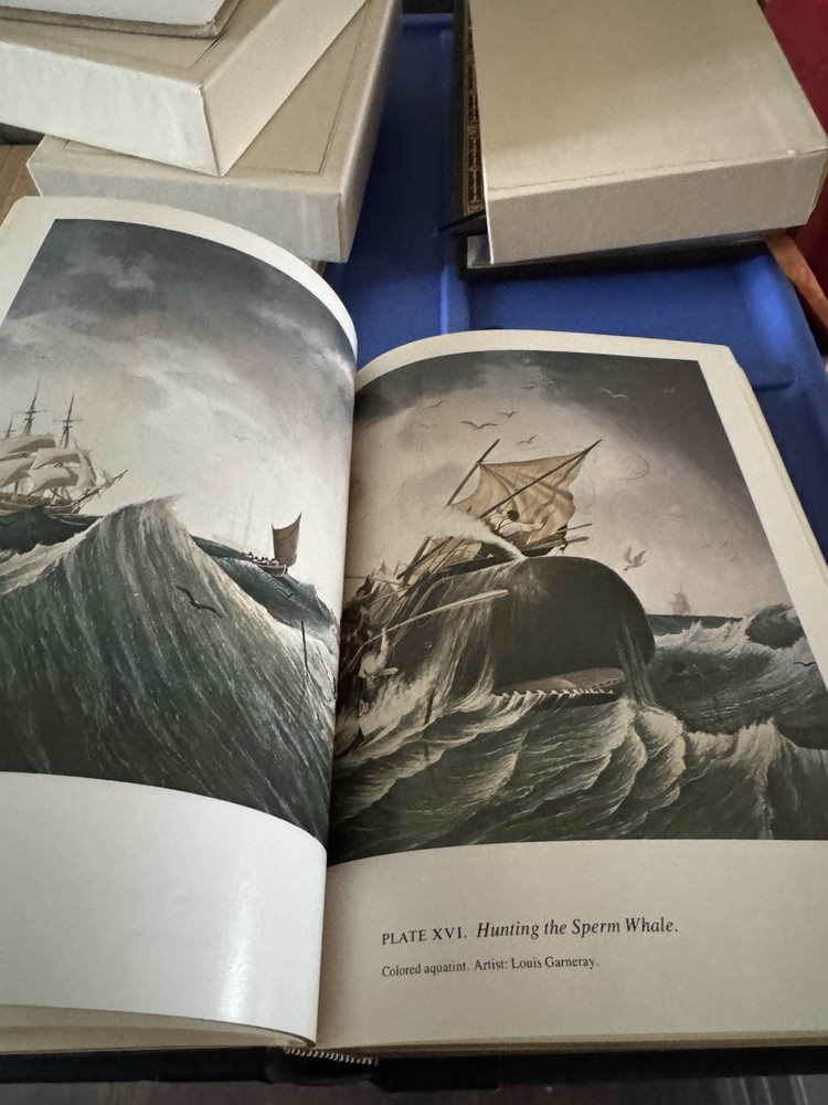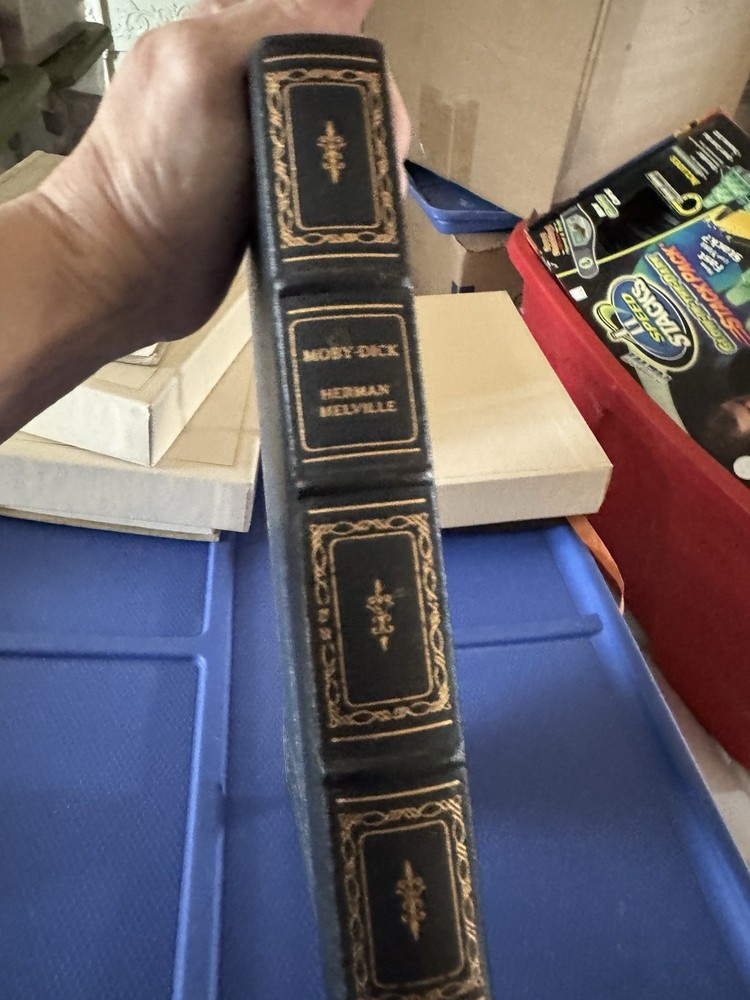 The product is a 1977 Easton Press leather-bound collector's edition of "Moby Dick" by Herman Melville. Published in Connecticut, this edition includes illustrations by Broadman Robinson and features gold edges. A valuable addition to any literature and fiction collection, this original printing in English showcases the classic tale of Captain Ahab's obsession and the dangers of revenge. A special piece for collectors and fans of Melville's works, this edition is a timeless and beautifully crafted book from North America.