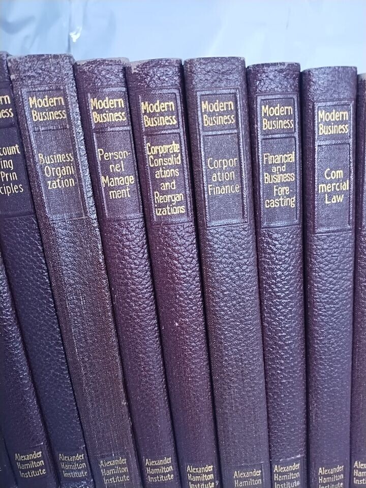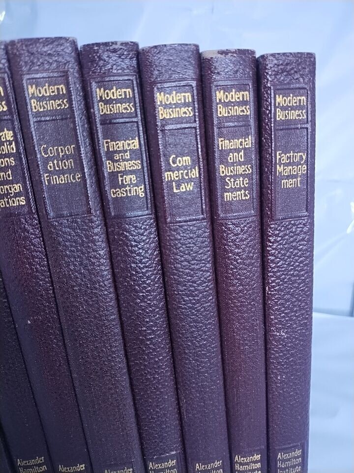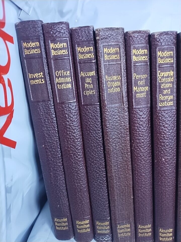 11 books of modern business from the Alexander Hamilton institute books include investments, office administration, accounting principles, business organization, personal management, corporate consolidations, corporation finance, financial business forecast, commercial law, financial business statements, and factory management if you have any questions please feel free to contact me.