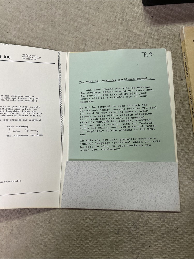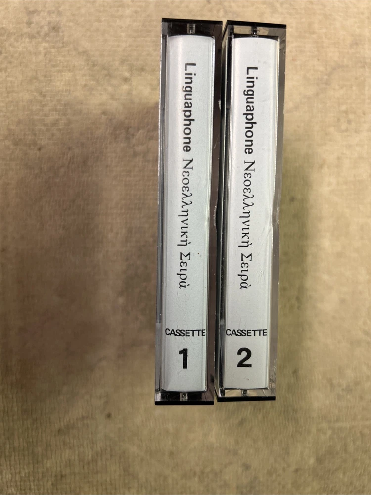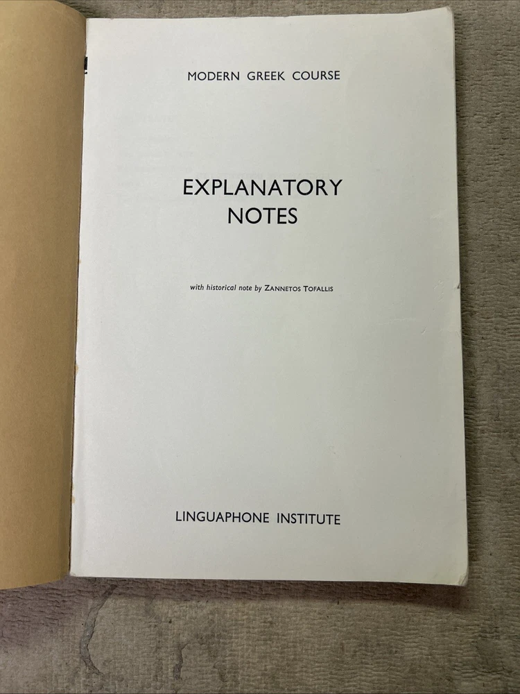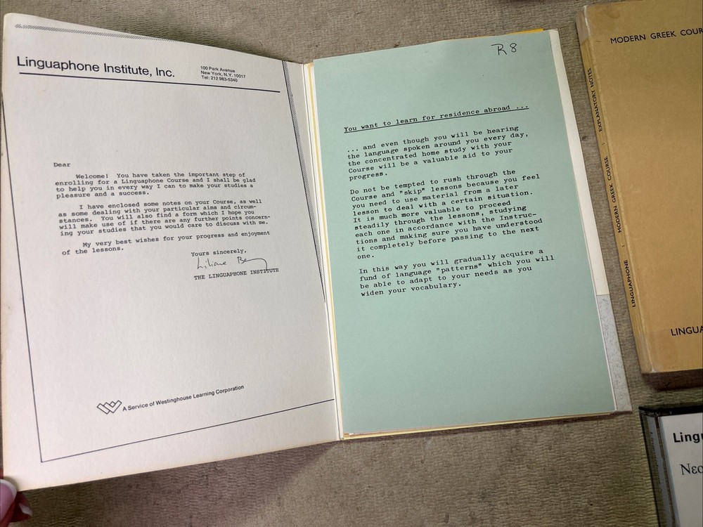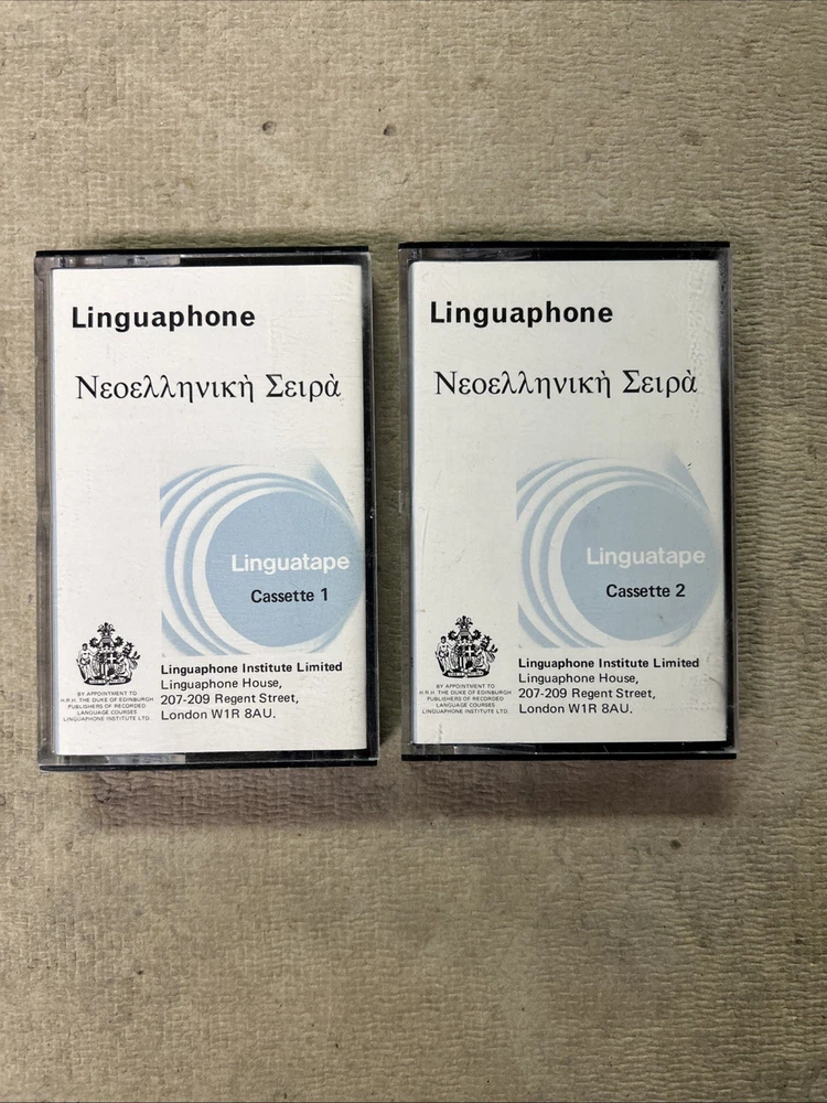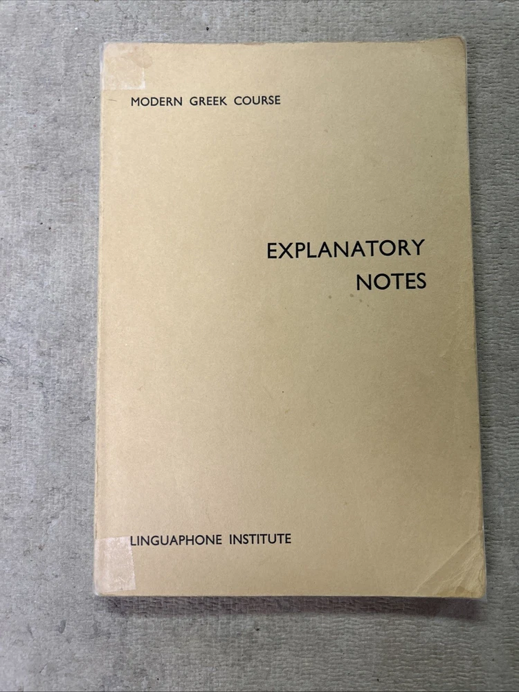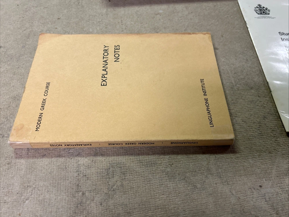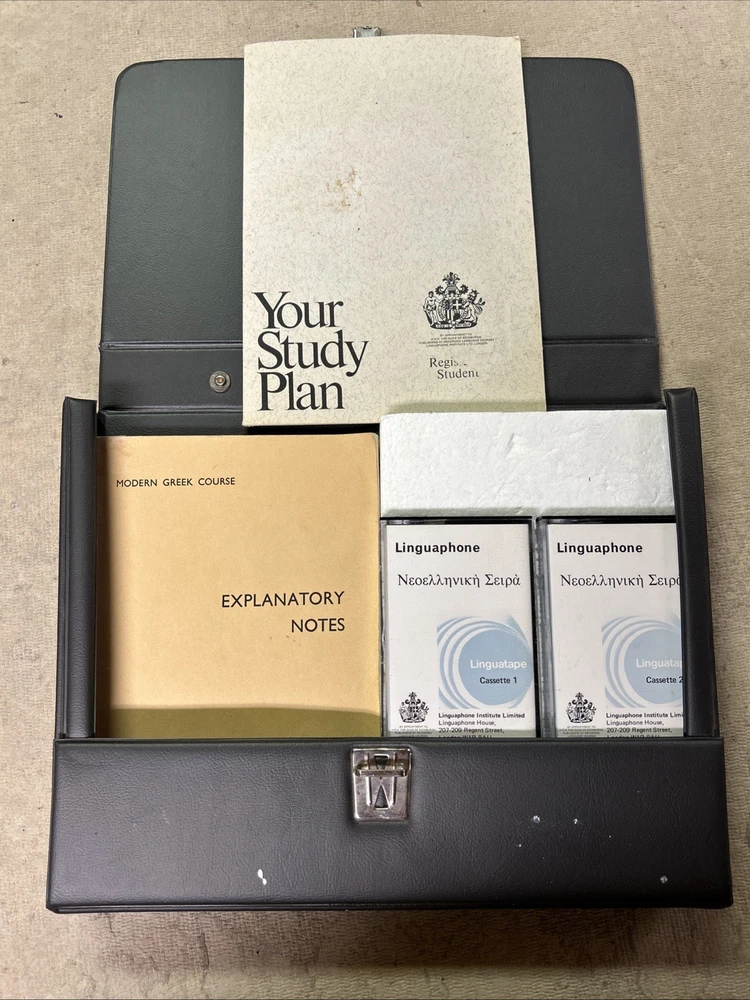 This is a complete set of materials for learning Modern Greek from The Linguaphone Institute, published in 1961. The set includes a faux leather bound book, two cassettes, and a trade paperback book. The book provides instructions and explanatory notes for students, and the cassettes allow for hands-on practice. This set is a great resource for those interested in learning Greek, and it was made in Great Britain. The dimensions of the items are 11" in length, 9" in width, and 1.5" in height.