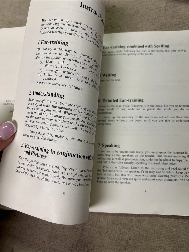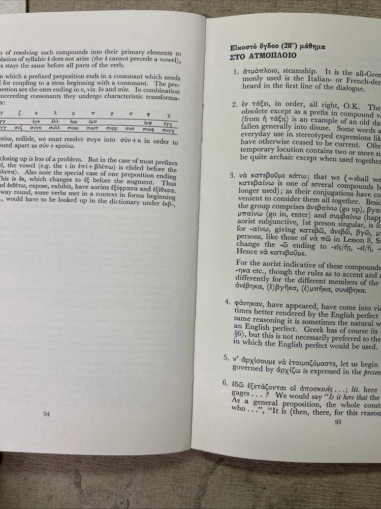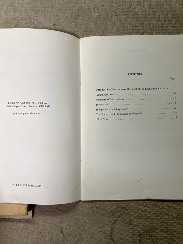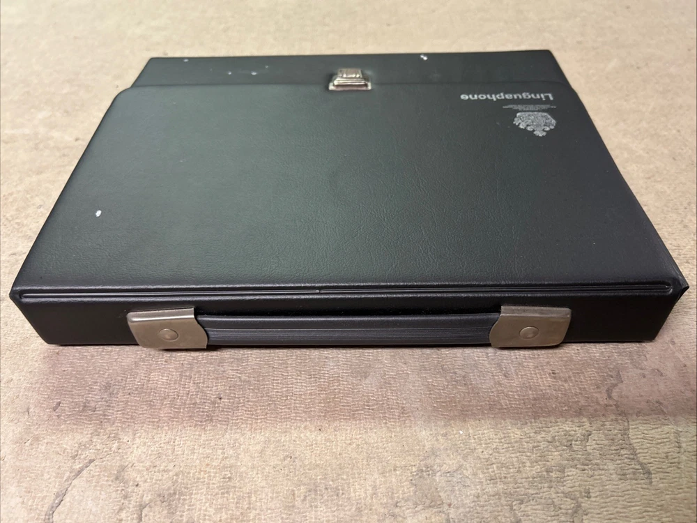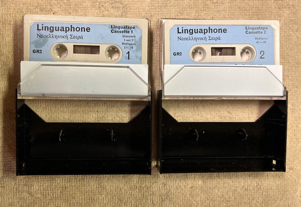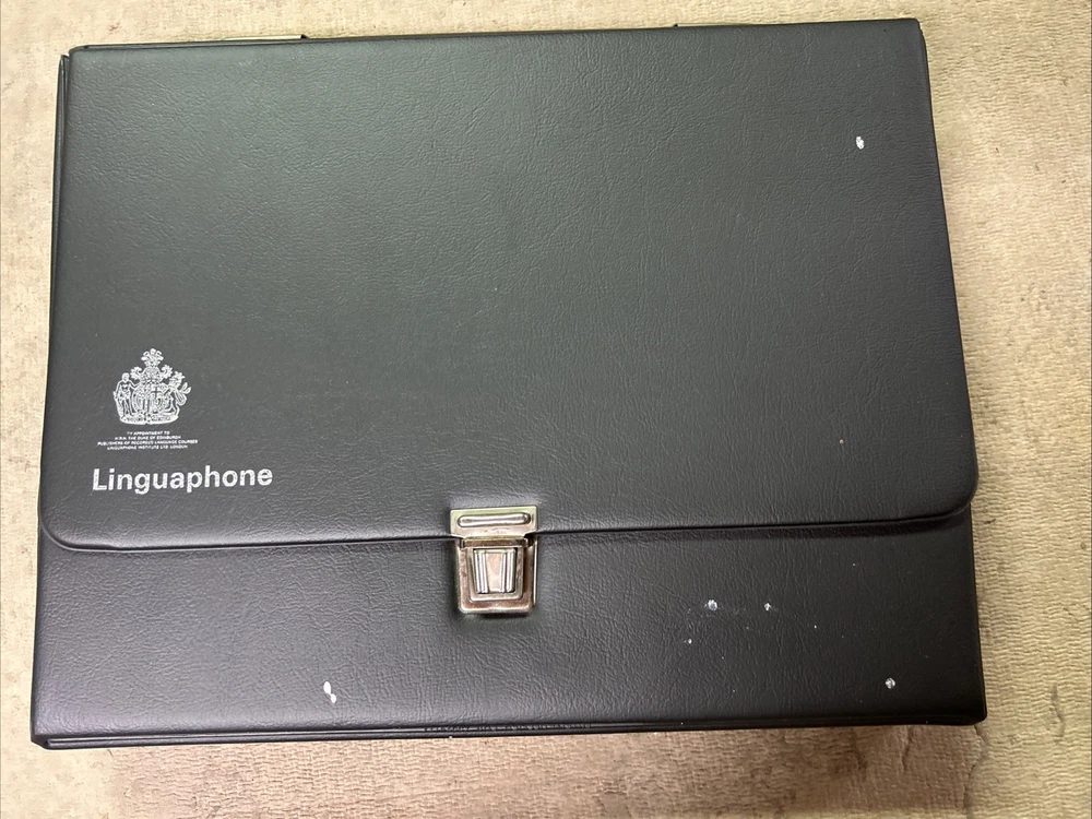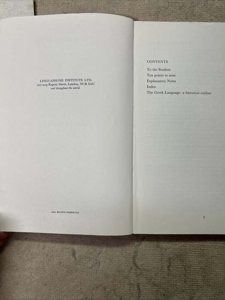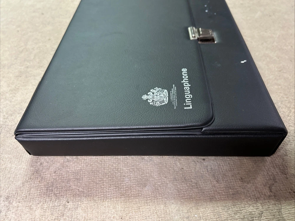 This is a complete set of materials for learning Modern Greek from The Linguaphone Institute, published in 1961. The set includes a faux leather bound book, two cassettes, and a trade paperback book. The book provides instructions and explanatory notes for students, and the cassettes allow for hands-on practice. This set is a great resource for those interested in learning Greek, and it was made in Great Britain. The dimensions of the items are 11" in length, 9" in width, and 1.5" in height.