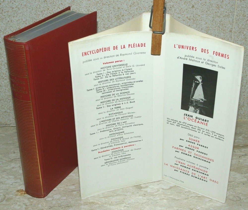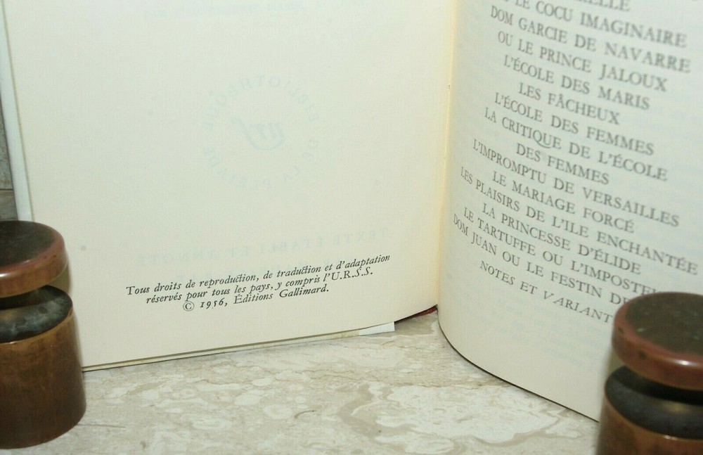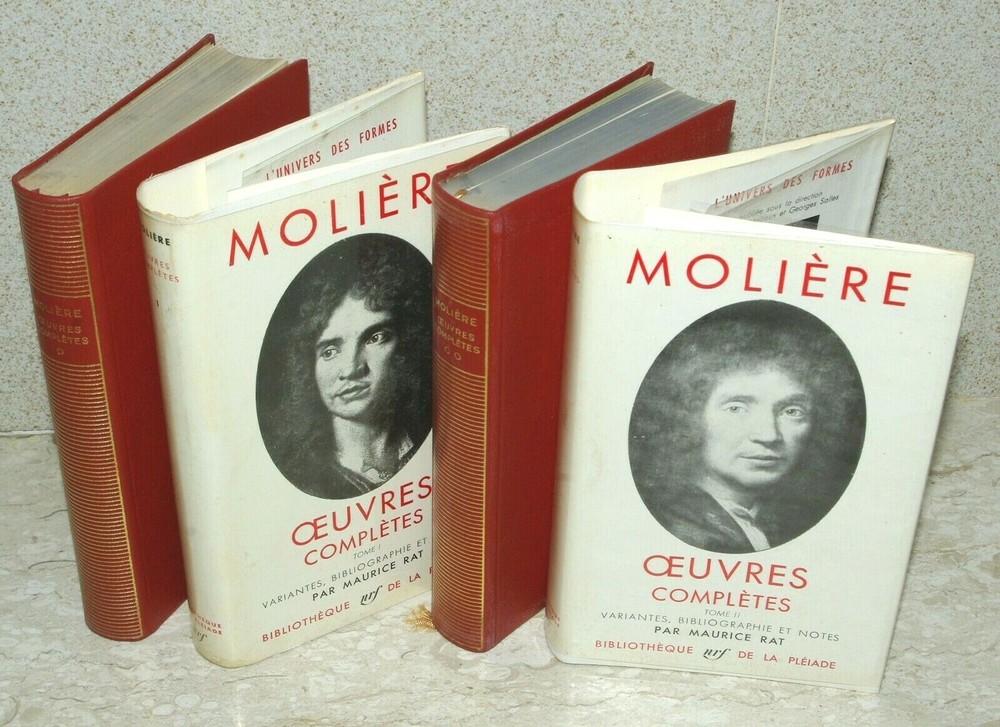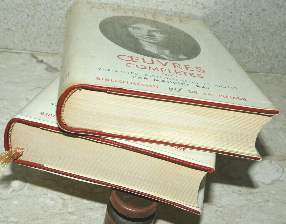 FRENCH TEXT ~ Both volumes of uncommon editions ~ generally as new 1956, flexiboards ; 2nd printings of the 1st editions thus " Moliere Oeuvres Completes I & II: Variantes, bibliographie et notes " par Maurice Rat Published in Paris by Bibliothèque de la Pléiade; Editions Gallimard . ; no stated SBN ; this the 2nd printing of the 1956 1st edition thus. No. d’edition(s): 8565 & 8.675. Depot legal: 2me trimester 1956. Imprime en France. lxv; 898 page & 1049 page, 8vos; 18cm. x 11.5cm.; total unpacked weight: 0.927kg . Perfect red grained faux-leather flexi-boards with crisp gilt titling to perfect uncreased spines; perfect joints and hinges; no bumps or shelf wear; tight square stitched and glued bindings with woven head and tail bands and double ribbon markers; perfectly regular clean text blocks, top edges tinted; clean text (India Paper), sharp page corners, no marking or marginalia; no foxing or discolouration; plain lime laid endpapers; not ex-library. Unread/unopened and generally as issued. The dustwrappers are in perfect condition and not faded, enclosed in original clear visene loose covers. Comes with the original light card slipcases which are split, repaired and edge rubbed and one with the top edge missing. Registered and trackable shipping is included in the price and therefore shown as FREE to any destination world-wide. . In wrapping and sealed customised high density expanded polystyrene encapsulation. Sent Priority Airmail registered and trackable. Delivery to UK & Europe (excepting Italy, Portugal & Spain ) is often effected within 9 days and in normal circumstances to major cities in the USA in around 14 working days . (UK mail sometimes 5 working days). This is coming to you from CYPRUS in the EASTERN MEDITERRANEAN - Some 6,0 00 miles distant from the USA Cyprus is a member of the E.U.
