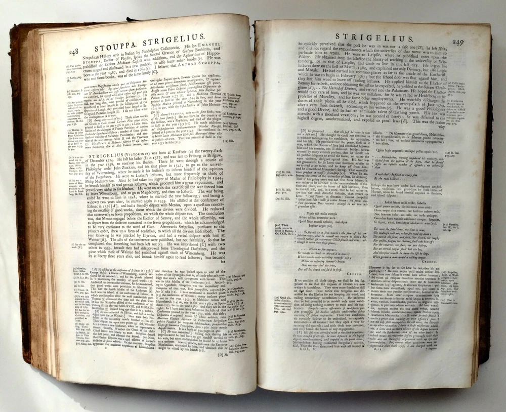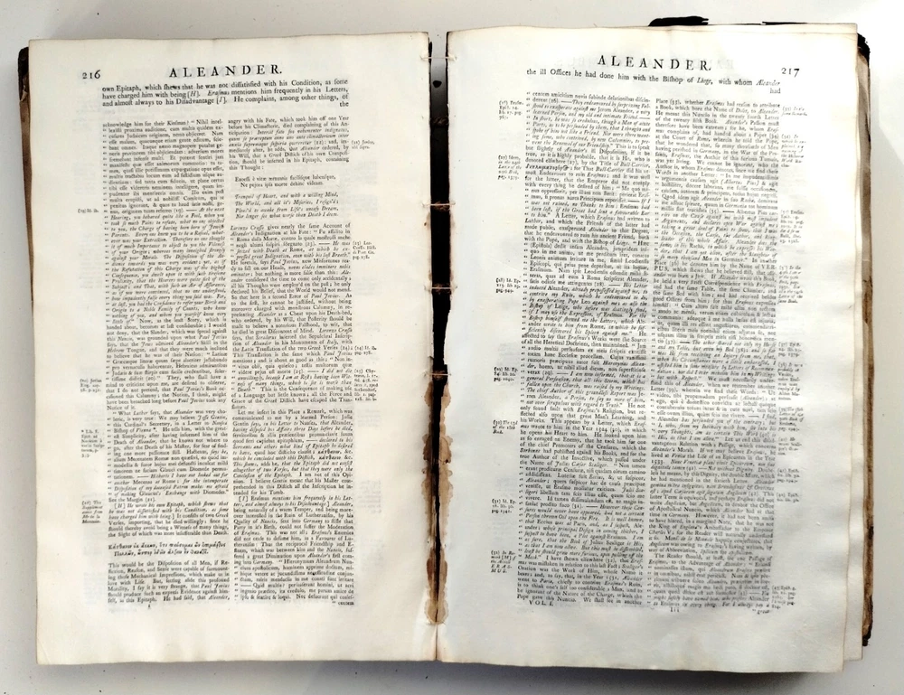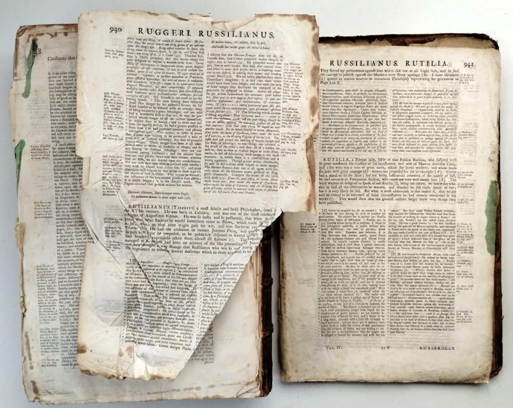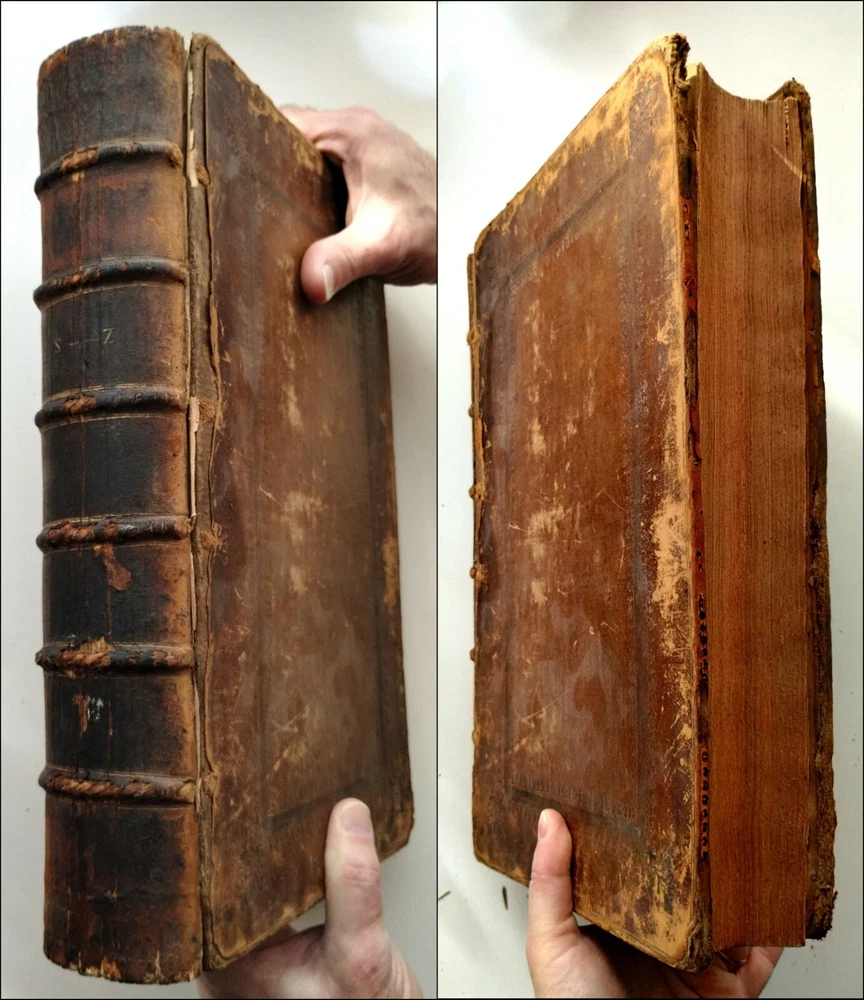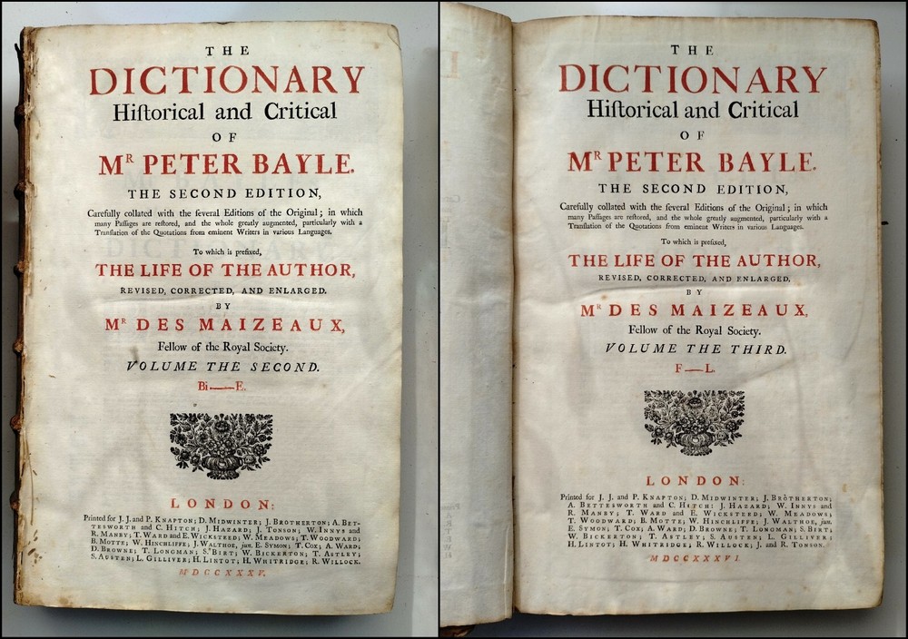 Mr. Bayle’s Historical & Critical Dictionary (2 nd English Edition) in 5 volumes in Fair condition with no dust jacket, bound in a hardcover with a size of 3 x 10 x 15 inches. Published during the years of 1734-1738 in London. Full title: “Mr. Bayle’s Historical and Critical Dictionary. The Second Edition, C arefully Collated with the Several Editions of the Original, in which Many Passages are Restored, and the Whole Greatly Augmented, Particularly with a Translation of the Quotations from Eminent Writers in Various Languages, to which is prefixed The Life of the Author, revised, corrected and enlarged, by Mr. Des Maizeaux, Fellow of the Royal Society”. Embossed leather covers with raised bands on spines; leather is worn and torn, revealing boards underneath. Covers and first and last few pages detached, one of the pages has a piece torn away; these first and last pages have chipped edges. Volume 4 is missing the cover; green paint visible on some pages and covers; (see pics). The interior pages are in good condition though the bindings are loose in some places. Volume One Published in 1734; V2 in 1735; V3 in 1736; V4 in 1737; V5 in 1738. Each volume states: "Printed for J.J. and P. Knapton; D. Midwinter; J. Brotherton; A. Bettesworth; C. Hitch; J. Hazard; J. Tonson; W. Innys; R. Manby; J. Osborne; T. Longman; T. Ward; E. Wicksteed; W. Meadows; T. Woodward; B. Motte; W. Hinchliffe; J. Wathoe, Jr.; E. Symon; T. Cox; A. Ward; D. Browne; S. Birt; W. Bickerton; T. Astley; S. Austen; L. Gilliver; H. Lintot; H. Whitridge; R. Willock." Seller will include insurance with the shipping service and a Signature will be required at delivery. Seller will have additional security features to enhance the peace of mind of both seller and buyer. We package with great care and ship quickly in cardboard. Discount when you buy multiple items in one order. Chris' Li'l Bookstore: serving satisfied customers since 2006. We sell books, music, records, CDs, DVDs and Audiobooks. (T3-291/95)