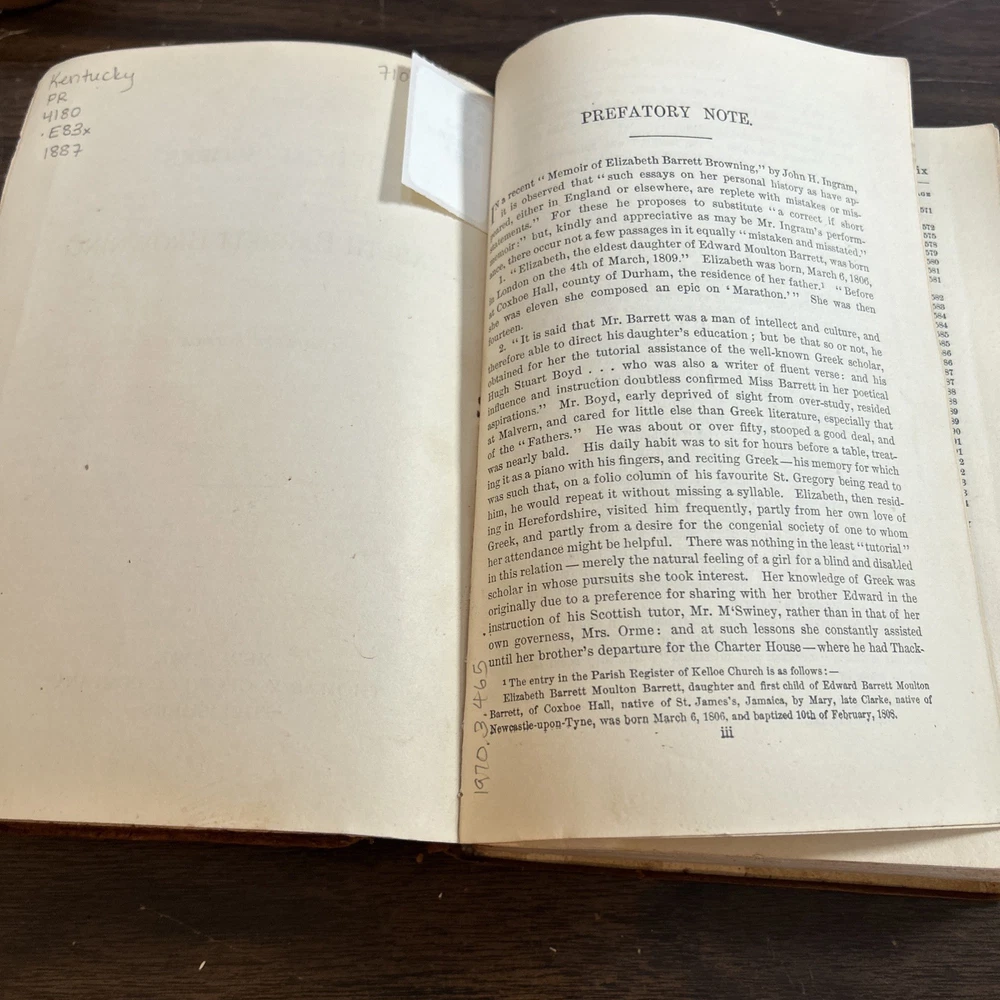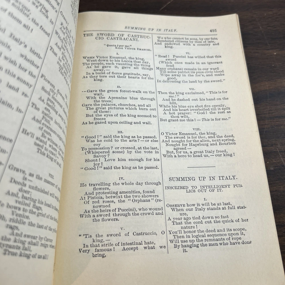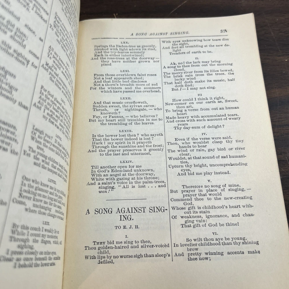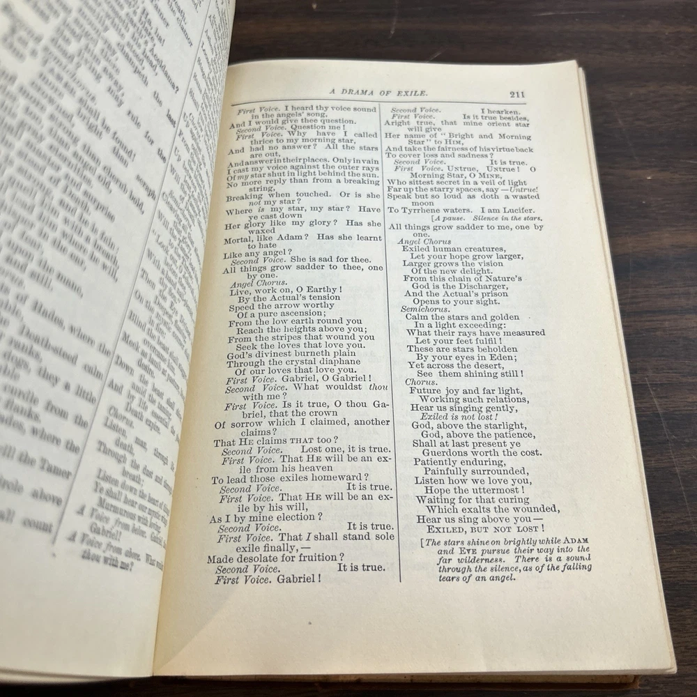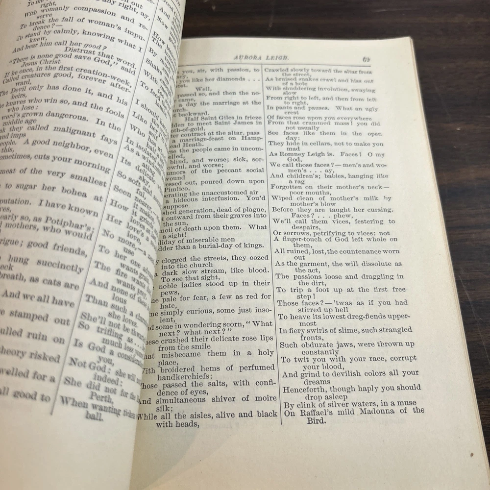 The "Mrs. Browning's Poetical Works Complete Edition (1887)" is a collectible book featuring the poems of Elizabeth Barrett Browning. This leather-bound edition was published in New York by Thomas Y. Crowell Co. in 1887, making it a valuable piece for any poetry enthusiast. With special attributes like being ex-library and a complete edition, this original work from North America is a treasure for those interested in the poetic works of Elizabeth Barrett Browning. The leather bound has a lot of diterearation.