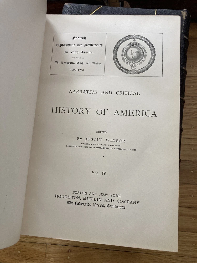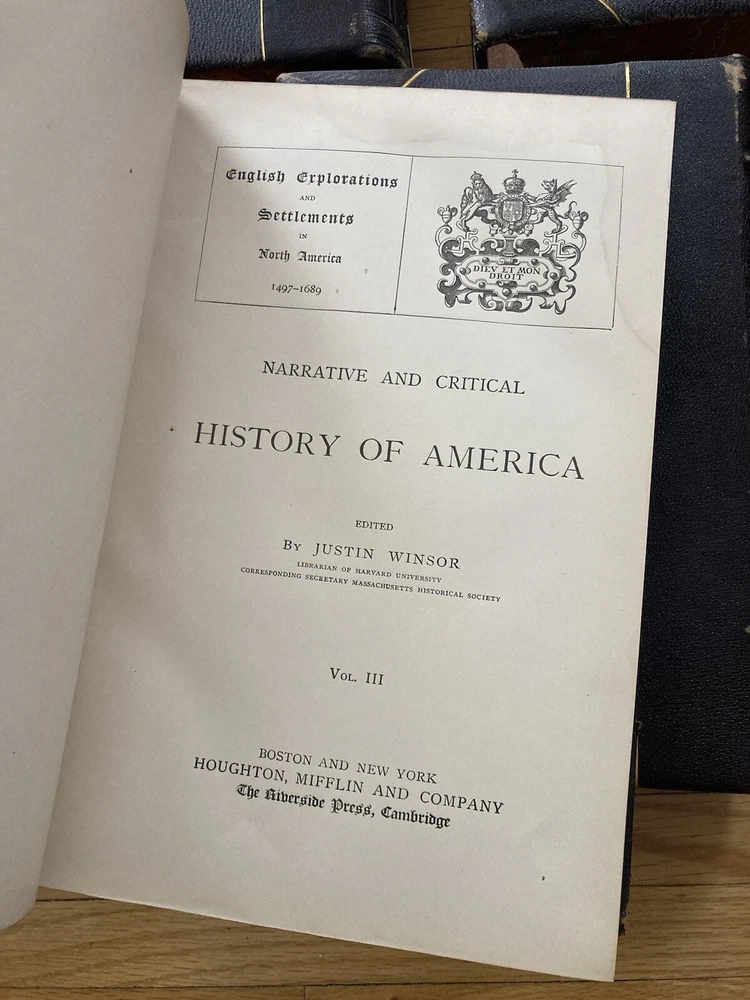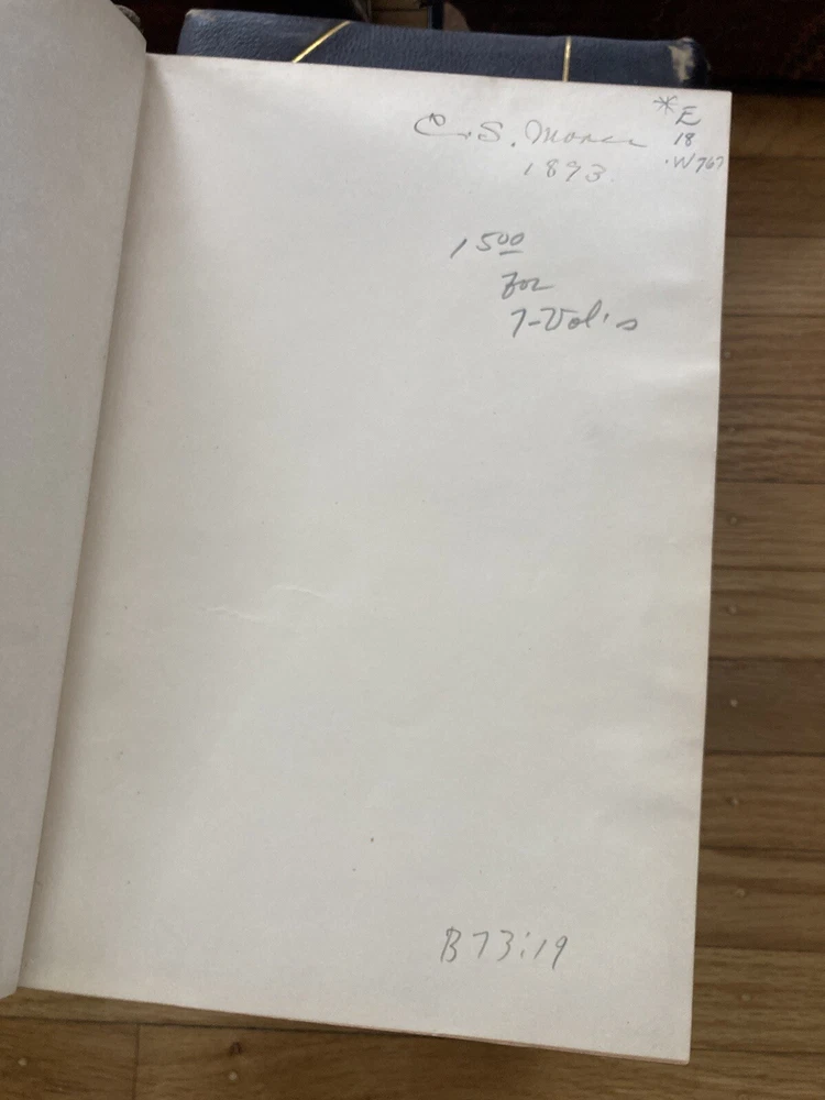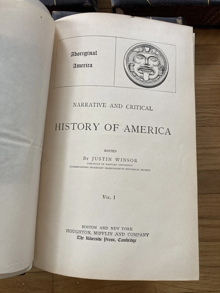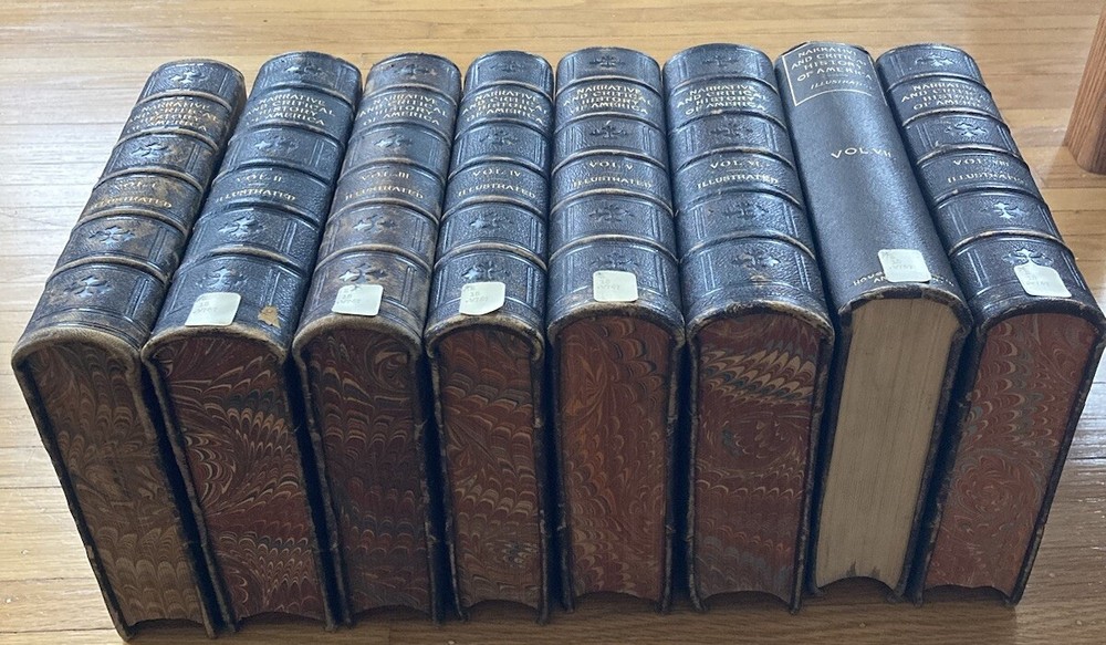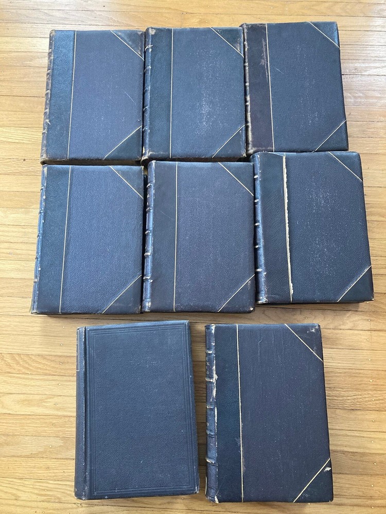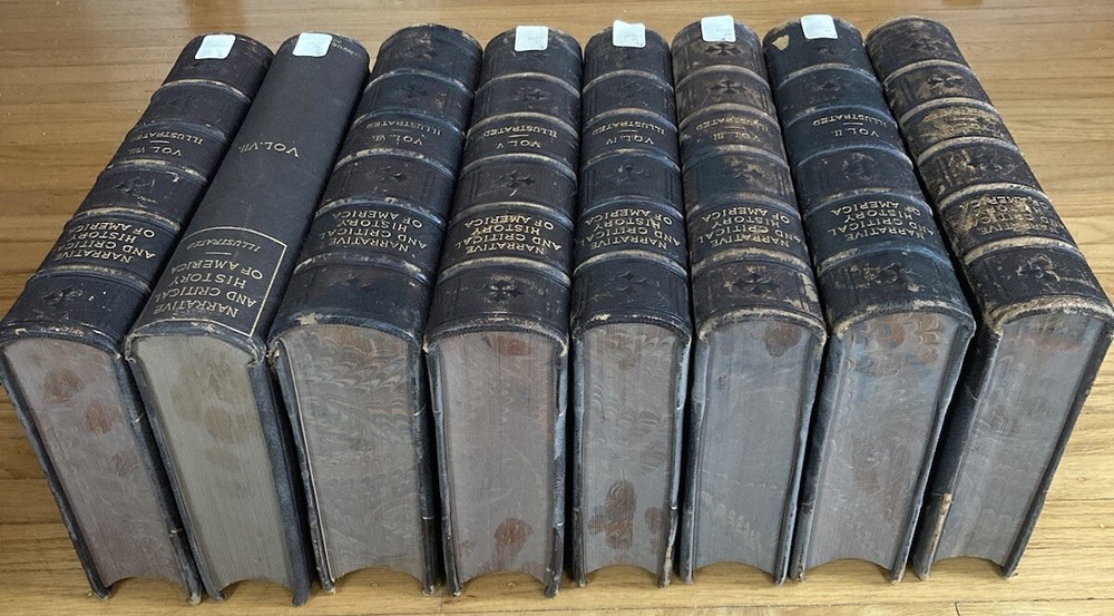 volume 1 is signed by winsor. The books are former library. There are stickers and stamping. Please see pictures. clean throughout. complete set of eight hardcover books bound in 3/4 brown leather with marbled boards and endpapers. The top edges are gilt and there are five raised bands on each spine Front cover on one volume has a slight flaw.