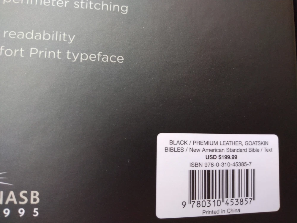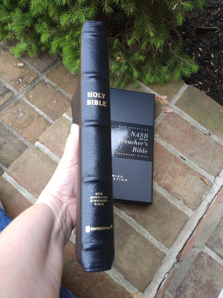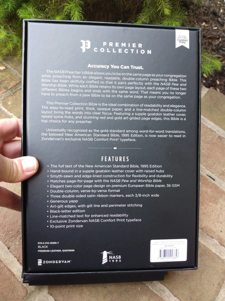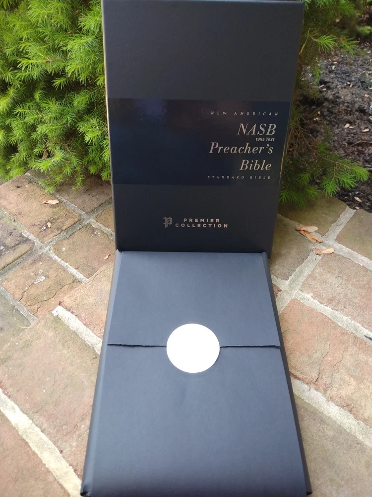 NASB full text 1995 Edition 10 point print/font size handbound supple goatskin leather cover with raised hubs (feels very soft) Smyth-sewn black letter edition for Christ's words Measures 9-5/8" x approx 7.25" x 1" approx. matches page for page with the NASB PEW and Worship Bible Elegant two-color page design on premium European Bible paper, 36 GSM Double column, verse-by-verse format 3 double-sided satin ribbon markers, each 3/8 inch wide Gernerous yapp art-gilt edges, with gilt line and perimetere stitching line-matched text for enhanced readability Exclusive Zondervan NASB Comfort Print typeface Feel free to ask questions. I try to return and answer your questions in a timely manner and as soon as I am able. Visit my eBay store at aboundingjoy66 NO RETURNS. Please buy responsibly.