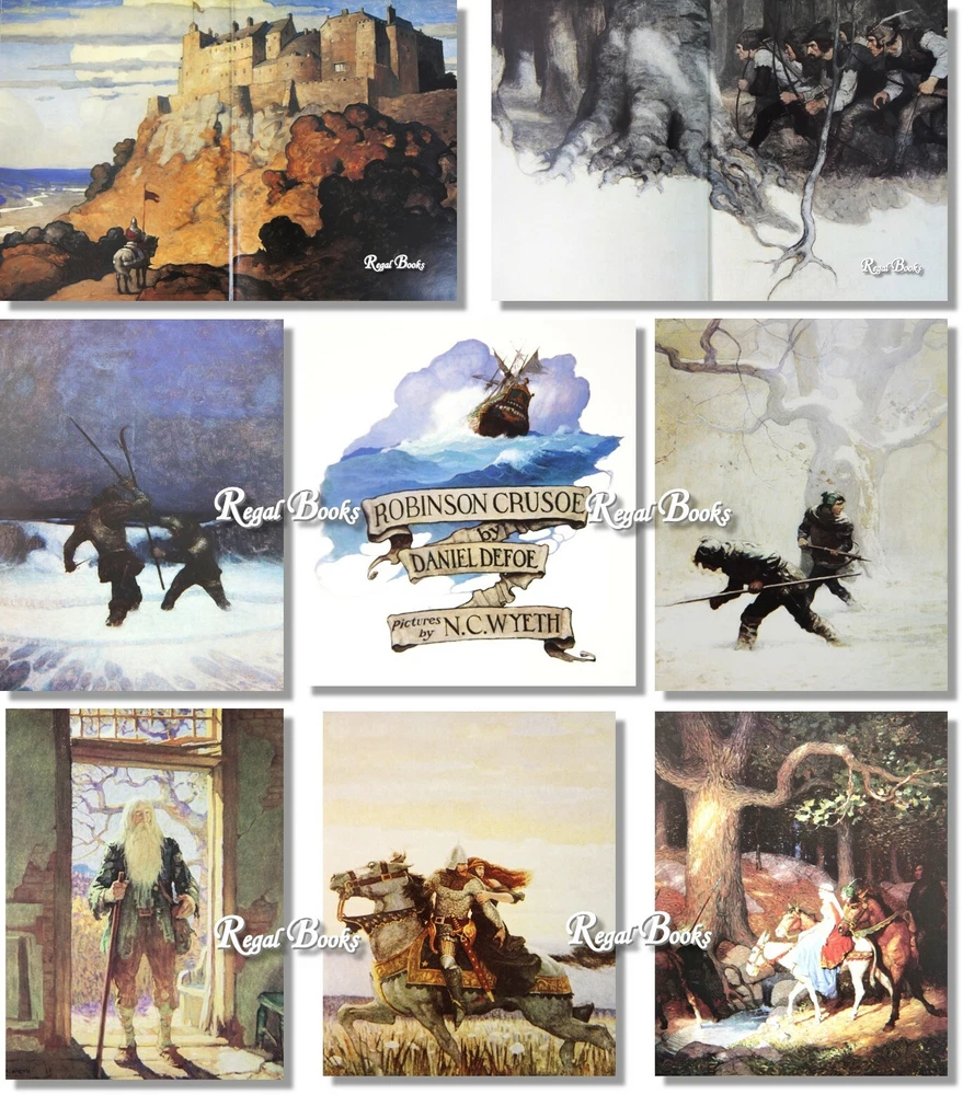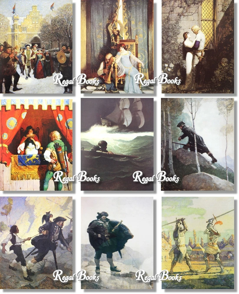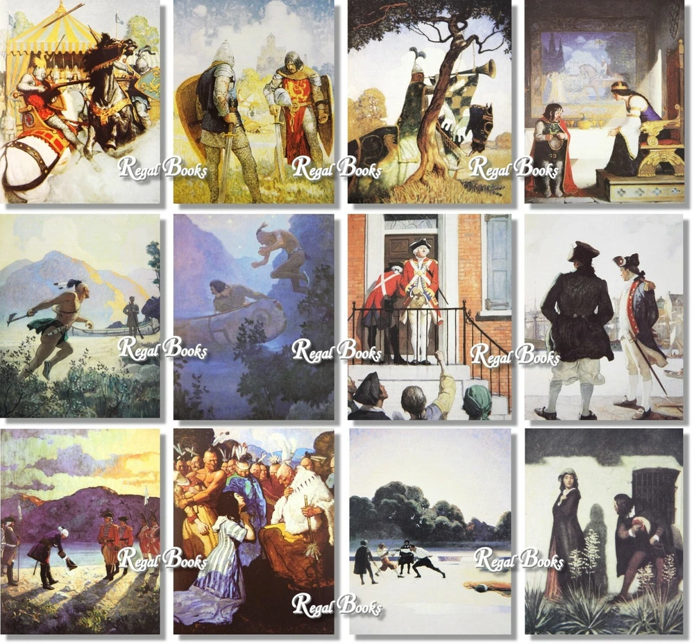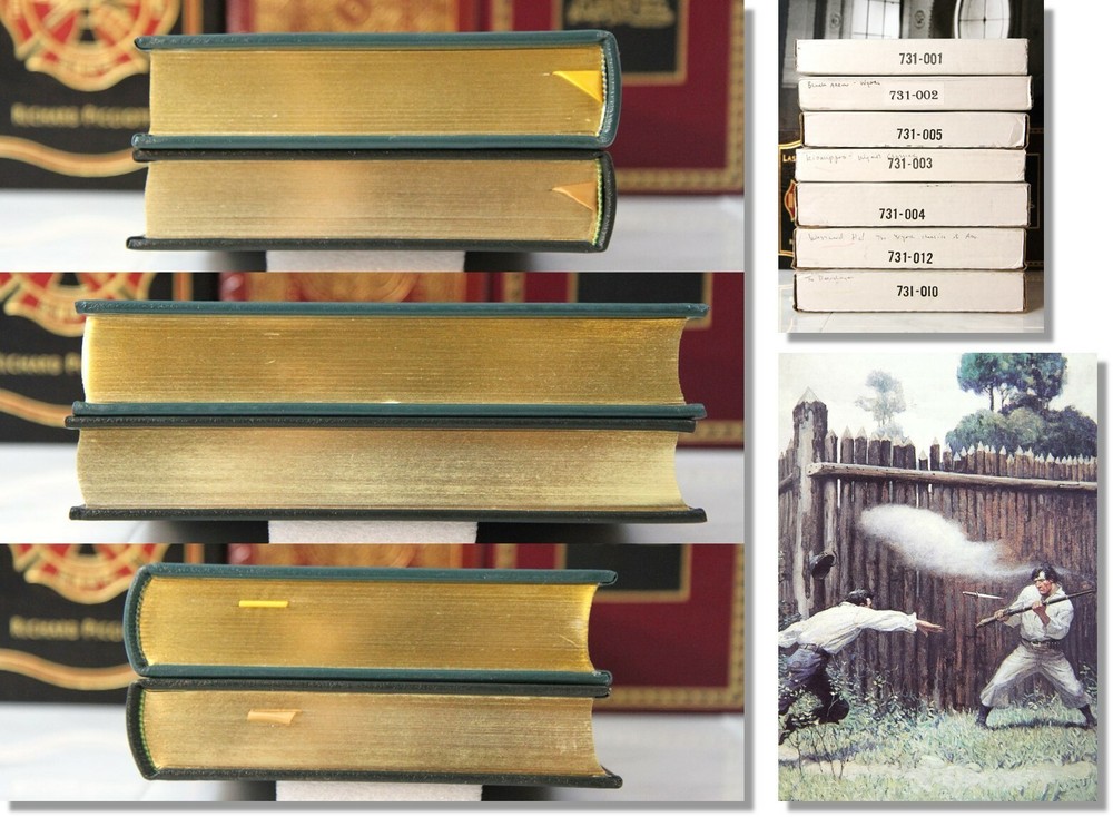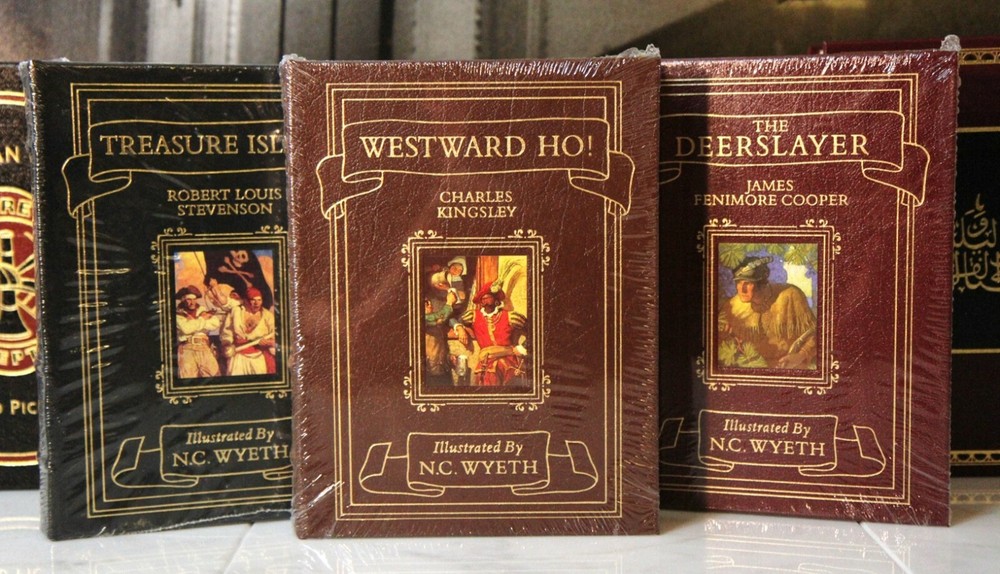 ***Copy of photos, personal formats, graphics, or text is prohibited . Ebay may drop listings with infractions. I review content regularly. N. C. Wyeth Illustrated Adventure Classics series Complete 14 Volume Set See title list below Author: Illustrations by NC Wyeth Description : One of the top 5 rare collecting jewels of Easton Press sets. There are a few more on the market right now due to a lot of book dumping as people retire and downsize. Normally you would see this set at auction less than once a year at times. -- N.C. Wyeth is perhaps the greatest adventure illustrator of all time, and one of the greatest of any genre to have graced the pages of books. This highly sought after set is stunning both for the beautiful covers with gold detail framing inset paintings, and the artwork of the incomparable Wyeth. This complete set is a selection of Wyeth's most renowned works of illustration, and some of the greatest adventure literary works in history. Sail with the pirates of Robert Luis Stevenson in Treasure Island, the privateers in Kingsley's Westward Ho!; savor the early adventure of the new world in Mohicans or Deerslayer; or ride with the knights of King Arthur and White Company. There is a reason this is one of the most treasured sets issued by Easton Press. They did offer smaller sized sets and occasionally the covers and spines varied slightly. You will see this set is entirely correct with the appropriate matching covers and NC Wyeth on the spine (not all smaller iterations had them). EXTREMELY rare to get nearly all in the set sealed, let alone with the boxes. I have not seen a set in this condition on Ebay in the last 15 years of dealing books. I pulled the Boy's King Arthur (sealed) from my own library just to get you most of the really rare ones. If I had Scottish Chiefs in the plastic I would have done that for you too because this is so rare. All the really hard to collect ones are sealed save SC. Obviously this is a valuable set not for the bargain hunter, and from a reputable dealer. Please and kindly no unsolicited offers. TITLE LIST: Robin Hood, Black Arrow, Kidnapped, Treasure Island, Mysterious Island, The Deerslayer, Last of the Mohicans, Robinson Crusoe, Drums, Westward Ho!, The White Company, The Scottish Chiefs, Boy's King Arthur, Rip Van Winkle. Condition : 7 (half) are sealed in original plastic and with original boxes. 5 more are sealed in original plastic but not with box. Only two (Robinson Crusoe, Scottish Chiefs) are out of the plastic! Open books: Leather is bright with little sign of any shelf wear. Little marr to gilt page ends save light scuff on outer bottom page ends where they touch when they are pulled off the shelf. See bottom left section of photo 3. ***Stock photos of illustrations are from an open set I sold recently. This Fine Leather Book Features: Top grade, gold embossed/ornamented leather Gilded page ends to protect against dust and moisture Decorative end papers Acid neutral archival paper to last generations